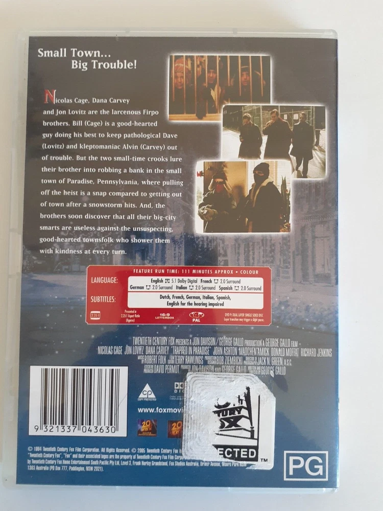 Rating: PG Movie/TV Title: Trapped In Paradise Language: English UPC: Does not apply gtin13: Does not apply Region Code: DVD: 4 (AU, NZ, Latin America...) Format: DVD Type: Movie Seller Notes: “dvd is in good used condition. Please see photos and item description”
