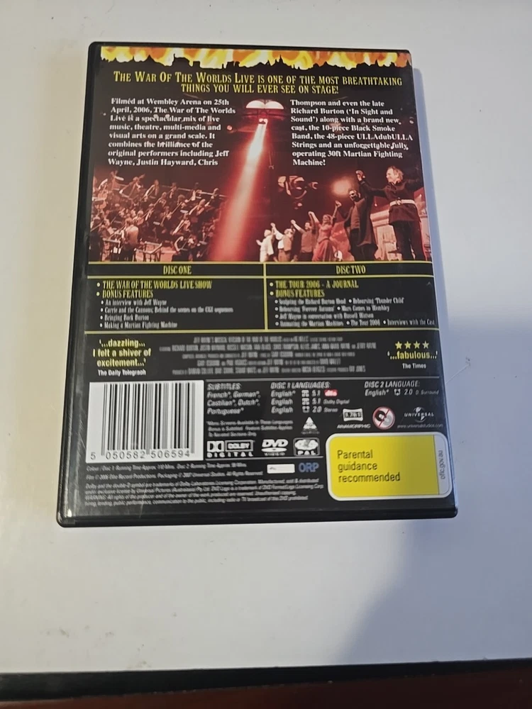 Experience the epic musical adaptation of H.G. Wells' sci-fi classic with "War Of The Worlds Live on Stage" DVD. Directed by David Mallet, this Special Edition features a captivating performance by a talented cast including Damian Collier, Russell Watson, and Justin Hayward. The DVD, in PAL format, offers a thrilling 60-minute journey through a world invaded by aliens, blending elements of action, adventure, and Broadway musicals. Immerse yourself in the unforgettable music and visuals of this 2006 production, perfect for fans of Sci-Fi & Fantasy and musical theatre enthusiasts in Australia and beyond.