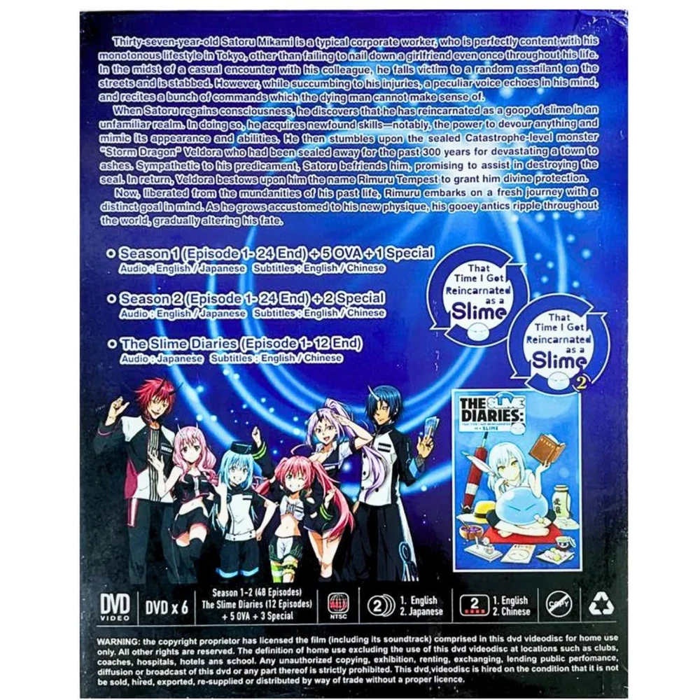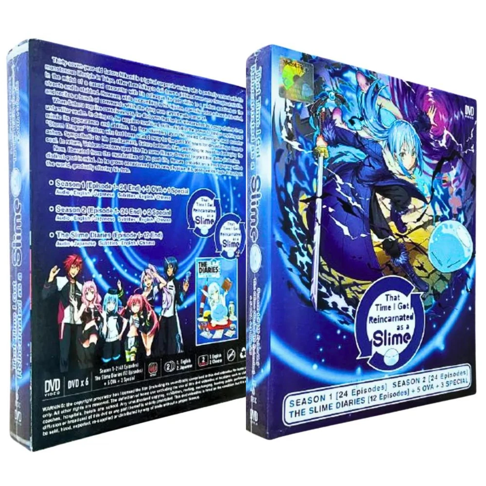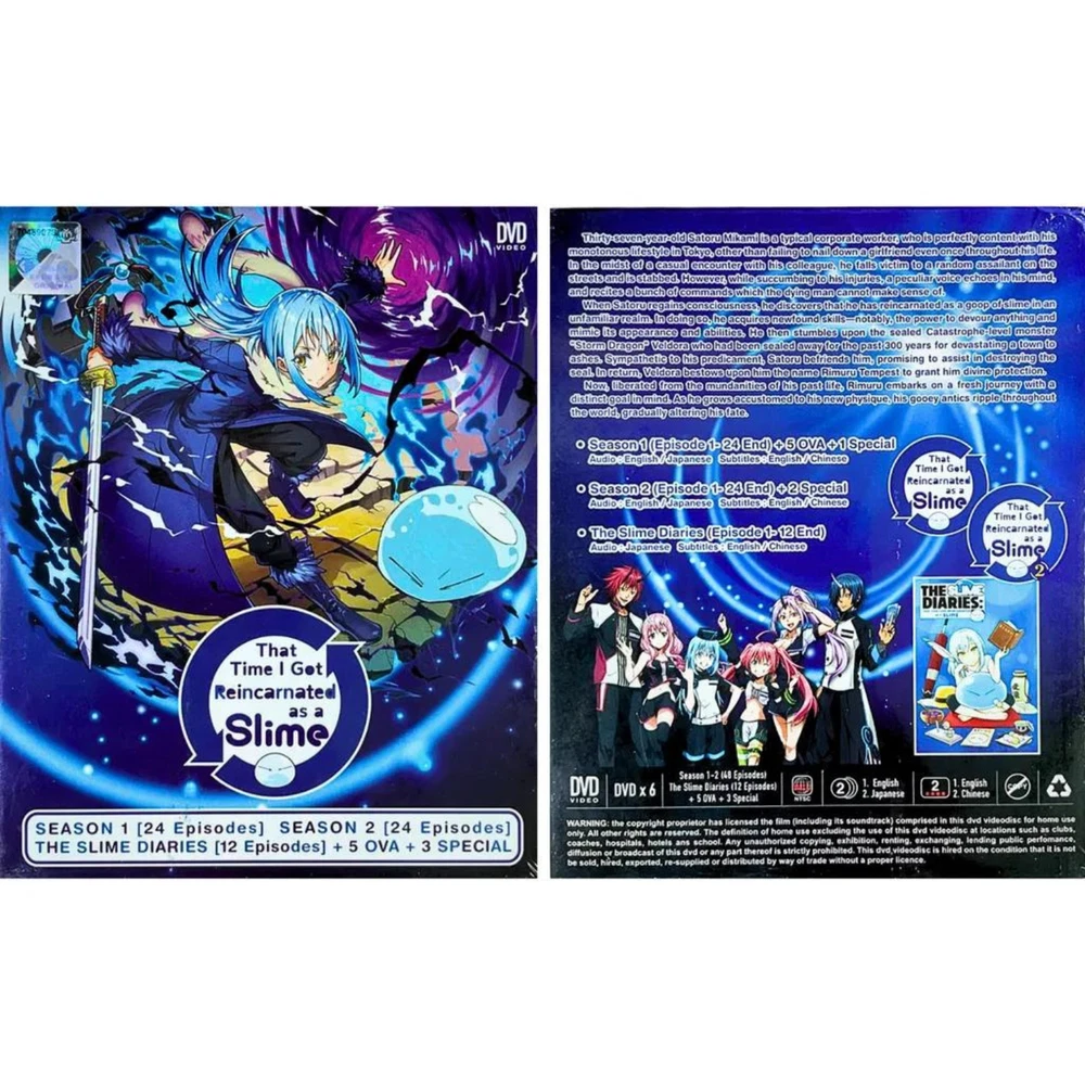 DVD That Time I Got Reincarnated As A Slime/ Tensei shitara Slime Datta Ken Season 1&2 + Diaries + 5 OVA + 3 Special ~ English Dubbed All Region Synopsis: Thirty-seven-year-old Satoru Mikami is a typical corporate worker, who is perfectly content with his monotonous lifestyle in Tokyo, other than failing to nail down a girlfriend even once throughout his life. In the midst of a casual encounter with his colleague, he falls victim to a random assailant on the streets and is stabbed. However, while succumbing to his injuries, a peculiar voice echoes in his mind, and recites a bunch of commands which the dying man cannot make sense of. When Satoru regains consciousness, he discovers that he has reincarnated as a goop of slime in an unfamiliar realm. In doing so, he acquires newfound skills—notably, the power to devour anything and mimic its appearance and abilities. He then stumbles upon the sealed Catastrophe-level monster "Storm Dragon" Veldora who had been sealed away for the past 300 years for devastating a town to ashes. Sympathetic to his predicament, Satoru befriends him, promising to assist in destroying the seal. In return, Veldora bestows upon him the name Rimuru Tempest to grant him divine protection. Now, liberated from the mundanities of his past life, Rimuru embarks on a fresh journey with a distinct goal in mind. As he grows accustomed to his new physique, his gooey antics ripple throughout the world, gradually altering his fate. Features and further details TITLE: That Time I Got Reincarnated As a Slime [Season 1+2+Slime Diaries+ 5OVA + 3 Special] Tensei shitara Slime Datta Ken 転生したらスライムだった件 Description : No of Disc : 6 Discs Version : English / Japanese Subtitles : English / Chinese Format : DVD / NTSC & All Region Code (16:9) Weight : 270g Genres: Action , Adventure , Comedy , Fantasy Themes: Isekai , Reincarnation Contact us We can be contacted at any time through eBay messages if you have any questions, comments or product requests. We will respond to you within 24 hours and do our best to help you out! We encourage our customers to contact us with any questions or concerns! We'd like to be sure you are completely satisfied with your purchase. Payment We accept payment via eBay - managed payment Shipping We are using standard international shipping. Handling time is 1-3 business working days. Your goods will be shipped with valid tracking number. All products is packed , layered with bubble wrap to reduce damages during shipment delivery. Estimate delivery is between 11 to 23 business working days. We also provide express shipping as an option. Estimated delivery is between 5 to 8 business days. **Rest assured we will ensure your package arrives as soon as possible. However, the delivery may be delayed due to some unforeseen circumstances which is out of our control, such as bad weather, high postal traffic and the performance of shipping companies. Return If you have any problem with the order, do contact us via eBay message, we will be glad to assist you and resolve your problems as soon as possible. Items can be returned within 30 days in good condition. Note: Import duties, taxes and additional charges are not included in item price or shipping charges. Please be aware these custom import duties and taxes are buyer's responsibility. Free eBay listing template designed by © dewiso.com .
