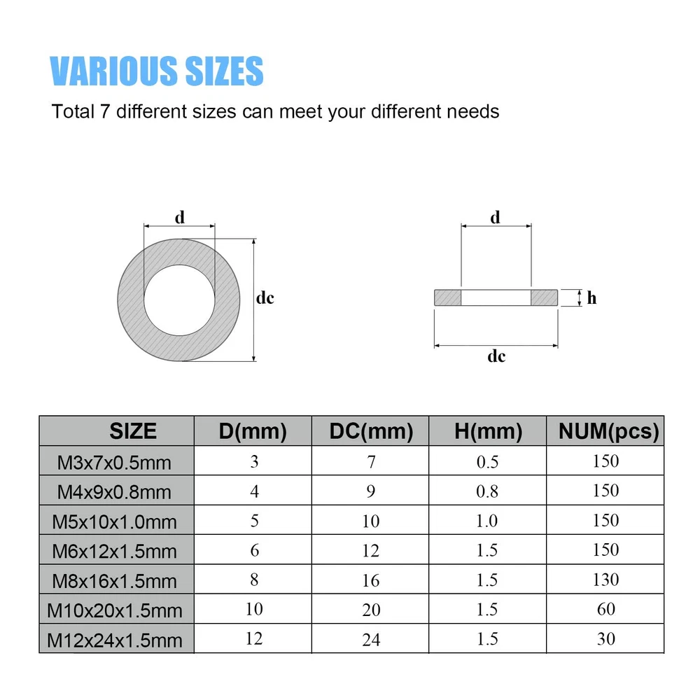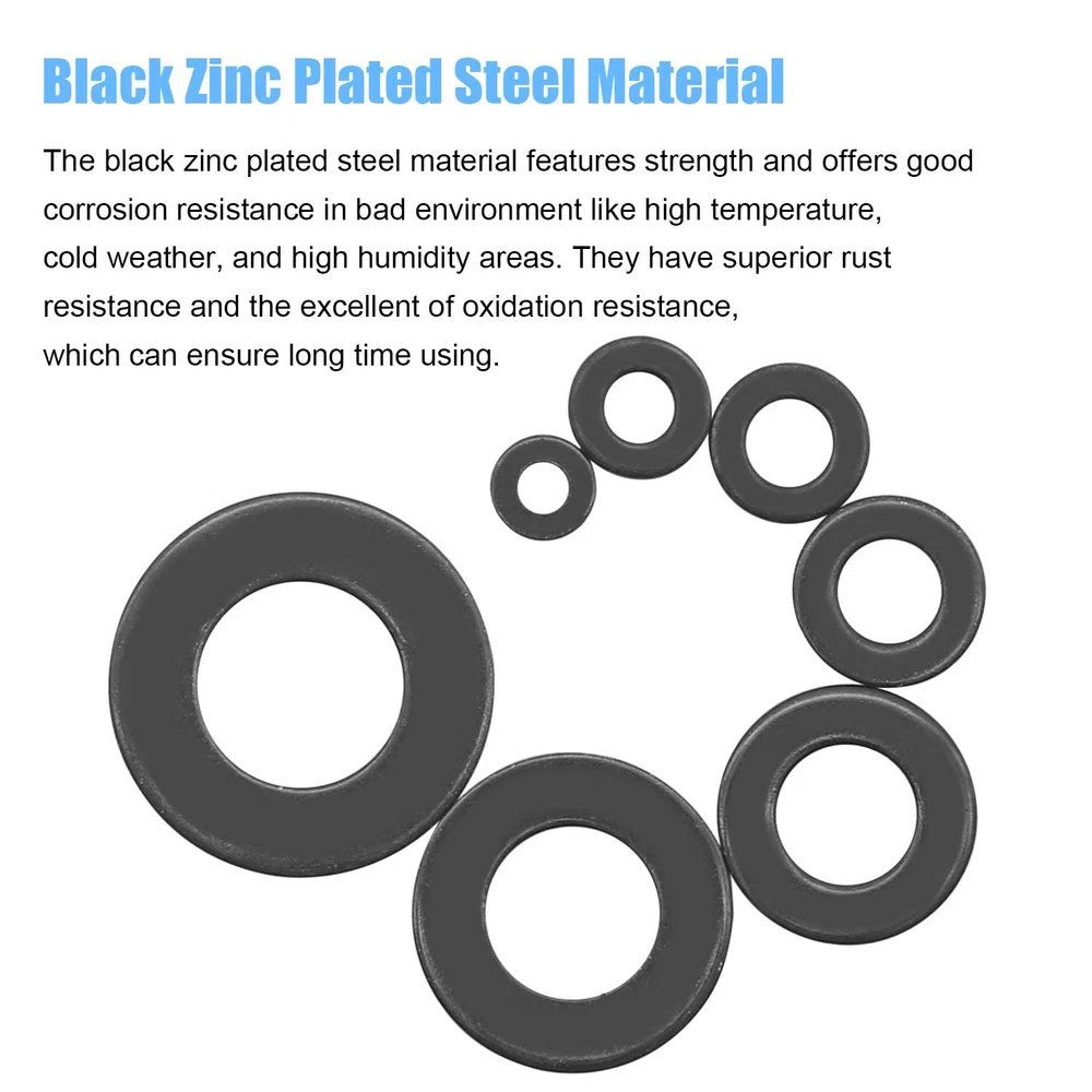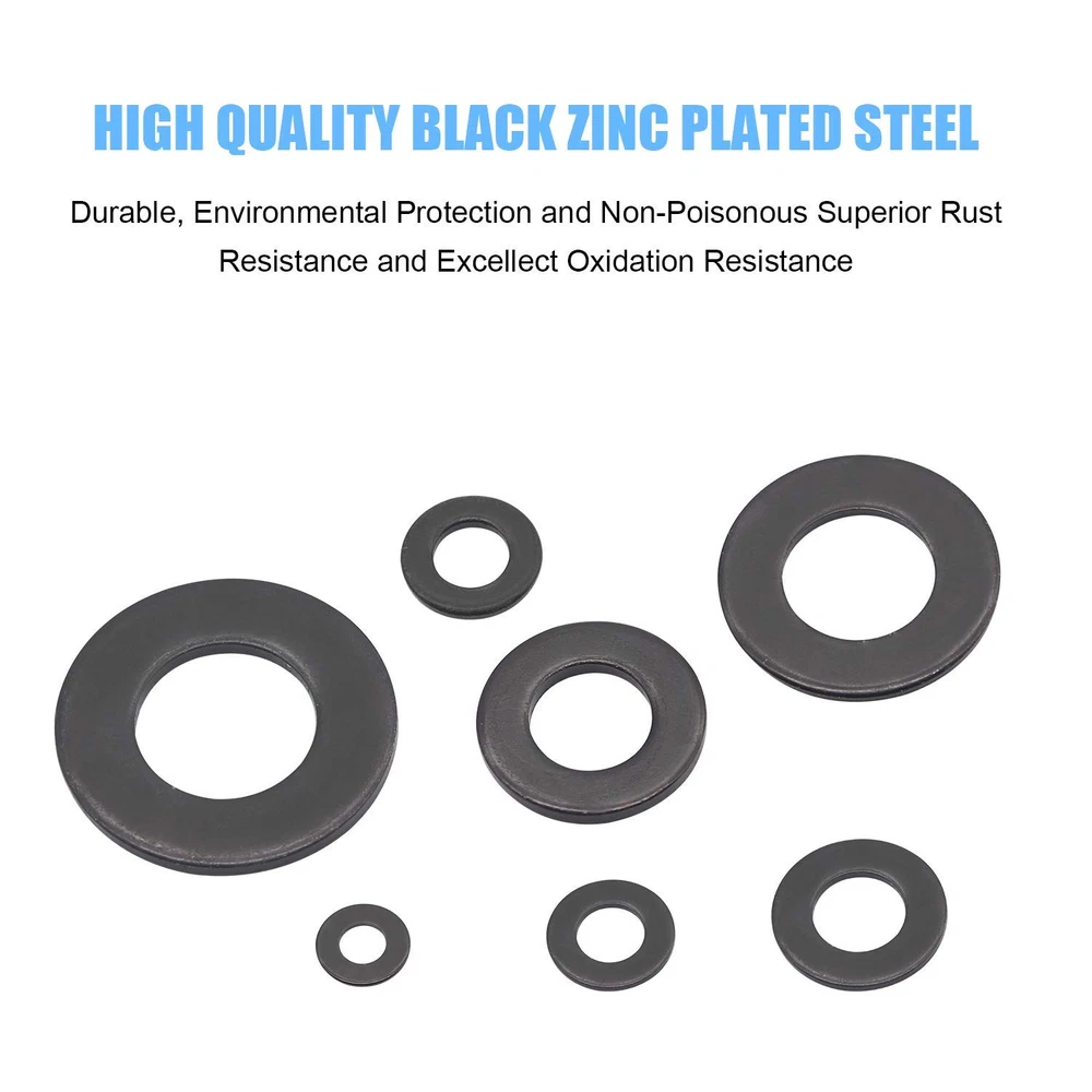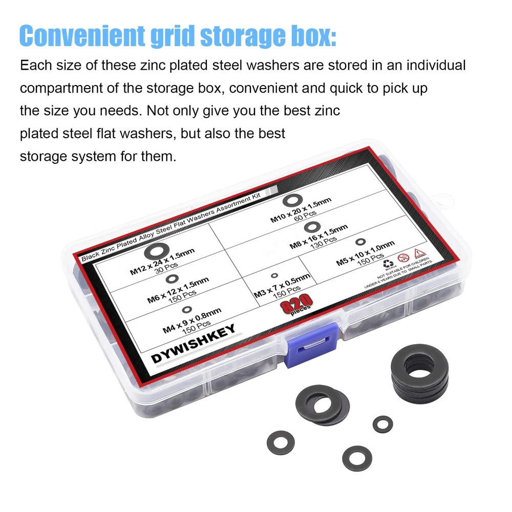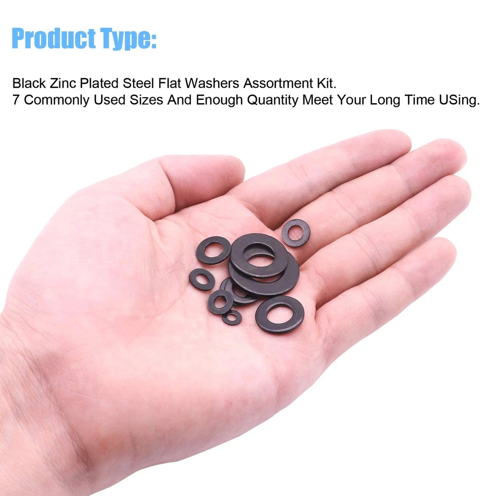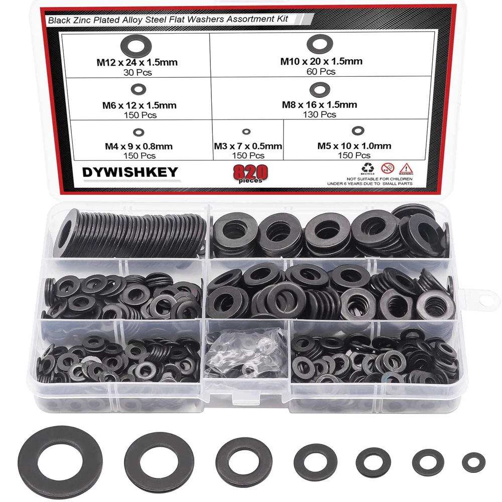 √ Size : M3 (150pcs), M4 (150pcs), M5 (150pcs), M6 (150pcs), M8 (130pcs), M10 (60pcs), M12 (30pcs), total 7 different sizes can meet your different needs. √ Material: High Quality Black Zinc Plated Steel, the Zinc Plated Steel material features strength and offers good corrosion resistance in bad environment like high temperature, cold weather, and high humidity areas. They have superior rust resistance and the excellent of oxidation resistance, which can ensure long time using. √ Feature: Flat washers are mainly used to reduce pressure and friction, prevent leakage, isolate, loosening or disperse pressure. Black Zinc Plated Alloy with rust resistant galvanized finish to ensure life-time use. √ Package: All DYWISHKEY 820PCS 7 Sizes Zinc Plated Steel Flat Washer are packed into a sturdy transparent box organizer. Not only give you the best flat washers, but also the best storage system for them. Sufficient number to meet your daily use √ Widely Applications: Perfect for electrical connections on household and commercial appliances, automotive and marine uses in which the power source has a threaded/bolt-type connection. If you have any questions about our products, welcome your inquiry and we will solve the problem for you in time. 【Specifications:】 - Color: Black - Package Quality: 820 PCS - Washer Type: Flat Washer - Sizes: M3 M4 M5 M6 M8 M10 M12 - Material: High-quality Zinc Plated Steel 【Features:】 1, Flat washers are mainly used to reduce pressure and friction, prevent leakage, isolate, loosening or disperse pressure. Black Zinc Plated Alloy with rust resistant galvanized finish to ensure life-time use. 2, The Zinc Plated Steel material features strength and offers good corrosion resistance in bad environment like high temperature, cold weather, and high humidity areas. They have superior rust resistance and the excellent of oxidation resistance, which can ensure long time using. 【Package Included:】 <1> M3x7x0.5mm ------------------------ 150 PCS <2> M4x9x0.8mm ------------------------ 150 PCS <3> M5x10x1.0mm ----------------------- 150 PCS <4> M6x12x1.5mm ----------------------- 150 PCS <5> M8x16x1.5mm ----------------------- 130 PCS <6> M10x20x1.5mm ---------------------- 60 PCS <7> M12x24x1.5mm ---------------------- 30 PCS 【Total: 820 PCS, 7 Sizes】 Note: Small parts, keep away from children under 6 years old.