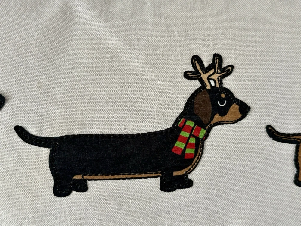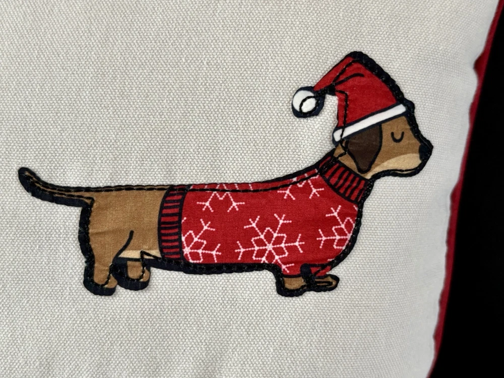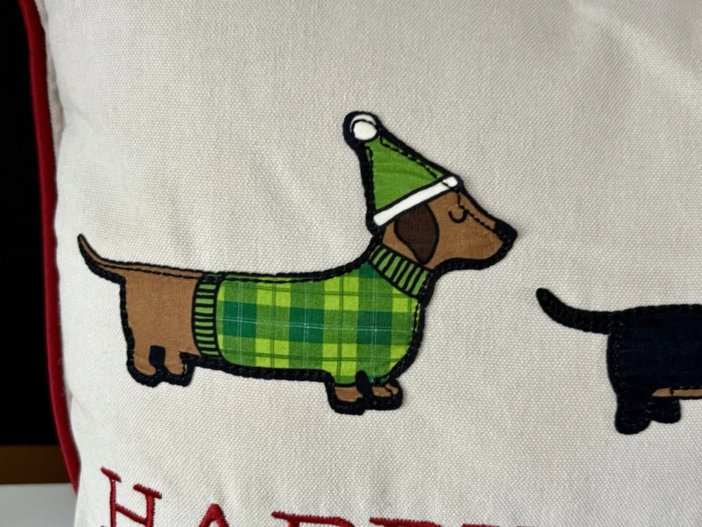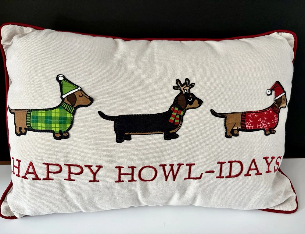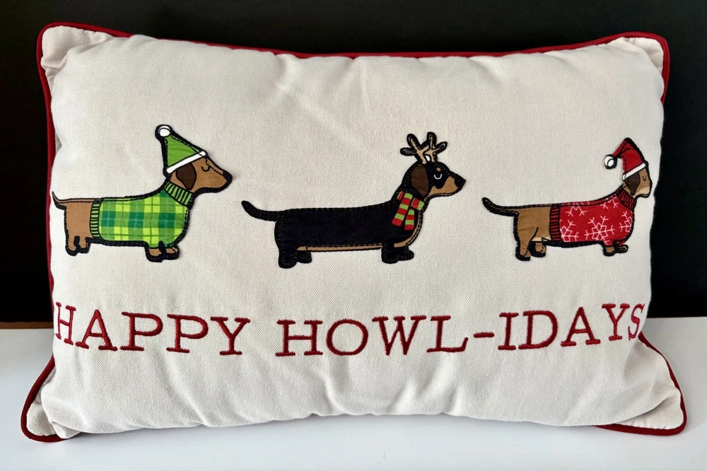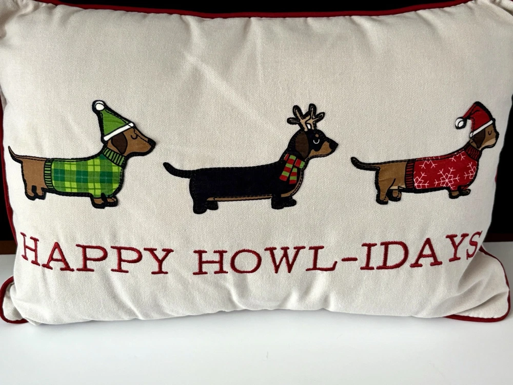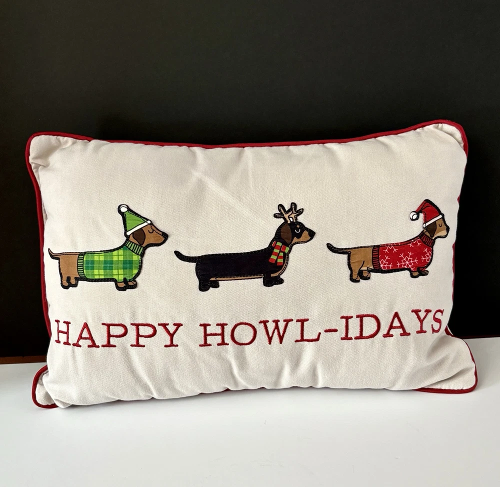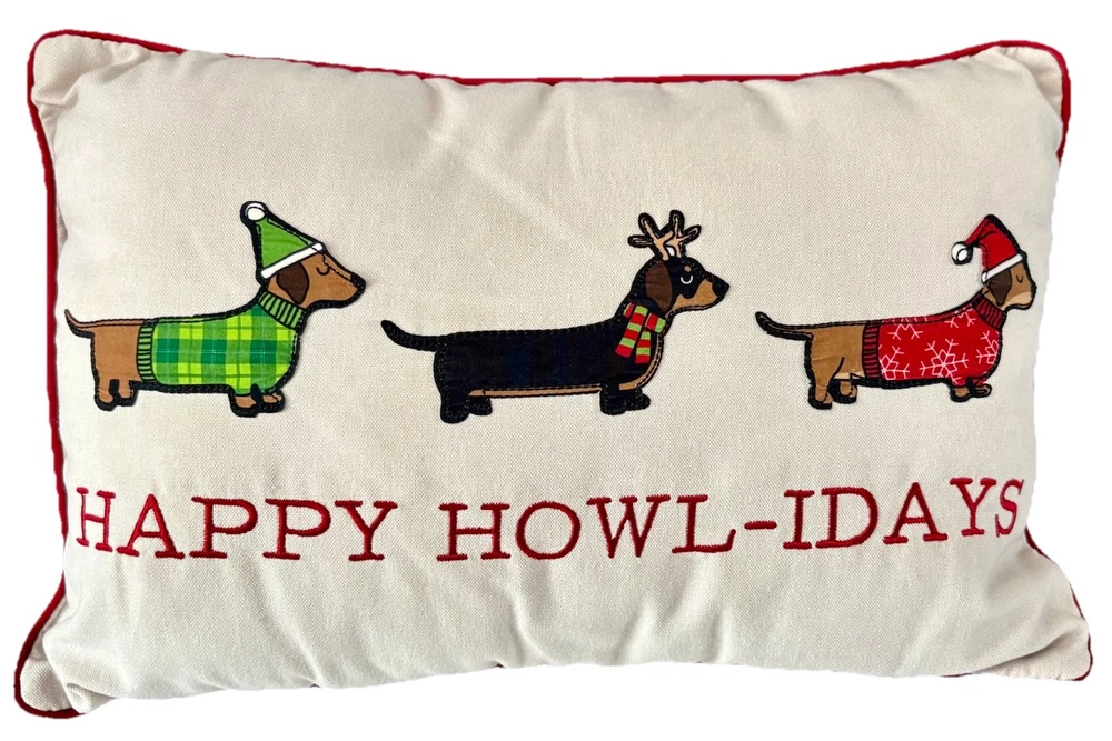 This decorative throw pillow features a holiday design with an animal print pattern of Dachshund Weiner Doxie Dogs, perfect for Christmas and winter-themed decor. Measuring 18 inches in length and 12.5 inches in height, this multicolored pillow is personalized with the phrase "Happy Howl-days" for a festive touch. Ideal for adding a cozy and whimsical accent to your home during sweater weather, this throw pillow is a charming addition for dog lovers or anyone looking to enhance their holiday decorations with a touch of canine charm. Questions are always welcome! Thank you for looking!