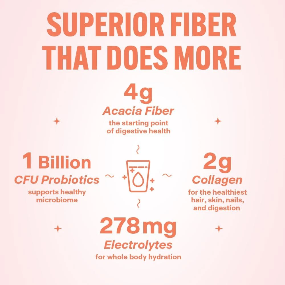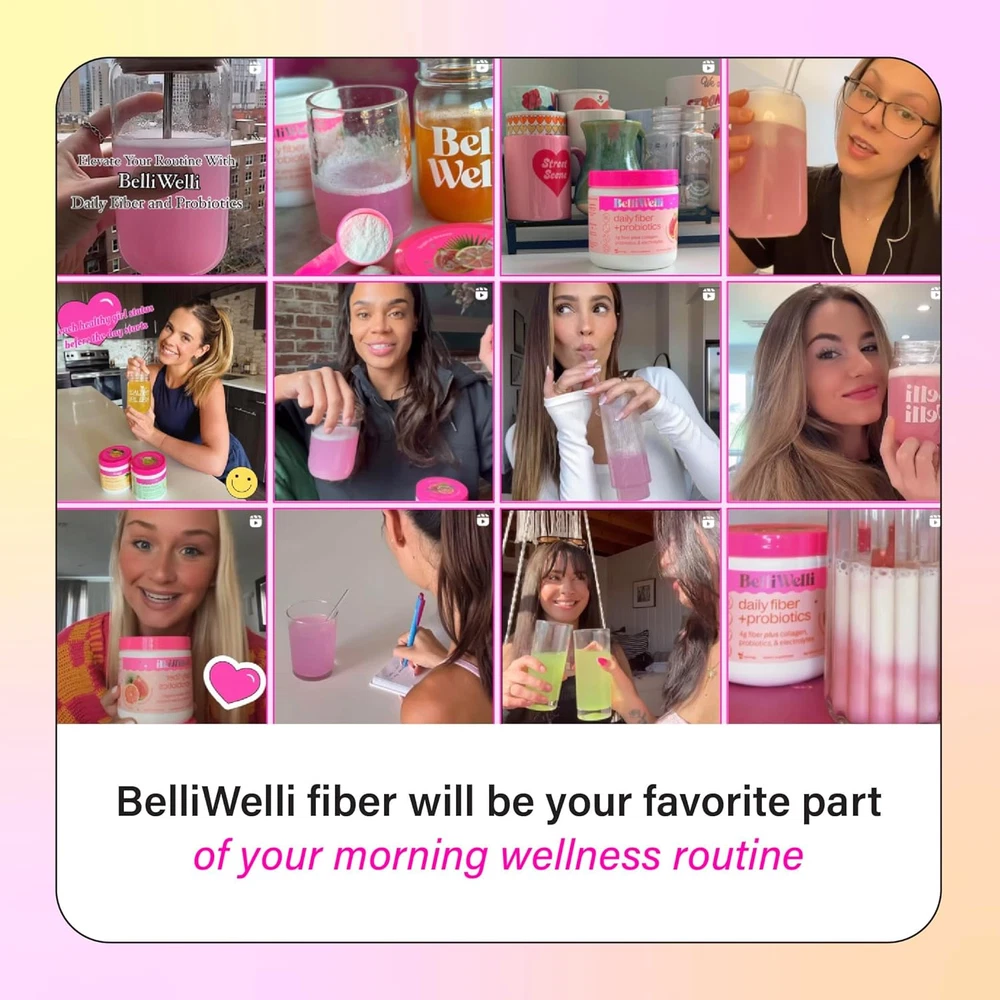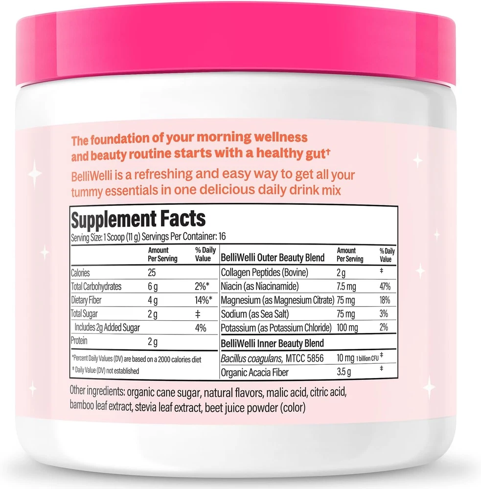 PREMIUM, SCIENCE-BACKED FIBER SUPPLEMENT: Our proprietary, physician-formulated BelliWelli Daily Fiber blend combines 4 grams of fiber with probiotics, collagen and electrolytes, providing comprehensive support for gut health, skin, and hydration. OPTIMAL DIGESTIVE FUNCTION: Look and feel great from the inside out. Fiber supports accelerated metabolism, keeps you full between meals, and decreases bloating. FOUR GUT HEALTH BENEFITS: Tackle hydration, energy, skin health and digestion with a four-in-one fiber supplement. In addition to fiber, BelliWelli contains collagen to support skin & hair health, electrolytes for whole body hydration and probiotics to restore healthy gut flora. EASY-TO-DISSOLVE AND DELICIOUS: No more chunky, grainy, hard to dissolve fiber powder! BelliWelli dissolves quickly and easily and comes in delicious and refreshing fruit flavors. Tastes so good you’ll forget you’re covering your nutritional gaps with every sip. HOW TO USE: Stir or whisk thoroughly in 10-12 oz of water. Add some ice. You can even try adding to your favorite smoothie! Boost your water up to 4x per day. SIMPLIFY YOUR ROUTINE AND SAVE MONEY: Declutter your supplement cabinet. One simple and delicious scoop every morning for a more complete wellness routine. Product Description