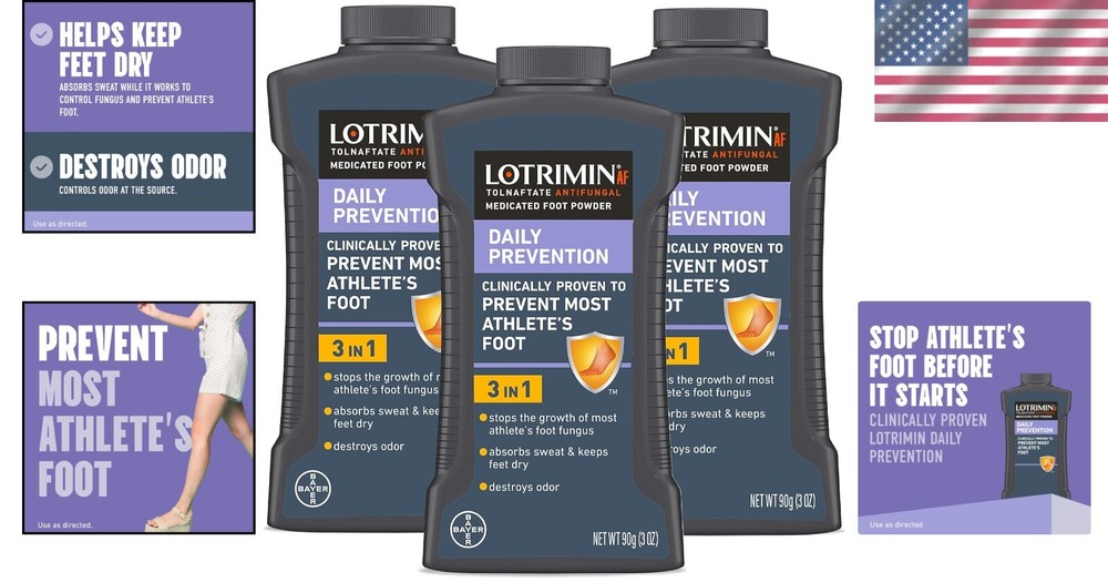 Daily Prevention Medicated Foot Powder for Athlete's Foot – 3 Bottles, 3 Oz Each ‹ › ‹ › ‹ › ‹ › ‹ › ‹ › ‹ › ‹ › ‹ › ‹ › ‹ › ‹ › Daily Prevention Medicated Foot Powder for Athlete's Foot Included: 3 Bottles, 3 Oz Each Features: Clinically Proven: Proven to prevent most athlete’s foot infections. Fungal Control: Effectively controls the growth of tinea pedis fungus. Keeps Feet Dry: Absorbs sweat to maintain dry and healthy feet. Odor Fighter: Destroys unpleasant foot odors. Active Ingredient: Contains tolnaftate, clinically proven to prevent most athlete’s foot fungus. Safe for Kids: Safe for use on children over 2 of age – can be sprayed between toes. Benefits: Effectively prevents uncomfortable itching, burning, cracking, and scaling. Supports ongoing foot hygiene and health. Ideal for daily use, especially for active individuals. Convenient pack of three bottles ensures you always have a supply on hand. Why Choose Our Daily Prevention Medicated Foot Powder? Your feet deserve the best care, and our Daily Prevention Medicated Foot Powder is your first defense against athlete’s foot. With its clinically proven formula, it not only fights fungus but also absorbs moisture and combats odor, leaving your feet feeling fresh and dry. Whether you lead an active lifestyle or simply want to keep your feet in impeccable condition, this powder is designed to meet your needs. Each pack contains three convenient 3 oz bottles, making it easy to carry with you wherever you go. Protect your feet from the discomfort of athlete's foot today - order your Daily Prevention Medicated Foot Powder now! Shipping Free & Fast Shipping - We offer free shipping to most of the USA with a normal delivery time of 3-7 days. However, due to the current situation, additional delivery time (up to 3 weeks) may be required for some items. Alternative Carriers - We may use alternative carriers (e.g. USPS, FedEx, UPS, etc.) to ensure your package arrives safely and on time. Due to the use of multiple carriers, we are unable to provide a tracking number automatically. Handling Time - Orders are processed and shipped within 1-2 business days of receiving cleared payment. Shipping Restrictions - Shipping to Alaska, Hawaii, Puerto Rico, Guam, and other US territories may incur shipping charges or delivery restrictions. Please contact us before ordering, or your order can be refunded/cancelled. State Restrictions - There may be restrictions based on your state of purchase. For example, certain items may not be shipped to California due to state regulations. Contact for Tracking Updates - If you require tracking updates or have any concerns about the delivery of your order, please feel free to contact us, and we will be happy to assist you. Return 30-Day Hassle-Free Returns - We want you to be completely satisfied with your purchase. If you are not, you can return the item within 30 days of receiving it for a full refund or exchange. Easy Return Process - To start a return, simply contact us and we will provide you with a prepaid return shipping label and detailed instructions. Restocking Fee - There are no restocking fees for returns. However, the buyer is responsible for return shipping costs if the return is not due to a seller's error. Refund Processing Time - Refunds will be processed within 5 business days of receiving the returned item in its condition. Payment We accept all major credit cards, PayPal, and Apple Pay for your convenience. Your payment information is secure and encrypted to ensure a safe and seamless transaction. Please complete your payment within 3 days of purchase to avoid any delays in shipping. Feedback Your feedback is extremely important to us. We strive to provide the best products and customer service possible. If you are satisfied with your purchase, please take a moment to leave us a positive review. If you have any concerns or issues with your order, please contact us before leaving negative feedback. We are committed to resolving any problems and ensuring your satisfaction. Contact Us If you have any questions or concerns, please feel free to out to our customer support team. You can contact us through the eBay messaging system. We are available Monday to Friday, 9:00 am to 5:00 pm EST, and we will do our best to respond to your inquiry within 24 hours. Buy it now and enjoy a pleasant shopping experience! Expiration Date: None Unit Quantity: 3 Main Purpose: Antifungal,Dryness,Odor Control Ingredients: Tolnaftate Active Ingredients: Tolnaftate Body Area: Feet Features: Clinically Proven,Moisture Absorption,Odor Destruction,Safe for Kids Over 2 Formulation: Powder Scent: None Set Includes: Pack of 3 Type: Medicated Treatment Color: Multicolor Volume: 3 oz Size: Regular Period After Opening (PAO): None Dosage: None Department: Unisex Skin Type: All Skin Types Unit Type: oz