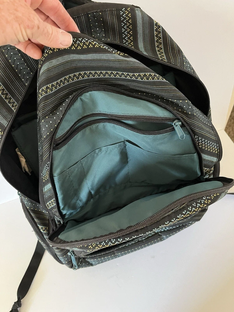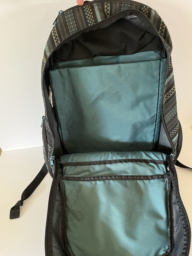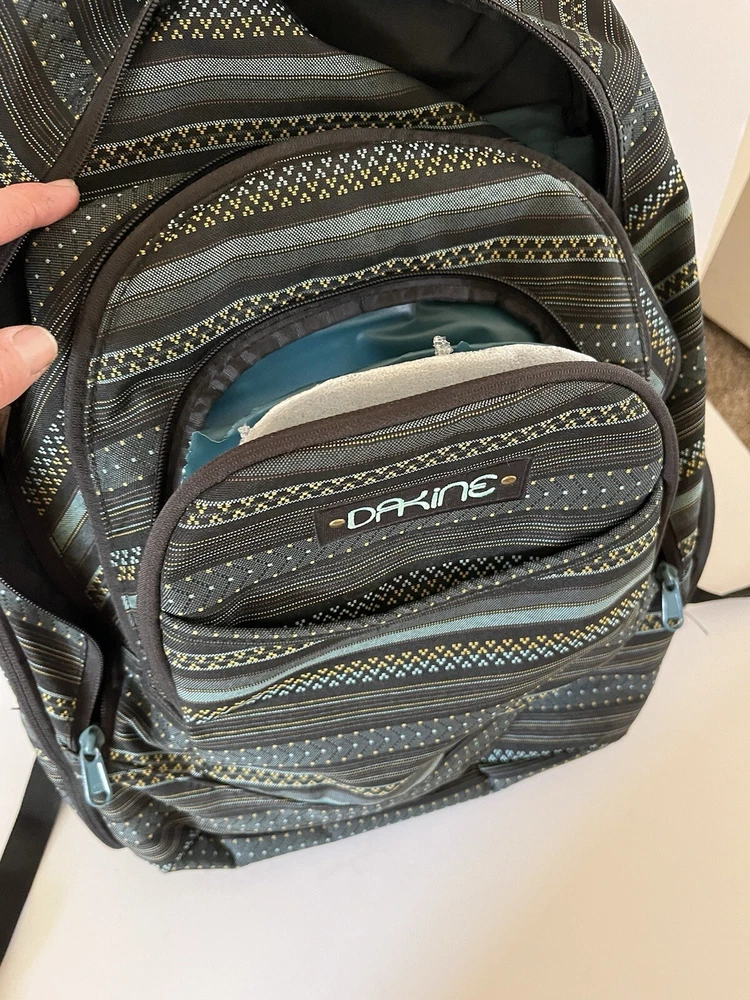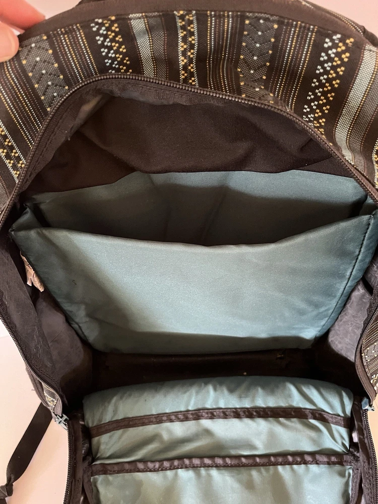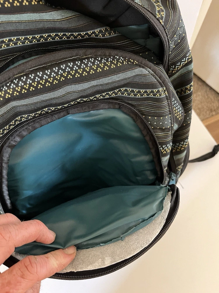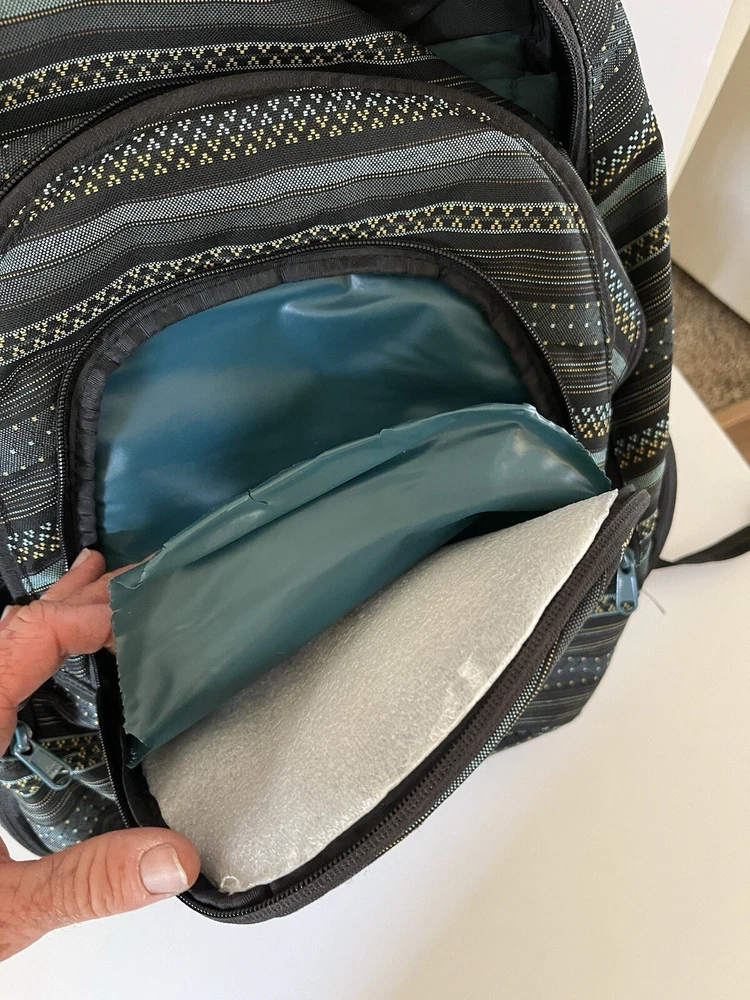Please look at photos. Has flaw on the inside of the insulated pocket. the stitching came loose. As seen in the last 3 photos. Besides the one pocket the back pack is in good condition. Also has a small blemish on the very bottom of backpack where the material is slightly torn but doesn’t go all the way through material.
