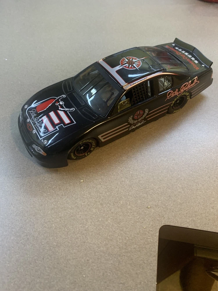 This is a 1:24 scale diecast replica of Dale Earnhardt's 2002 Chevrolet Monte Carlo featuring the logo of Dale Earnhardt Incorporated. The black vehicle, part of the Revell Select series, features authentic details like Earnhardt's signature and is a limited edition collectible piece. This NASCAR racecar model is recommended for adult collectors. This diecast is in excellent and undamaged condition, however the original box is severely water damaged.