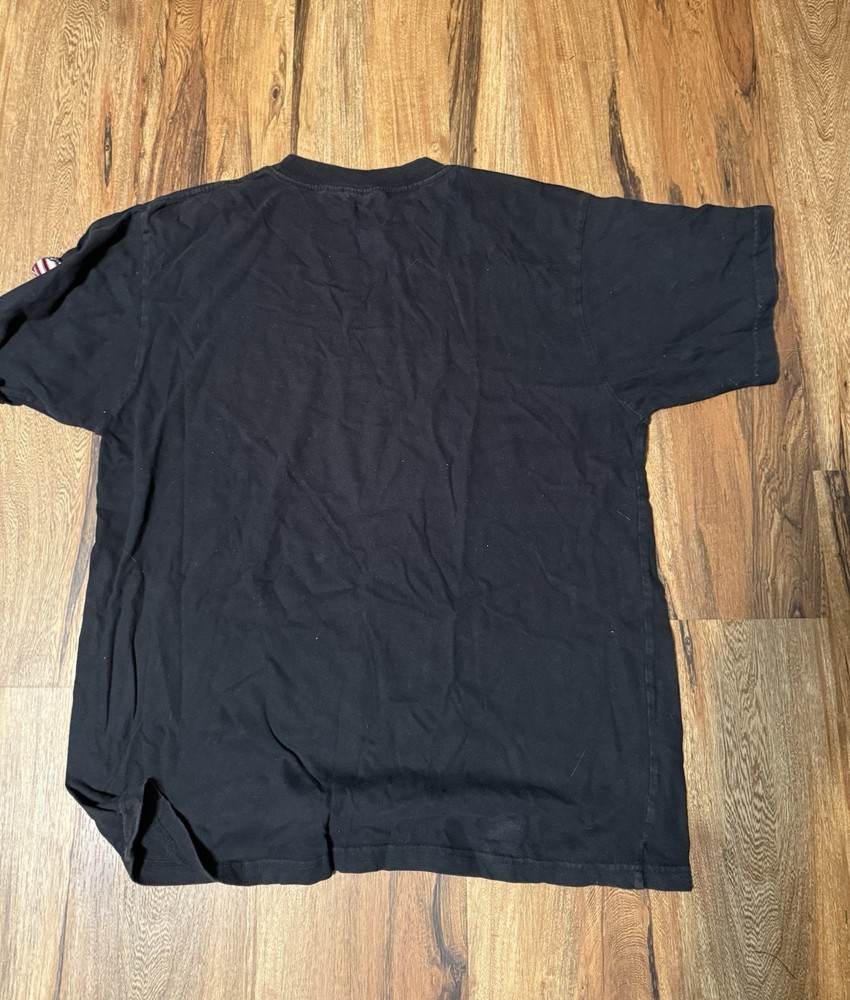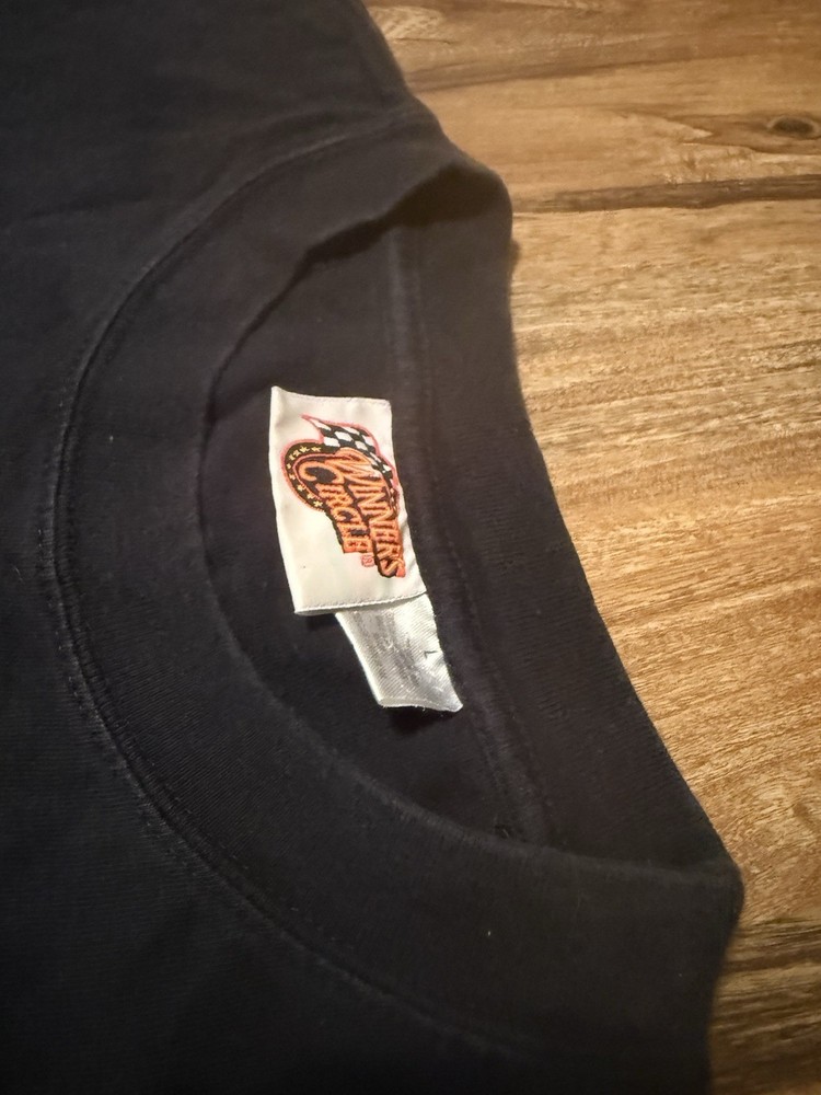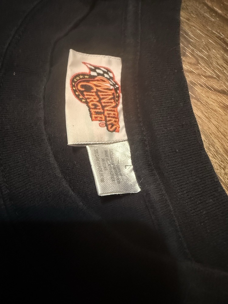 The Dale Earnhardt The Intimidator Nascar Shirt in size L is a vintage black T-shirt featuring an embroidered Winners Circle design, perfect for fans of Nascar and the legendary driver. Made from cotton with a crew neck and short sleeves, this regular fit shirt is machine washable and ideal for summer and spring seasons. A classic and timeless piece for any man's wardrobe, this shirt pays tribute to one of the greatest drivers in racing history.