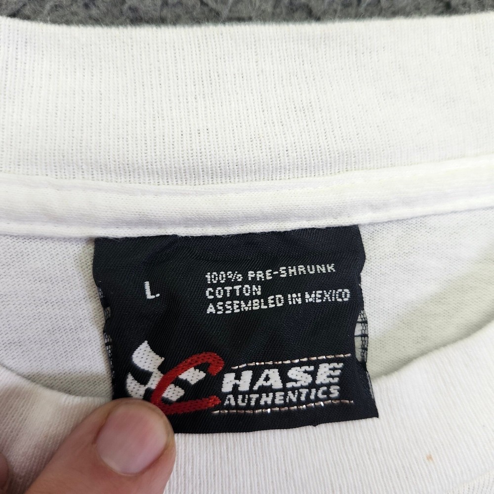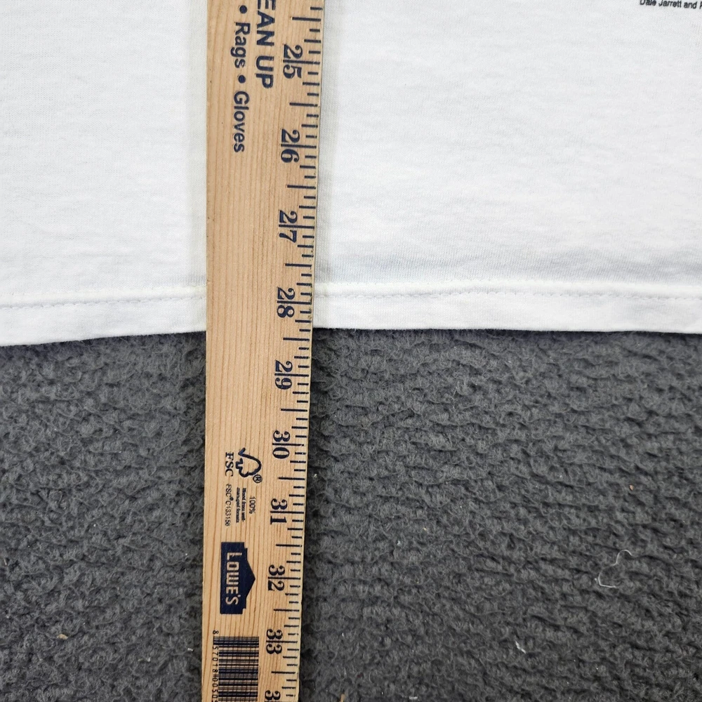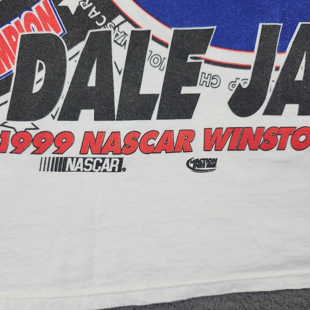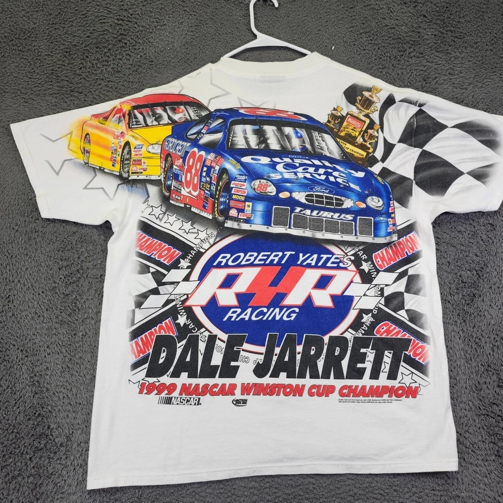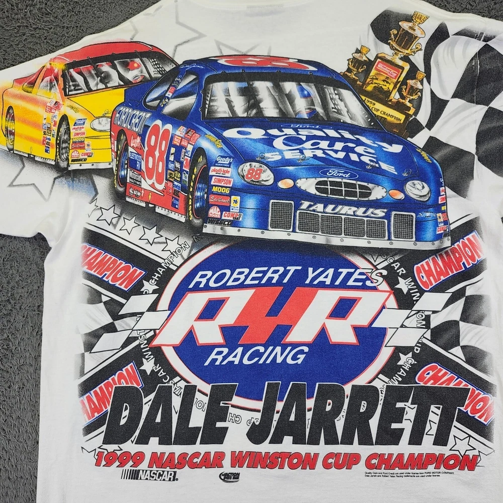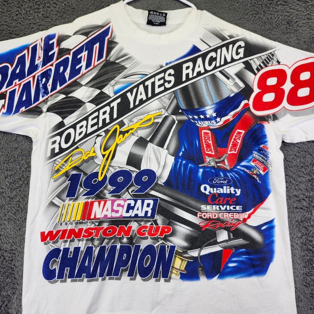 Vintage racing tee, a tribute to Dale Jarrett's 1999 NASCAR Winston Cup Championship. This eye-catching shirt features a vibrant, all-over print design showcasing Jarrett's #88 Robert Yates Racing Ford Taurus. The graphic includes checkered flags, the NASCAR logo, and bold lettering declaring Jarrett as the 1999 Champion. The shirt is a standout piece for any racing enthusiast or collector of vintage sports memorabilia. The trademarks of Dale Jarrett and Robert Yates Racing are used under license from Ford Motor Company. Color: White Department: Men Type: T-Shirt Sleeve Length: Short Sleeve Character: Dale Jarrett, NASCAR, Robert Yates Racing Pattern: Graphic Print Character Family: NASCAR, Dale Jarrett, Robert Yates Racing, Ford Racing, Winston Cup Features: Lightweight, Breathable Neckline: Crew Neck Material: Cotton Keywords: Dale Jarrett, NASCAR, Racing, Vintage, T-Shirt, Chase Authentics, Robert Yates Racing, 1999 Champion, Winston Cup, Ford Taurus, Motorsports, Collectible, Graphic Tee, Race Car, Number 88 all items have been cleaned and disinfected we stand behind all items we sell so please contact us if you have an issue with any order