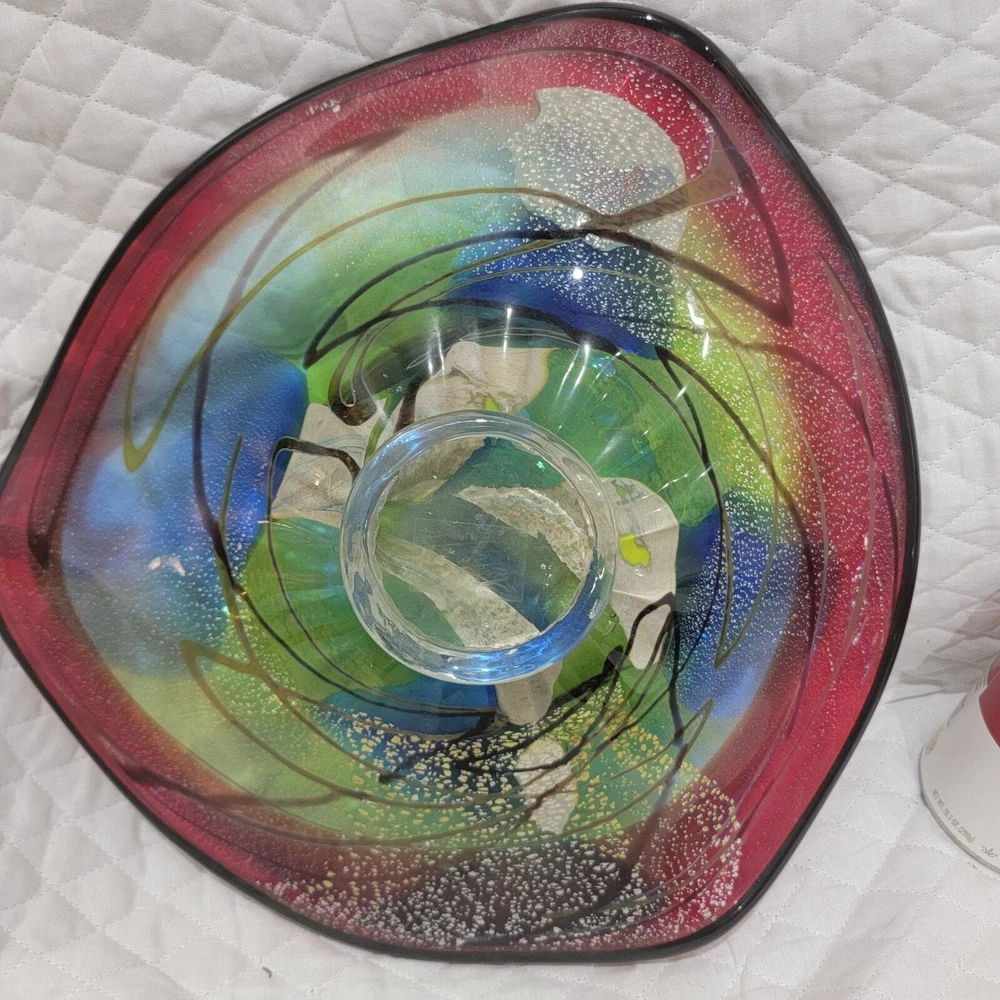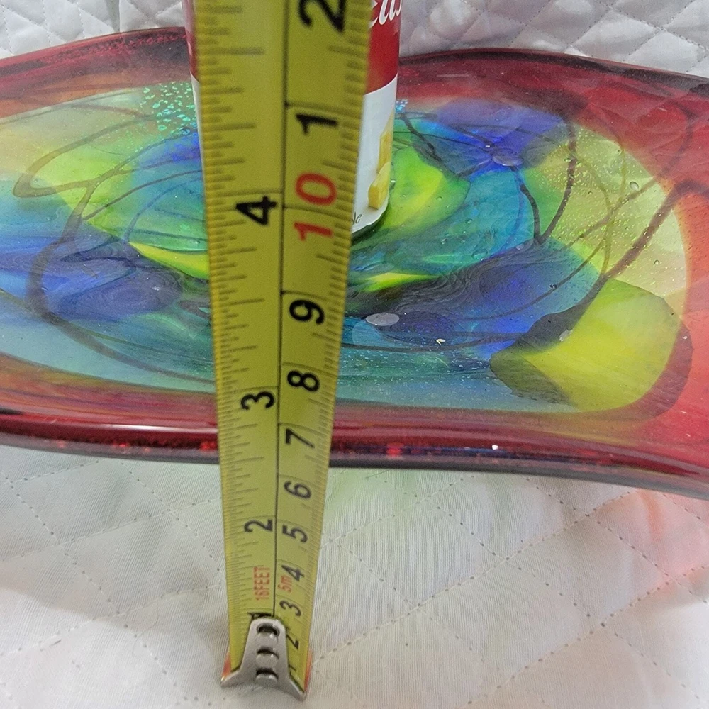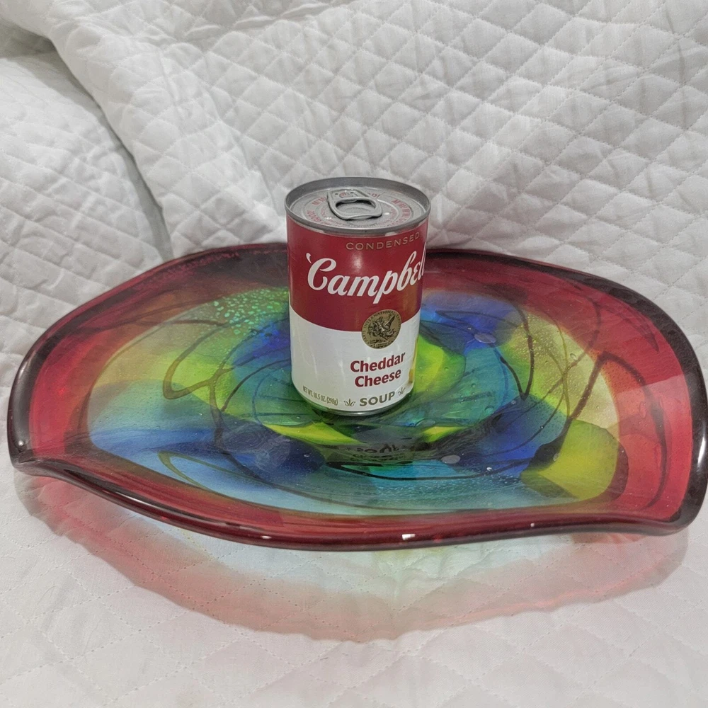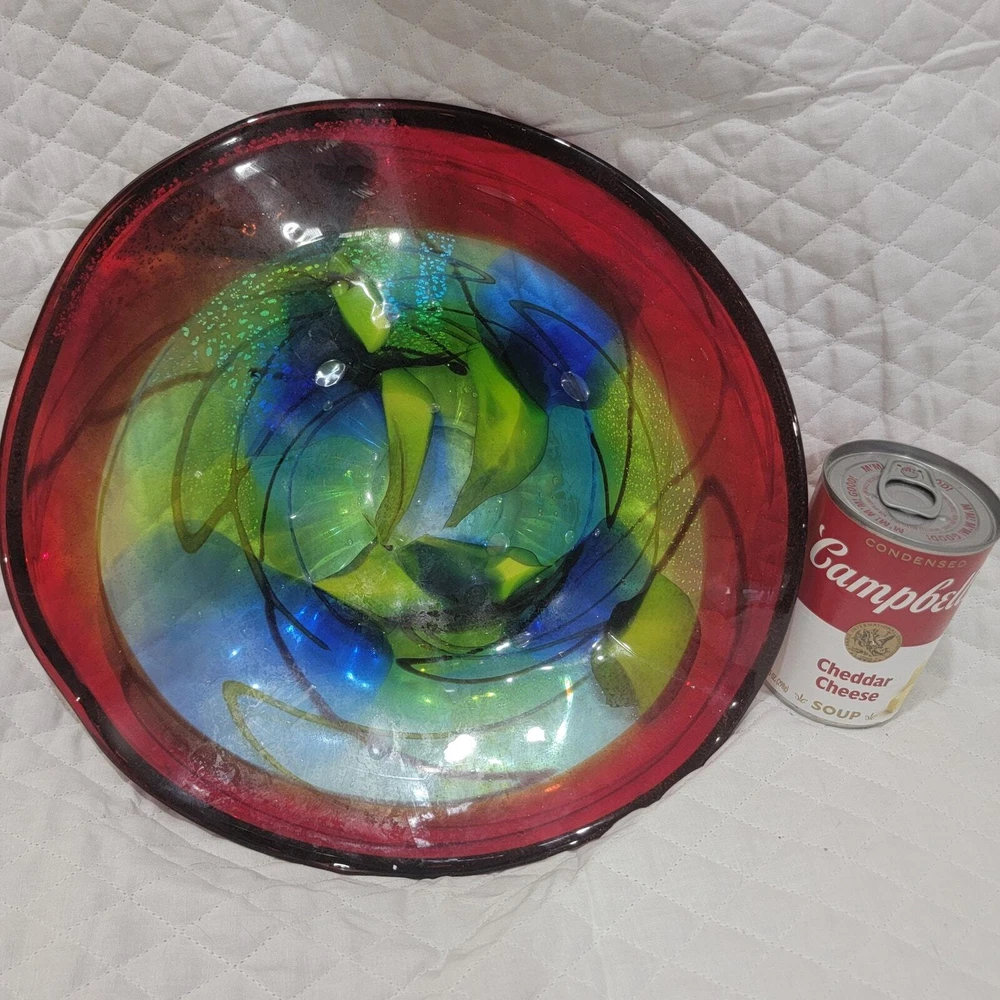 Dale Tiffany Hankley 12" large hand blown glass dish is very versatile and can be used as a display, fruit bowl, secured at base as wall décor. Slightly curved edges, dark blue and green blending, thick red band around edge with black trim. Has a 1" glass base. I have multiple Dale Tiffany dishes in various sizes. You can use a variety of them to create a stunning, artistic wall mural. Soup can is pictured to show size and dimension. Measures 12 inches across and 2.5 inches at the highest part of the curved edge. Like new condition. Never used & label still on the base. You can use a variety of them to create a stunning, artistic wall mural by buying wall brackets at your local home improvement store - brackets not included - example in last pic. Nonsmoking home with awesome pugs.