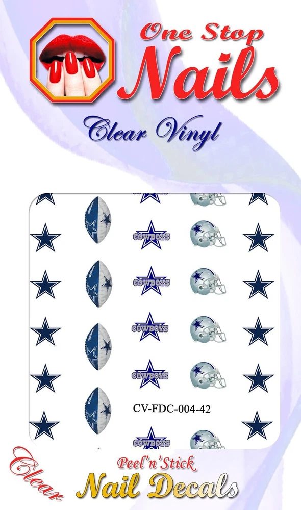 Dallas Cowboys Clear Vinyl PEEL and STICK (NOT Waterslide) nail decals/sticke... Product Overview For Dallas Cowboys fans: Top Quality Bright and Colorful Set of 42 Clear Vinyl PEEL and STICK (NOT Waterslide) nail decals/stickers. Can be applied to any types of nails: Acrylic, Any type of Gel, Regular Nail polish. Looks best on white or lighter color nail polish. Details: Product Dimensions: 5 x 3 inches ; 0.2 ounces Shipping Weight: 0.2 ounces Features: Dallas Cowboys Clear Vinyl PEEL and STICK (NOT Waterslide) nail decals/stickers Very easy to apply Top Salon Quality Can be applied to any types of nails: Acrylic, Any type of Gel, Regular Nail polish Made in USA Quality Products Have peace of mind knowing that your order will arrive original factory sealed packaging. That means that you'll have the full force of the manufacturer's warranty to protect your purchase. Fast and Free Shipping You're already purchasing the item. Why pay additional for shipping, especially slow shipping? We get your order shipped out and delivered to your doorstep as quickly as possible. Commitment We are committed to making sure that you leave this transaction satisfied. That means having access to real people that get your questions and concerns answered quickly. Give us a shot and we will make sure that you will look to us again!