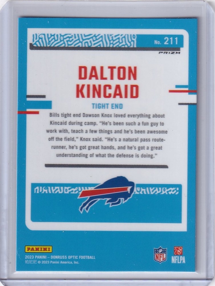 Elevate your football card collection with the Dalton Kincaid 2023 Panini Donruss Optic Blue Hyper Prizm Rated Rookie card, number 211. As a standout addition, this card features the promising talent from the Buffalo Bills and is a must-have for fans and collectors alike. The Blue Hyper Prizm parallel variety adds a unique aesthetic, making it a standout piece.Crafted by Panini, a trusted name in sports memorabilia, this card belongs to the esteemed 2023 Panini Donruss Optic set and showcases the NFL's new talent in dazzling detail. Celebrate the rookie season of Dalton Kincaid with this eye-catching sports trading card, a piece that encapsulates the spirit of the sport and the potential of a rising star.