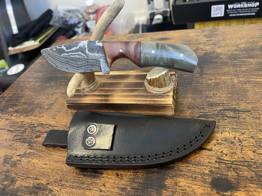 This handmade Damascus Steel Boot/Skinner Knife is a must-have for any collector or outdoor enthusiast. The knife features a full tang and plain edge blade made of high-quality damascus steel, with a beautiful ambidextrous design that makes it suitable for both left- and right-handed users. The knife also comes with a sheath, making it easy to store and transport. The knife's handle is made of durable acrylic material, providing a comfortable grip and ensuring that the knife stays securely in your hand. This knife is an original, one-of-a-kind piece, and is perfect for anyone who wants a high-quality knife that is both functional and stylish. Add this Damascus Steel Boot/Skinner Knife to your collection today! New. Never used never carried!!