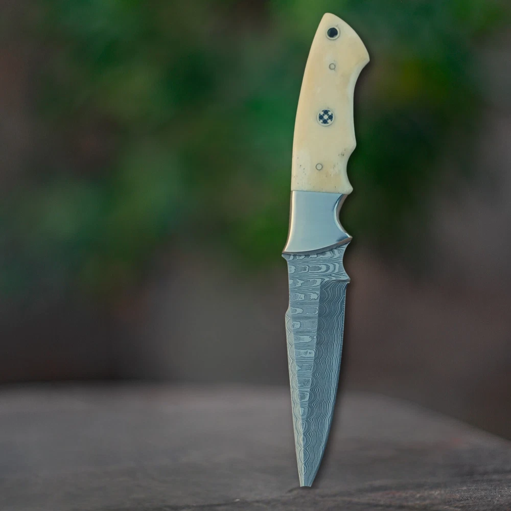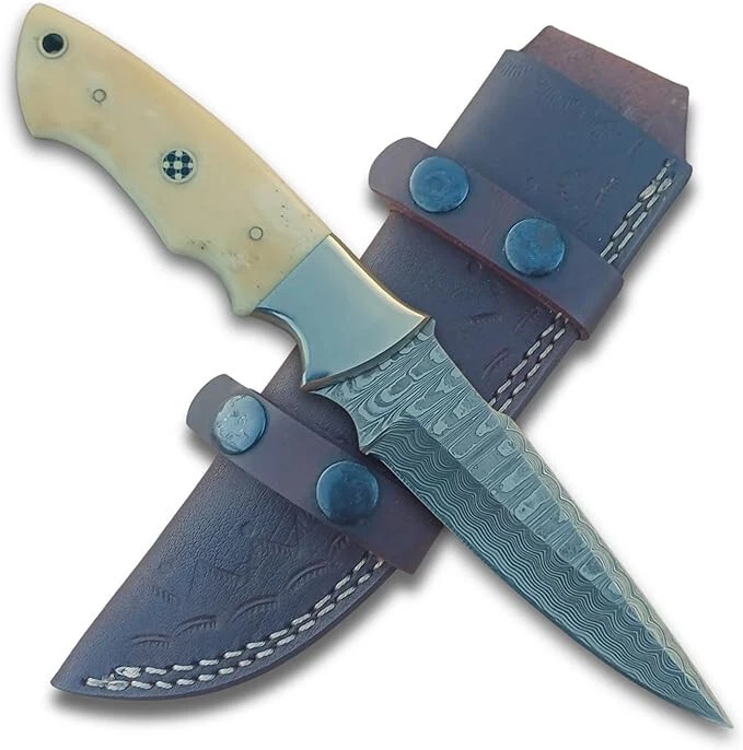 Custom Handmade Damascus Steel Blade Fixed Blade Hunting Knife with Bone Handle and Horizontal Carry Leather Sheath , Heavy Duty Skinner Knife , Bushcraft Knife PREMIUM DAMASCUS STEEL : Hand-forged blade featuring distinctive layered pattern, delivering exceptional sharpness and edge retention with Hardness 56 to 58 HRC . FULL TANG CONSTRUCTION : Damascus Steel Blade Made from 1095 high carbon steel and 15N20 Steels runs through entire handle length for maximum strength and durability during heavy-duty use OVERALL LENGTH: 9 inches or 23 cm total length with ergonomically designed camel bone handle for comfortable grip and precise control . Handle and Blade length is 4.5 inches or 12 cm . Blade thickness is 4mm HORIZONTAL CARRY SHEATH : Durably Stitched Premium vegetable tanned leather sheath included for convenient belt carry and easy access VERSATILE DESIGN : Perfect for hunting, bushcraft, outdoor, camping, and everyday carry tasks with its robust fixed blade design