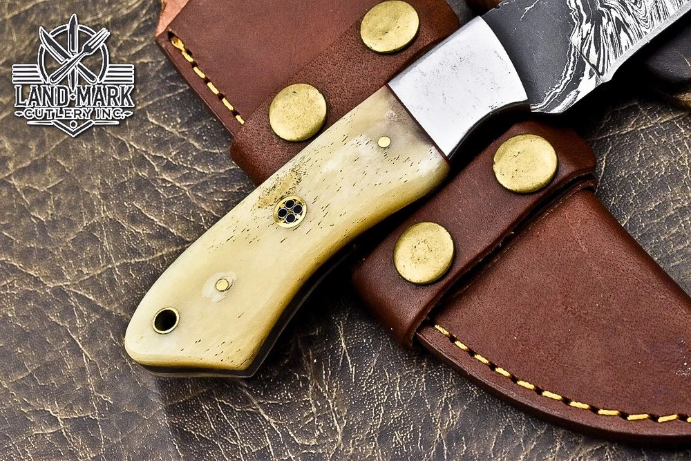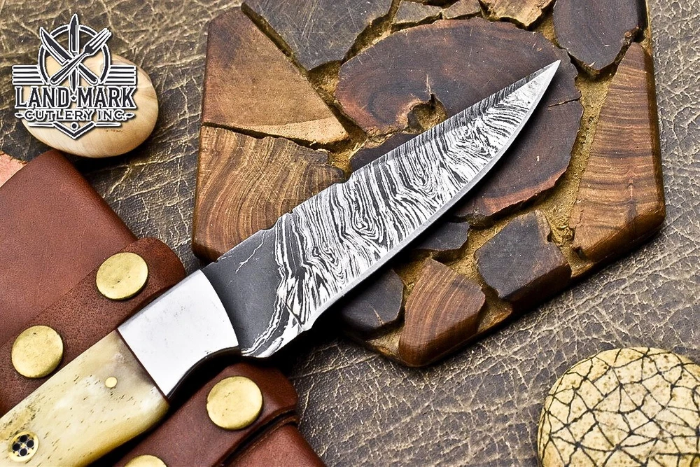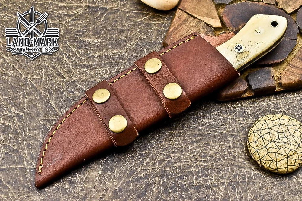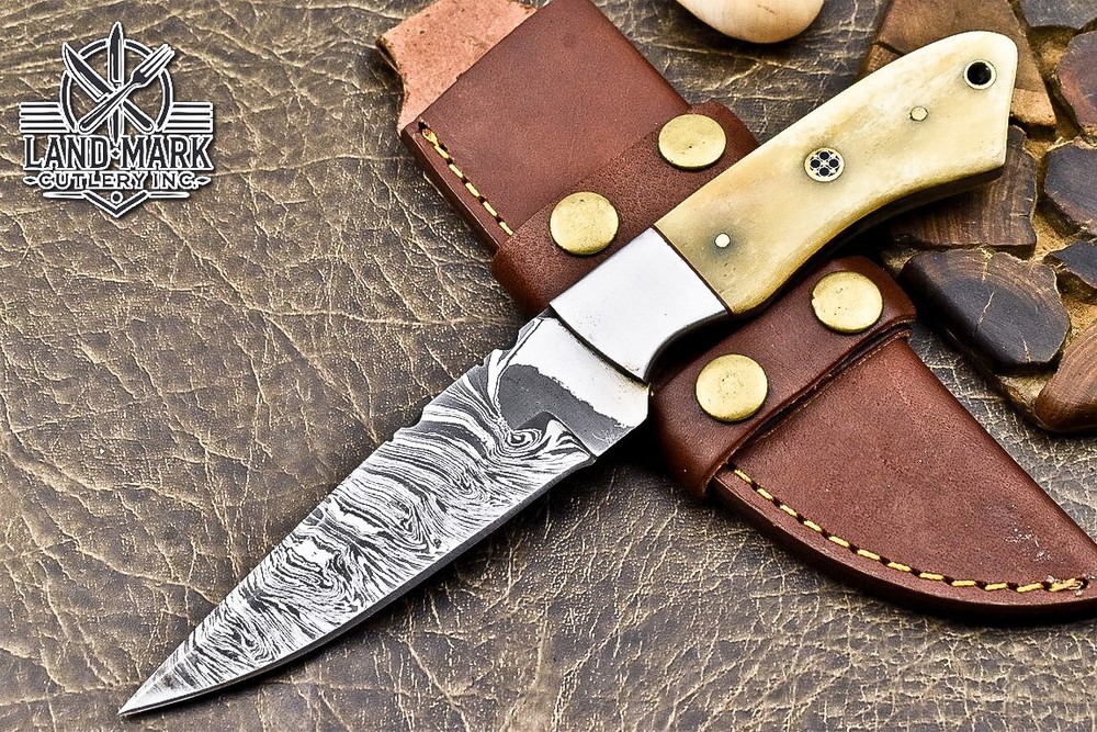 This knife is absolutely stunning! The Damascus steel blade is razor-sharp and holds its edge perfectly, while the bone and steel bolster handle gives it a classic, rugged feel. The craftsmanship is top-notch—you can tell it's handmade with care. It fits comfortably in hand, and the included leather sheath is a nice touch. Great for hunting or as a collector’s piece, and the shipping discount for multiple purchases is a sweet bonus. Really impressed with the quality!