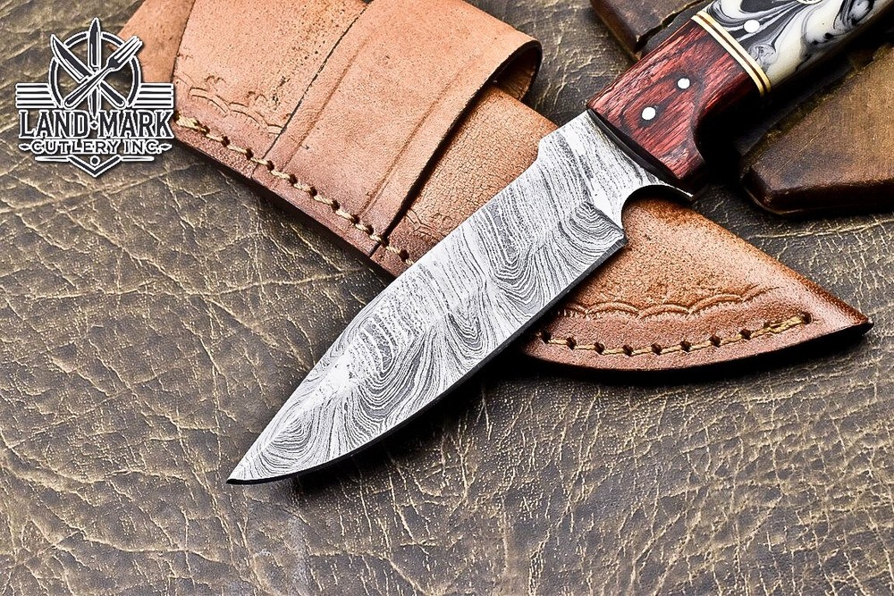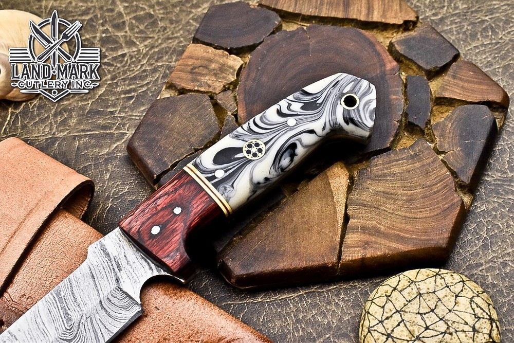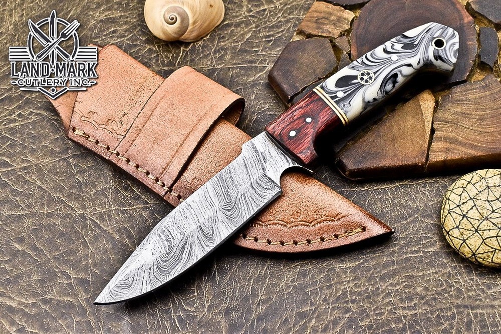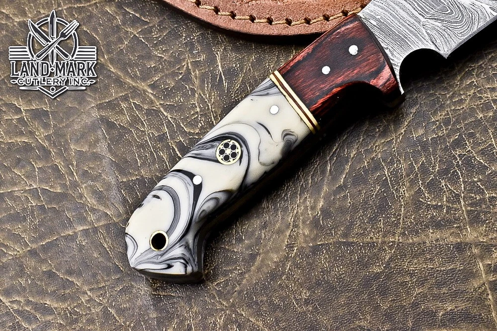 This knife is absolutely stunning! The Damascus steel blade is razor-sharp and holds its edge perfectly, while the white swirl resin handle adds a touch of elegance. The craftsmanship is top-notch—you can tell it’s hand-forged with care. It feels balanced and sturdy in hand, making it great for hunting or outdoor use. The leather sheath is a nice protective touch. Plus, the seller offers shipping discounts for multiple purchases. A must-have for any knife enthusiast!