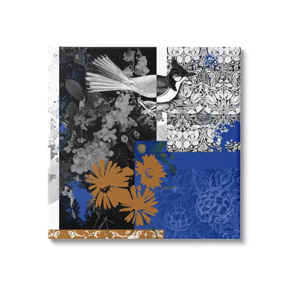 We create our stretched canvas to the highest standards. Using only the highest quality inks and canvas on Mimaki printers, we hand-cut and stretch each piece over a 1.5-inch thick wooden frame for hanging. As a result, the art comes ready to hang on the sturdy ledge with no installation required. Wall Art is made in the USA. Stretched Canvas Sizes Include Standard: 17 x 1.5 x 17 Large: 24 x 1.5 x 24 X-Large: 30 x 1.5 x 30 Oversized: 36 x 1.5 x 36 Wall Art is Ready to Hang - No Installation or Hardware Needed. For Easy Set Up Lean or Layer Artwork on Shelf or Against Wall. Our stretched canvas is created with the highest standards. We use only the highest quality inks and canvas on our in house Mimaki printers, and then hand cut and stretch each piece over a 1.5 inch thick wooden frame for hanging. Made In USA. Artwork Relates To: Collage, Floral, Pattern, Flower, Plant, Animal, Bird, Jay, Modern Design by Melissa