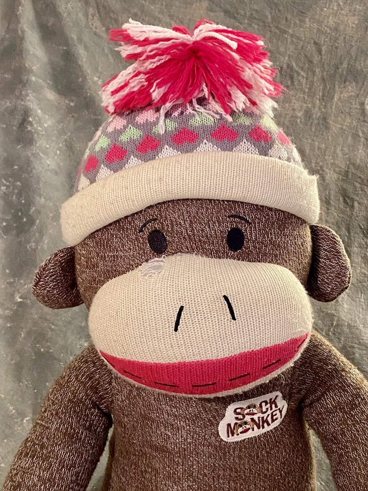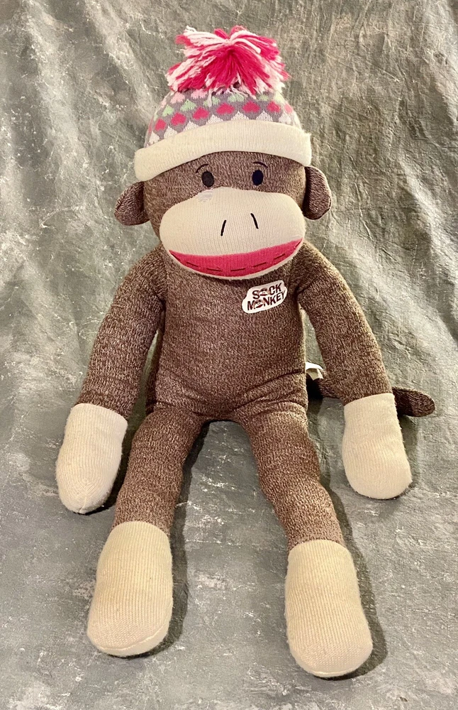 Dan Dee Collectors Choice Huge Sock Monkey wearing a winter stocking cap. He is 36 inches tall, made in China and has only a couple spots of wear. See the fray below one eye. Very clean with no smell or stains.