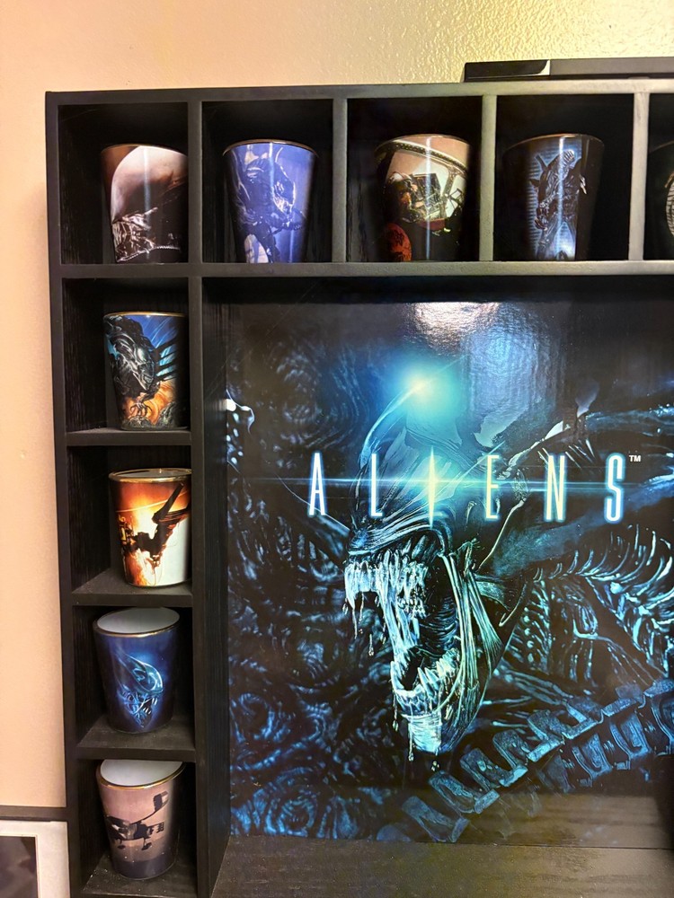 Danbury Mint ALIENS Shot Glass Collection & Display case! There are 20 shot glasses that can fit within the display case that can be wall mounted. Each glass is Gold plated on the rim of the glass and the collection actually has a complete 24 shot glasses (4 are not in photo as they are not on display). This is a Limited Edition collection that is complete. All paperwork for the glasses themselves is also included to authenticate the items. Due to the nature of this collection, it will need to be shipped in 2 separate boxes hence the high shipping rate.