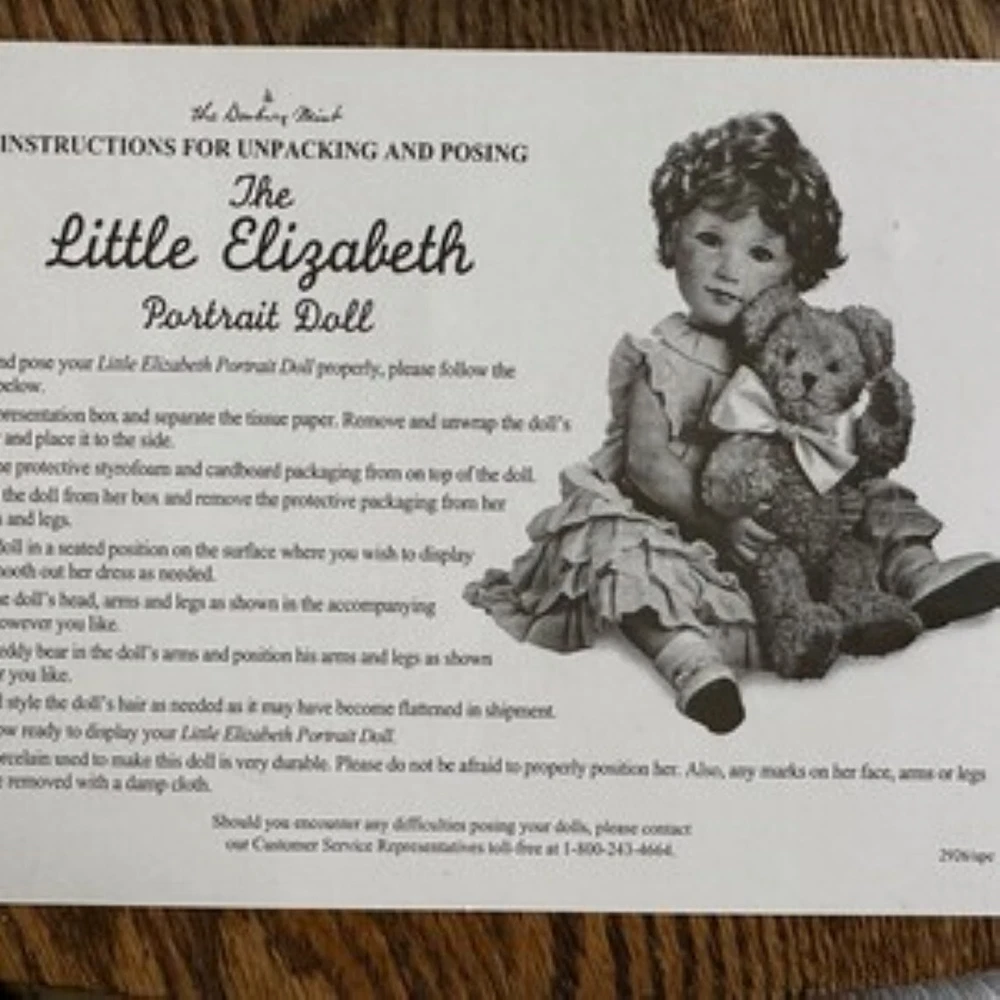Danbury Mint Little Elizabeth Portrait Doll & Boyds Bear --Made in celebration of Queen Elizabeth's Diamond Jubilee (Includes original doll box and COA.) This exquisite doll is made with high-quality porcelain and fabrics. Her "Lilibet" face is so charming it will steal your heart away. The sheer ruffle-layered frock is so sweet in soft yellow, tied in the back in a lovely bow. She loves to hold her cuddly teddy bear, another high-quality product (an original, jointed Boyd's Bear collectible). She is approx. 18" long and sits about 12" high. Her face, breast plate, arms, and legs are made of the finest porcelain and painted with realistic detail. Her body is stuffed cotton, weighted to sit in an adorable toddler position. Underneath she is wearing crisp-white ruffled bloomers and the sweetest shoes (with coordinating yellow bows) and anklets. Her hair is styled in the sweetest baby waves and her baby-blue, glass eyes have the most adorable expression. She will be carefully packed (and tucked in) to travel safely from my clean, smoke-free, pet-free home to yours. Thank you for your interest! Happy to answer any questions.