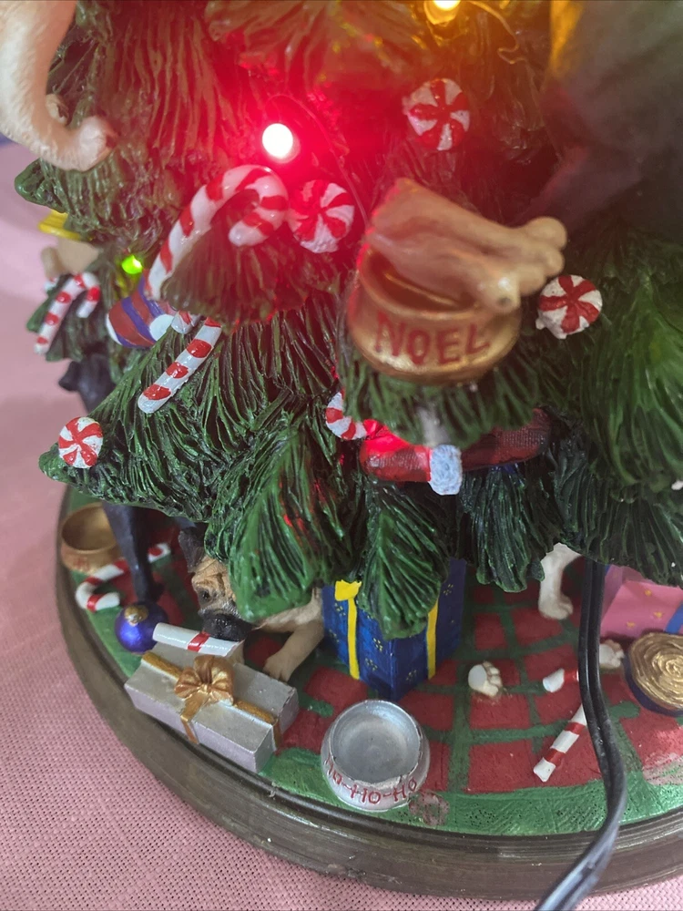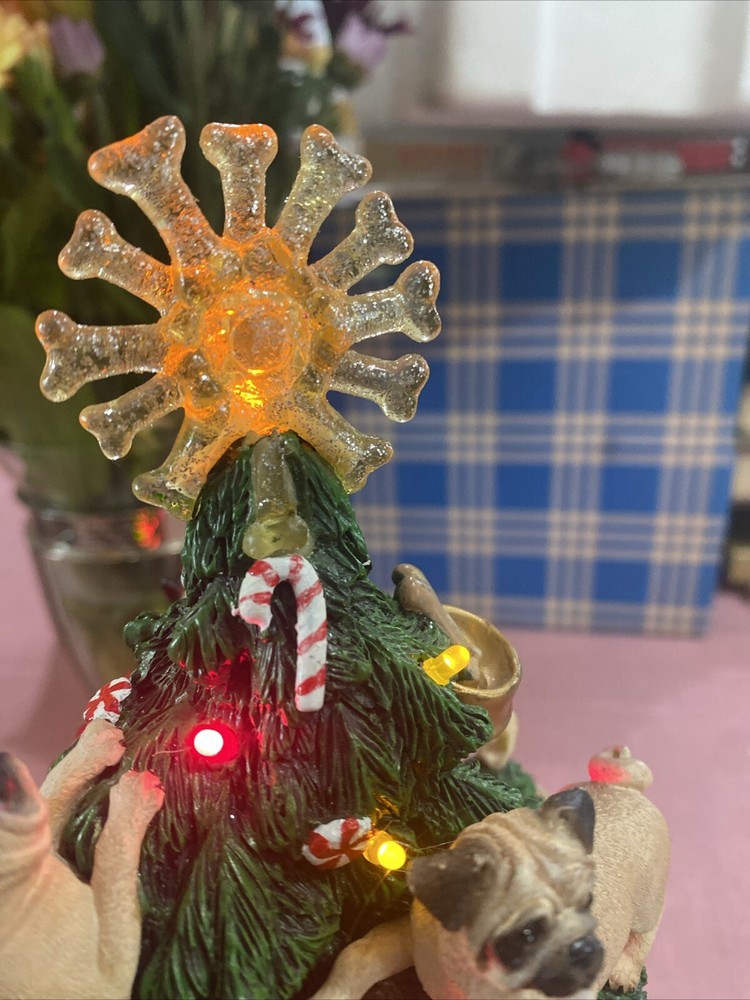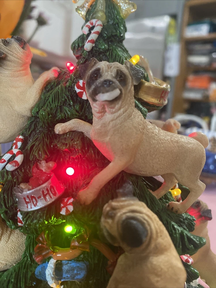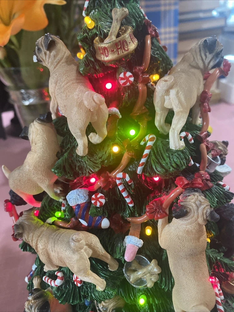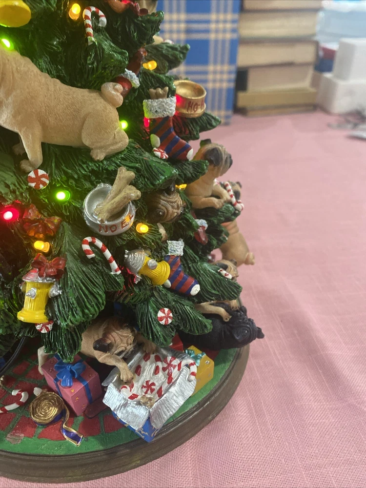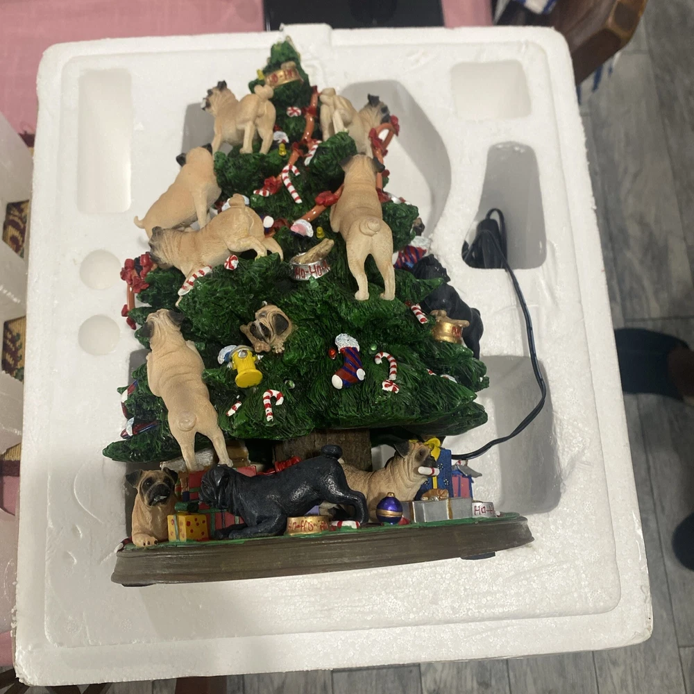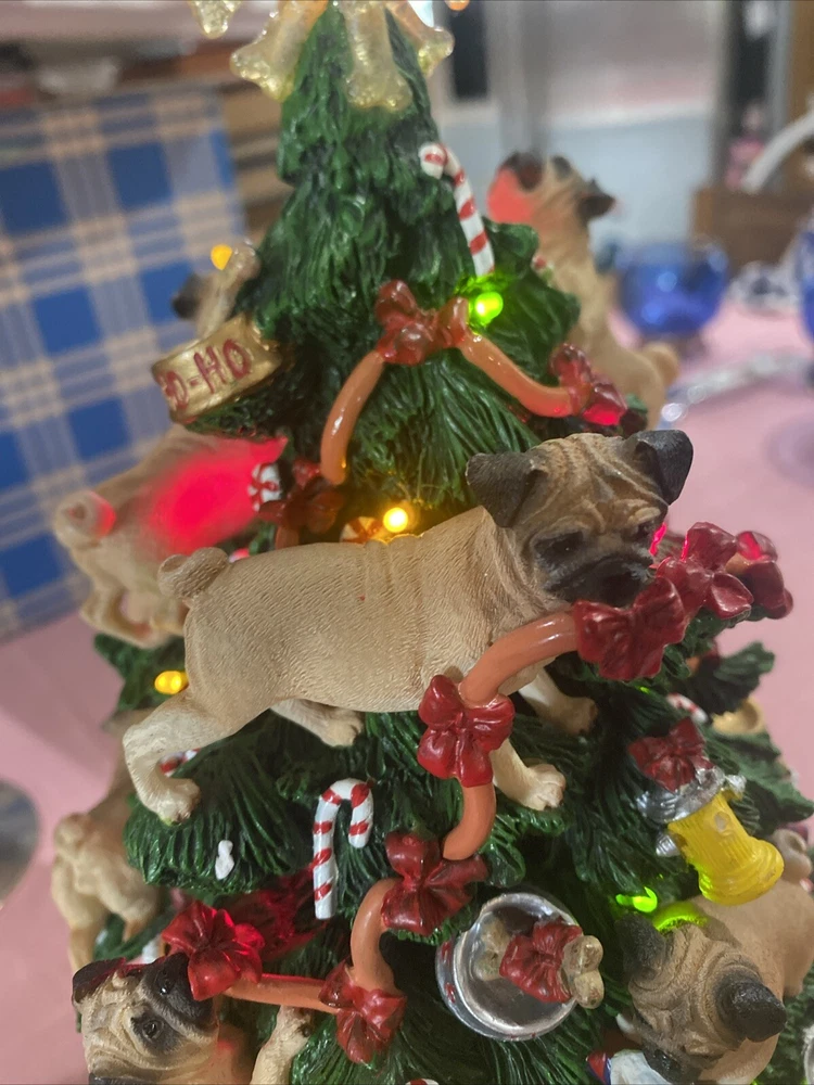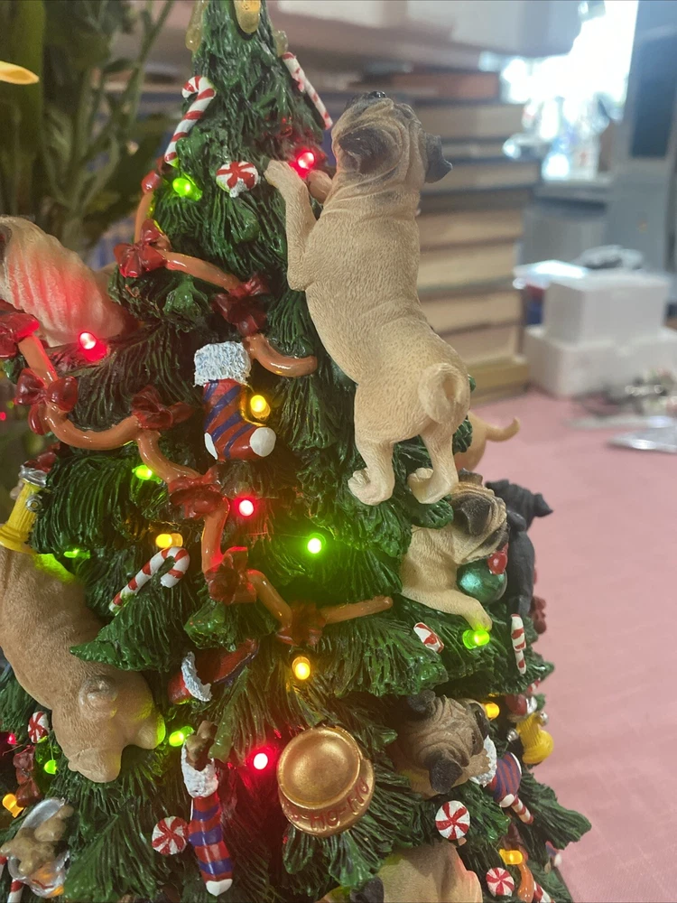 Please look at pictures pug is missing on bottom & needs gluing back but not visible and one pug has a slight chip. Please ask questions before purchasing! This Danbury Mint Pug Lighted Christmas Tree is a charming addition to your holiday decor. The mixed materials and multi-color design give it an American style that is both original and delightful. This collectible piece comes in its original box, measuring 12 inches and is perfect for any lover of decorative collectibles. The tree is in excellent working order and has not been modified from its original design. Add this lovely piece to your collection today!