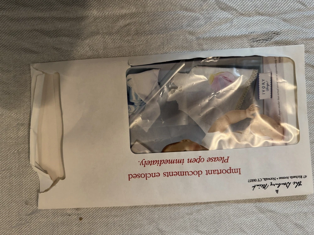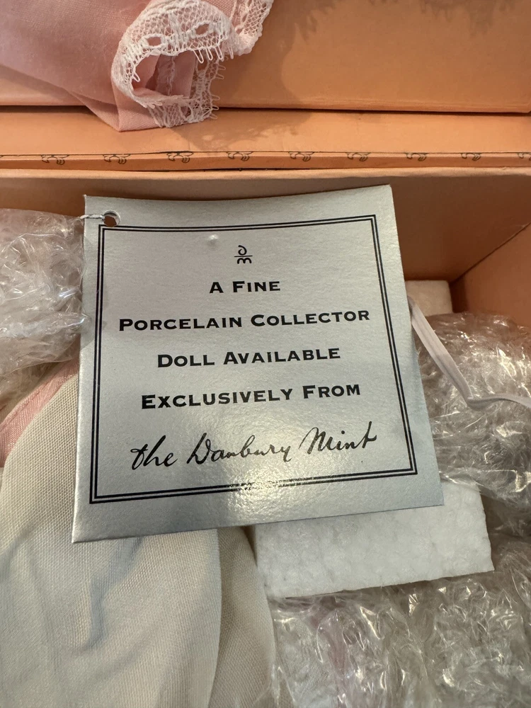 This beautiful Danbury Mint porcelain doll is a special edition. With its vintage charm and licensed reproduction status, it is a must-have for collectors. The doll has light brown hair and blue eyes, with a light complexion. It comes with a set that includes the trunk, doll itself, and many accessories including clothing. The doll comes dressed in a white and pink onesie, and has an additional pink and white dress and other clothes. The doll is made of high-quality porcelain material. It is a perfect addition to any doll collection or a great gift for someone who loves vintage dolls. This set is truly amazing for any doll collector! Certificate of Authenticity and other original paperwork included. Everything has never been removed from the box! PCL12