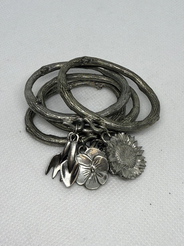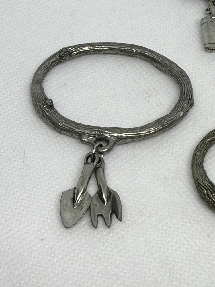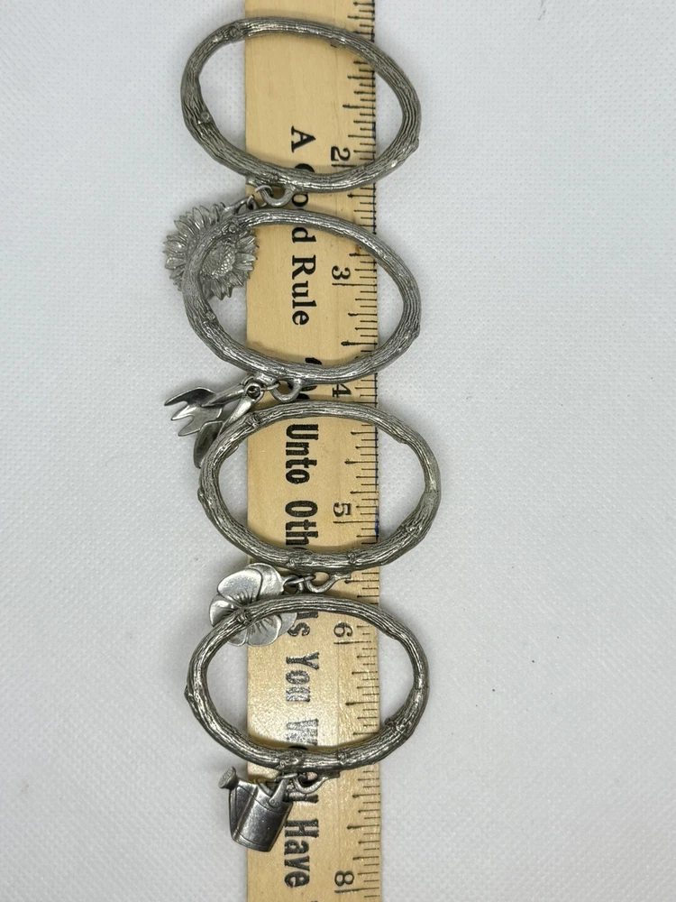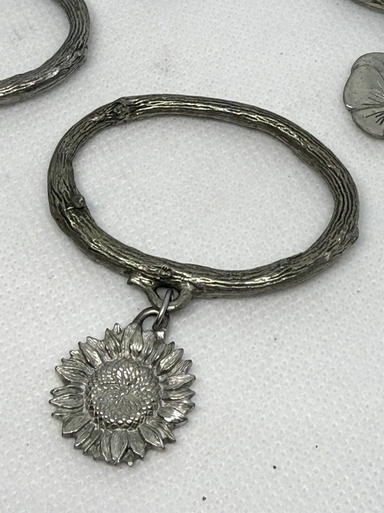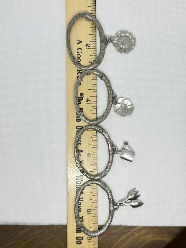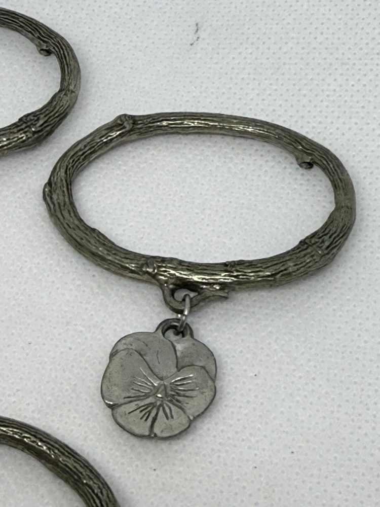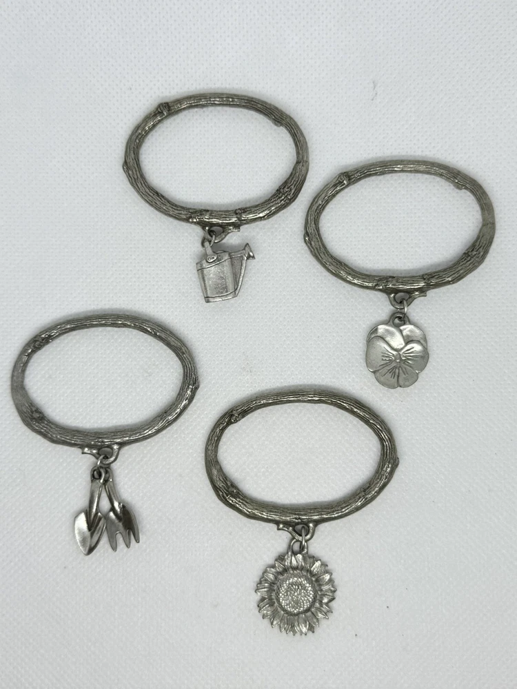 This is a set of four Danforth Pewter napkin rings featuring a gardening floral theme charm. The napkin rings are made of silver pewter and have a unique design. Perfect for adding a touch of elegance to your dining table, these napkin rings would make a charming addition to any kitchen or dining room decor.