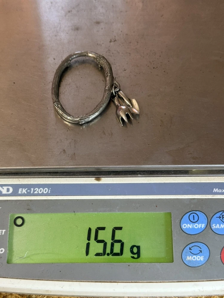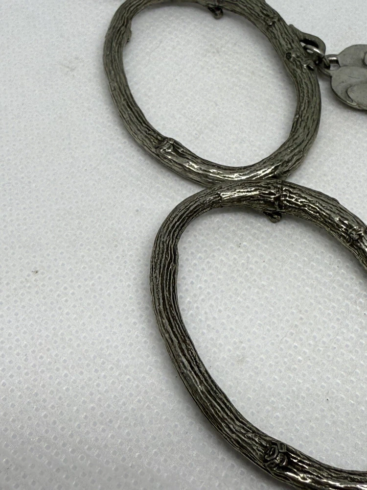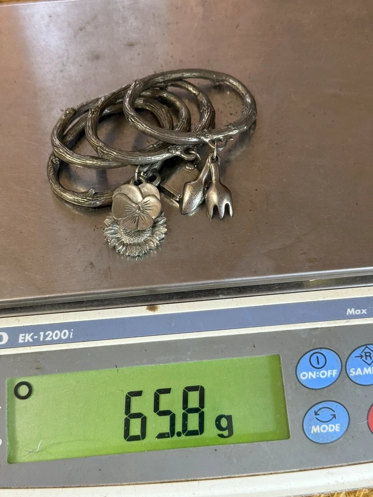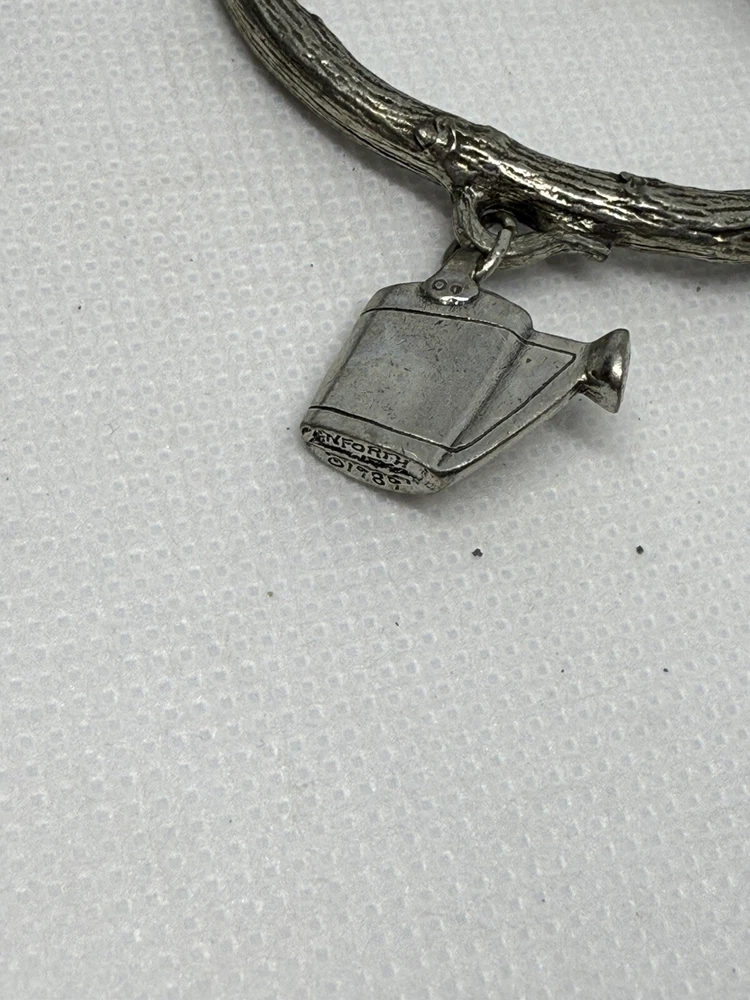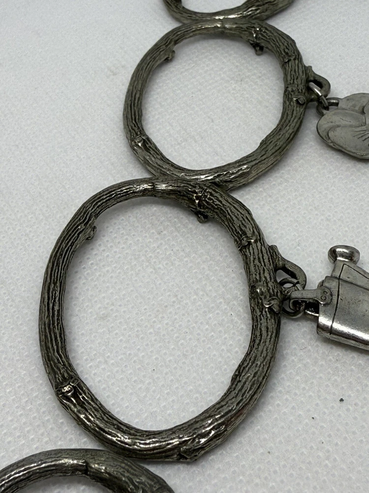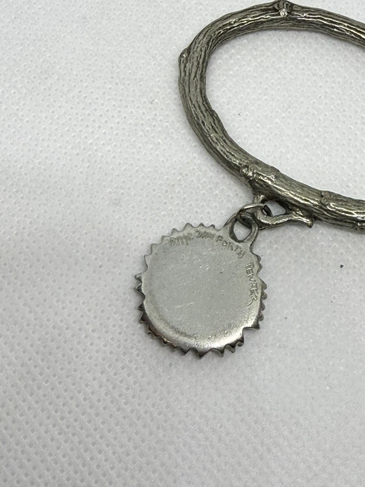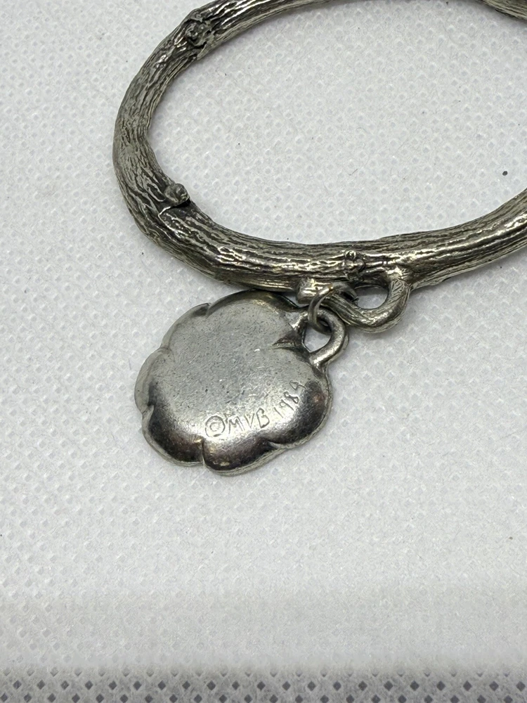 This is a set of four Danforth Pewter napkin rings featuring a gardening floral theme charm. The napkin rings are made of silver pewter and have a unique design. Perfect for adding a touch of elegance to your dining table, these napkin rings would make a charming addition to any kitchen or dining room decor.