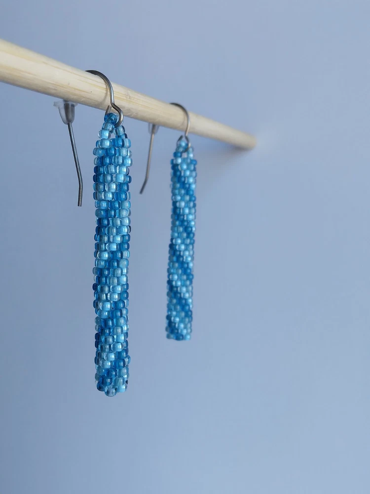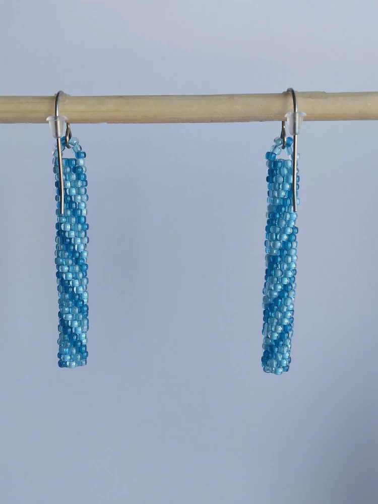 Made for any occasion such as birthdays, parties, graduations, weddings, holidays and casual or professional wear, These pairs of 57mm long, 6mm wide seed bead tube earrings are handmade using peyote stitch technique, with blue Miyuki glass seed beads arranged into a spiral design and light blue Nymo nylon thread. Earring Hooks are nickel and lead free, Pure titanium for sensitive skin hypoallergenic needs.