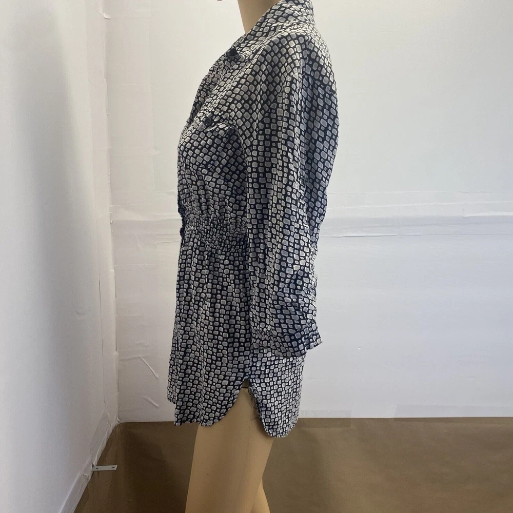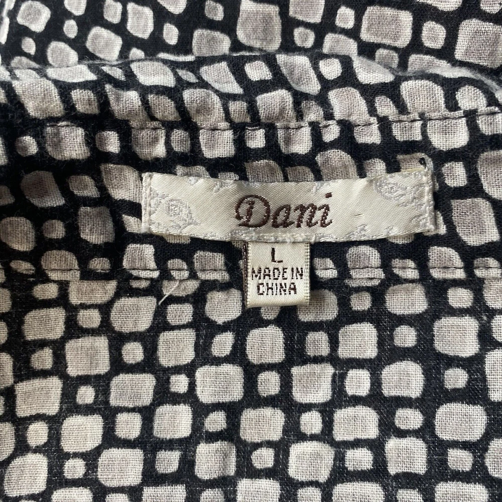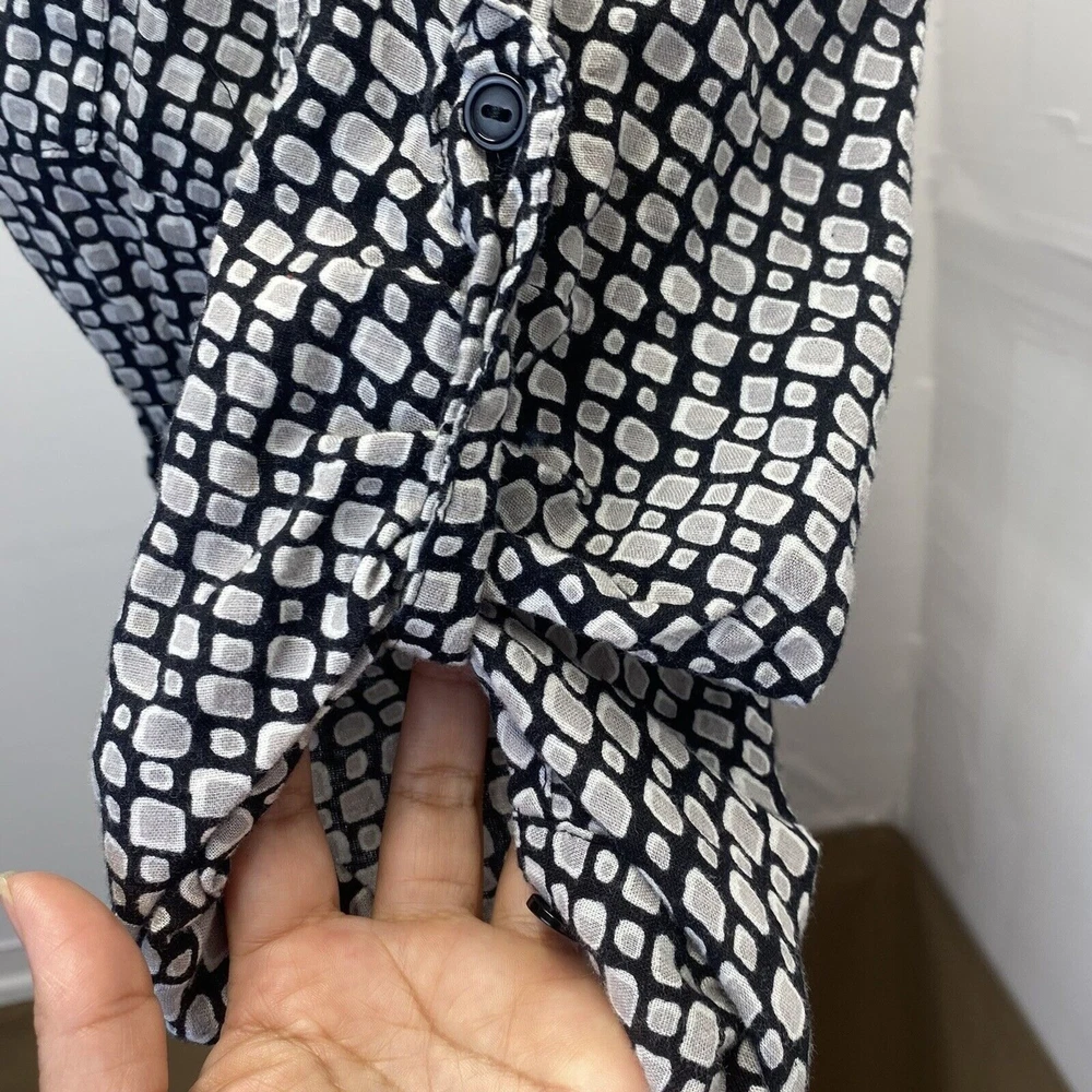 This Dani women's top is perfect for any occasion, whether it's a casual day out or a special event. The black geometric pattern and collared neckline give it a stylish look, while the 1/4 sleeves and cuffs add a touch of elegance. The elastic waist and button closure make it easy to wear and comfortable all day long. The top also features pockets, making it practical and functional for everyday use. It's made of a soft and comfortable fabric, a blend of rayon and cotton, and is machine washable for easy care. Whether you're traveling, going to a wedding, or just running errands, this top is a great addition to your wardrobe. in good condition, comes from a smoke and pet free place, check the photos for more information, you can contact us if you have questions. Please note that some photos may not show accurate shades.