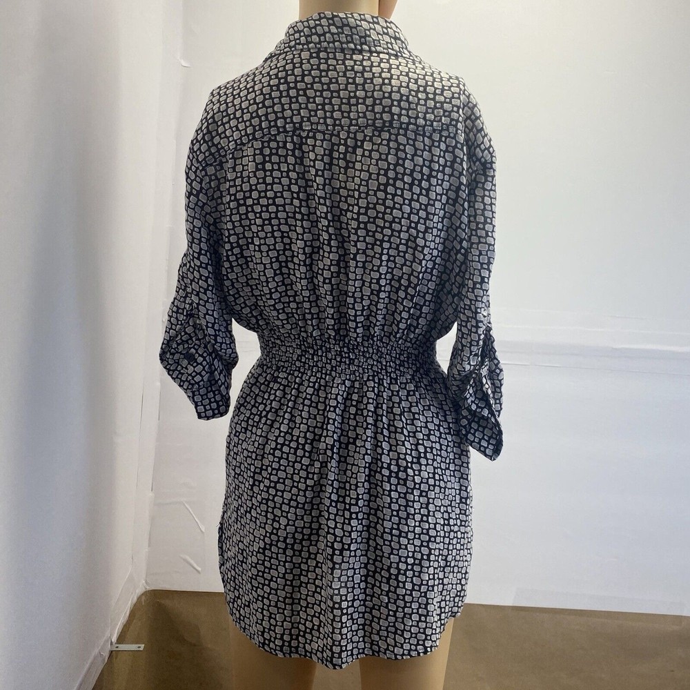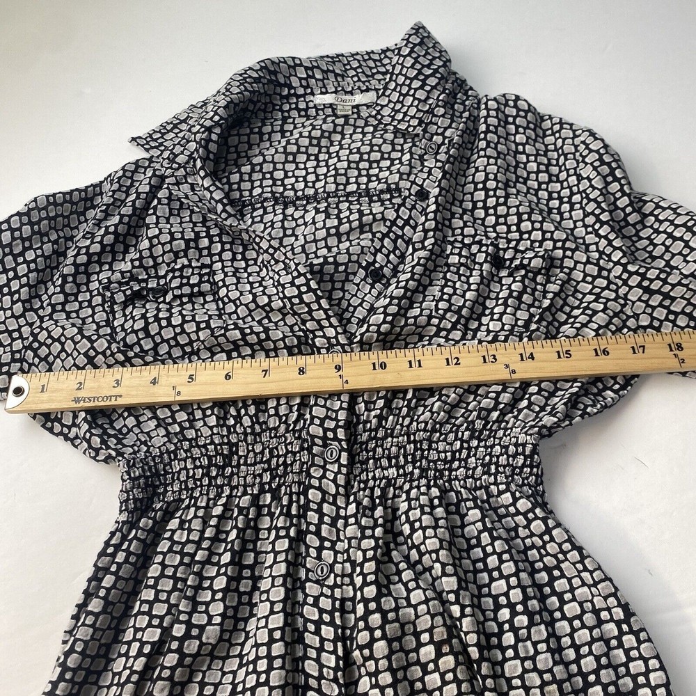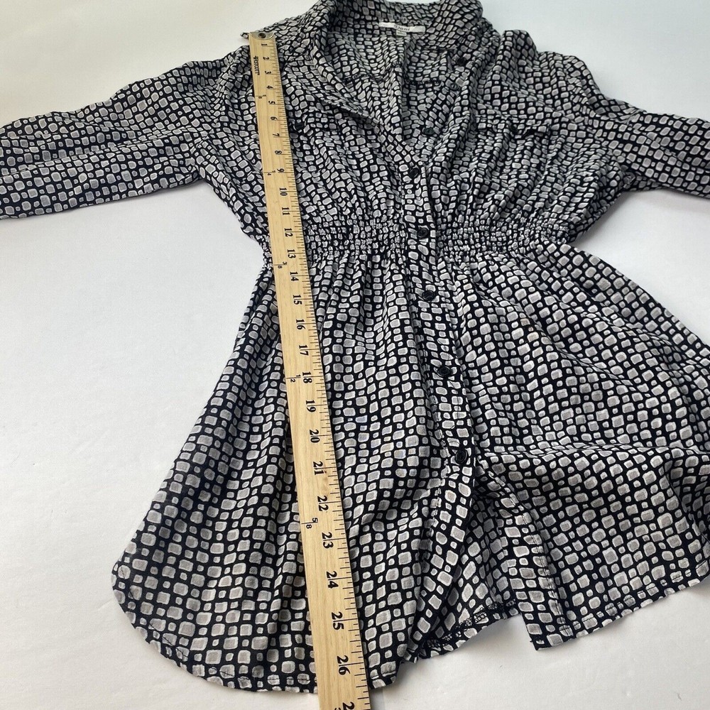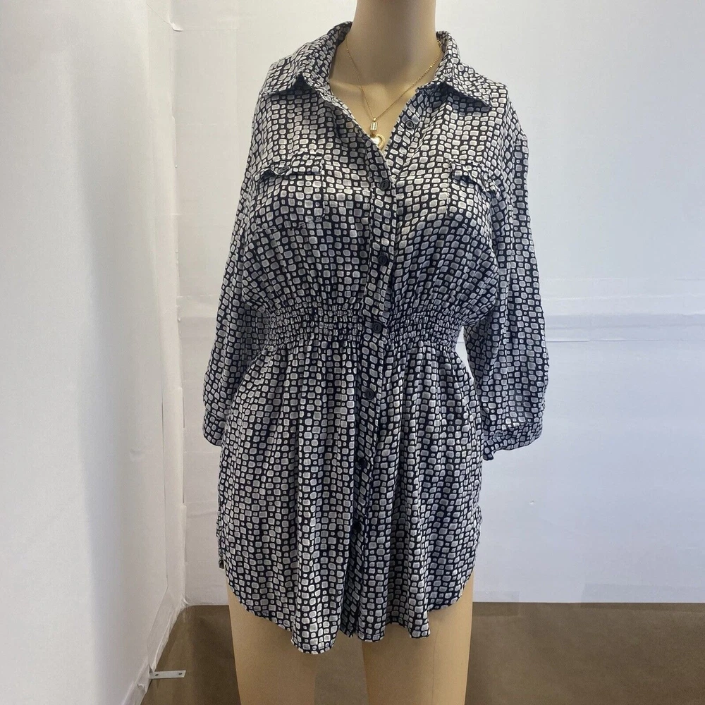This Dani women's top is perfect for any occasion, whether it's a casual day out or a special event. The black geometric pattern and collared neckline give it a stylish look, while the 1/4 sleeves and cuffs add a touch of elegance. The elastic waist and button closure make it easy to wear and comfortable all day long. The top also features pockets, making it practical and functional for everyday use. It's made of a soft and comfortable fabric, a blend of rayon and cotton, and is machine washable for easy care. Whether you're traveling, going to a wedding, or just running errands, this top is a great addition to your wardrobe. in good condition, comes from a smoke and pet free place, check the photos for more information, you can contact us if you have questions. Please note that some photos may not show accurate shades.