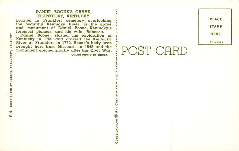 DANIEL BOONE'S GRAVE, FRANKFORT, KENTUCKY, Frank Postcard