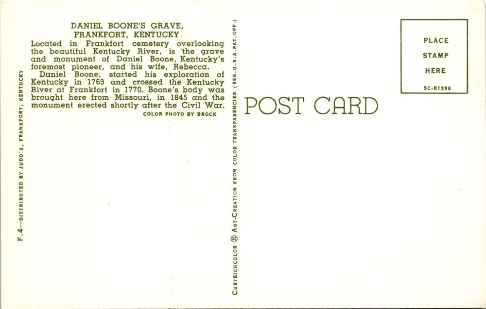 MAKE AN OFFER. THE MORE YOU BUY THE BETTER DEAL I WILL ACCEPT The postcard features a color photo of Daniel Boone's grave in Frankfort, Kentucky. Daniel Boone was a prominent pioneer known for exploring Kentucky starting in 1769 and crossing the Kentucky River at Frankfort in 1770. His grave, along with his wife Rebecca's, is located in Frankfort Cemetery overlooking the Kentucky River.