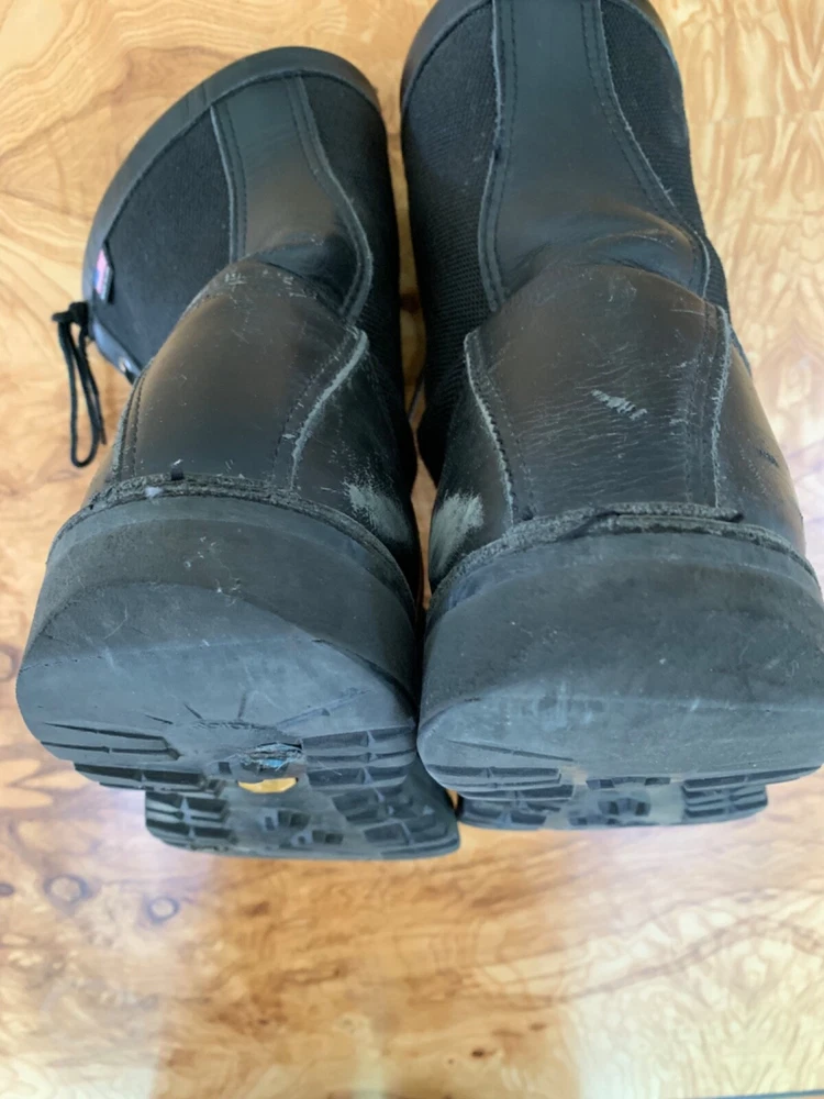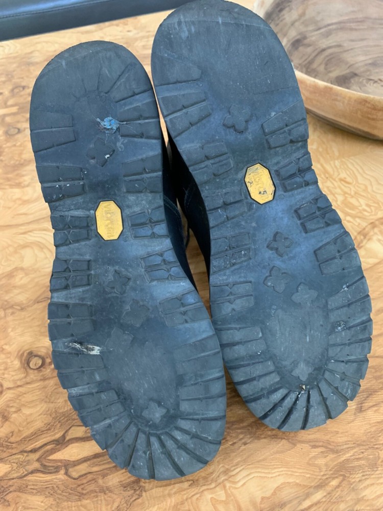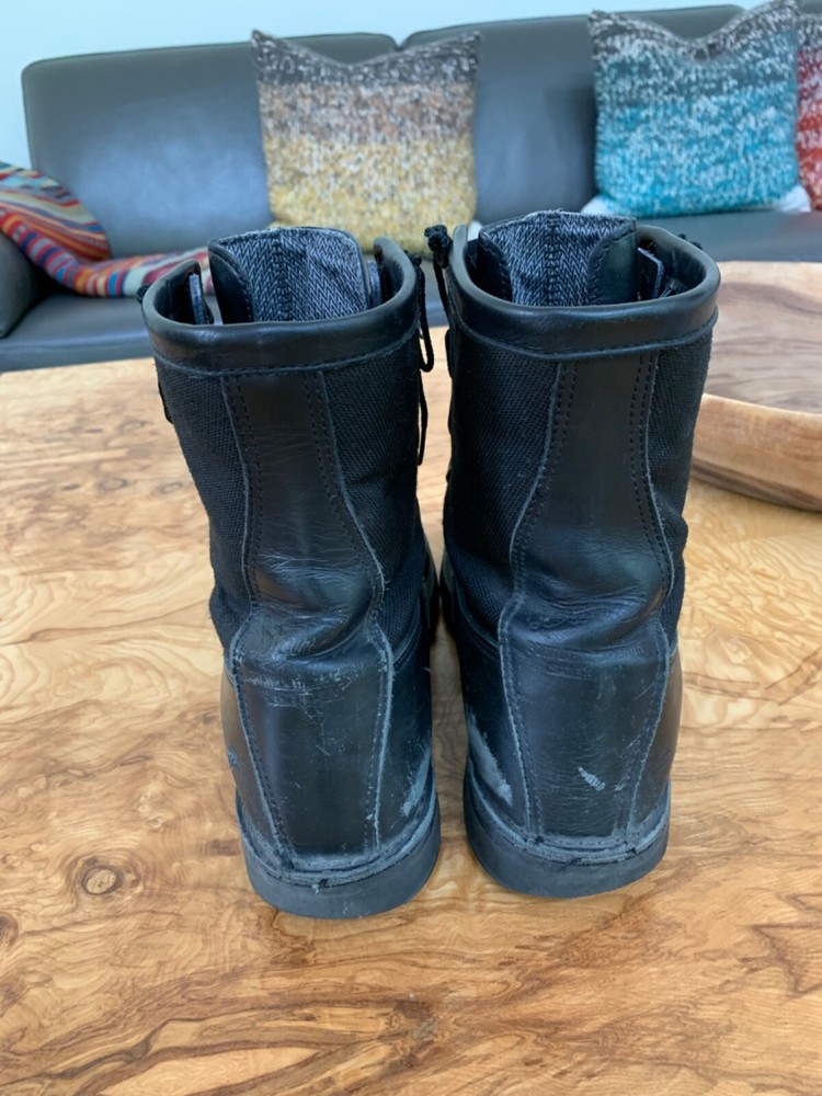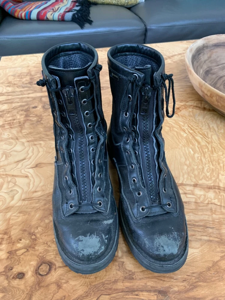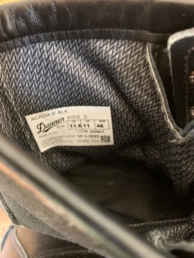 For sale are my husbands Danner Acadia 8" black boots in very pre-loved condition. He purchased the removable "Danner" zipper which can be removed if you prefer laces. These shoes can be recrafted by Danner. Feel free to email me with any questions. SPECIFICATIONS FROM DANNER: Rock Solid in Unstable Situations Made in the USA, the Acadia features Danner's famous stitchdown construction, providing a more stable platform underfoot and superior durability. This boot has a waterproof, breathable GORE-TEX lining and a combination upper of 1000 Denier nylon and full-grain leather. The Vibram Kletterlift outsole provides superior shock absorption and great traction on both wet and dry surfaces. Full-Grain Polishable Leather & 1000 Denier Nylon Upper To reduce the weight of the boot, we combine our smooth, full-grain leather with incredibly strong 1000 Denier nylon. This durable upper is completely polishable. GORE-TEX (GTX) 100% waterproof and breathable, GORE-TEX liners ensure that no water gets in, while allowing sweat and moisture to get out. Vibram® Kletterlift Outsole Specifically designed for comfort and durability; the heel provides superb shock absorption and the rubber compound guarantees great traction and stability on both wet and dry surfaces. This classic Specifications Style 21210 Weight 65 oz per pair Closure Lace-Up Height 8" Insulation Non-Insulated Color Black Traction Oil & Slip Resistant Footbed Airthotic Shank Fiberglass Kletterlift outsole is oil- and slip-resistant Kletterlift outsole is oil- and slip-resistant with low lugs for urban environments. It also features the Vibram TC4T compound for added durability. Stitchdown Construction Handcrafted to provide a wider platform, our legendary stitchdown construction offers increased stability underfoot. Many of our stitchdown boots can be recrafted. How It Fits The 650 last offers a sleek, slender profile with a more narrow fit. Boots on this last tend to fit those with a more narrow foot better than those with a wider foot. This ensures a snug fit for terrain and activities that demand support and stability. If you do have a wider foot, we recommend ordering an "EE" (wide) in this style. Please note this last fits slightly long and we recommend sizing down a half size for best fit. Recraftable Extend the life of your boot with our recrafting services. This boot is eligible for a number of paid services, including part replacement, leather care and restitching. See our Recrafting page. ( /boot-recraftin g/)