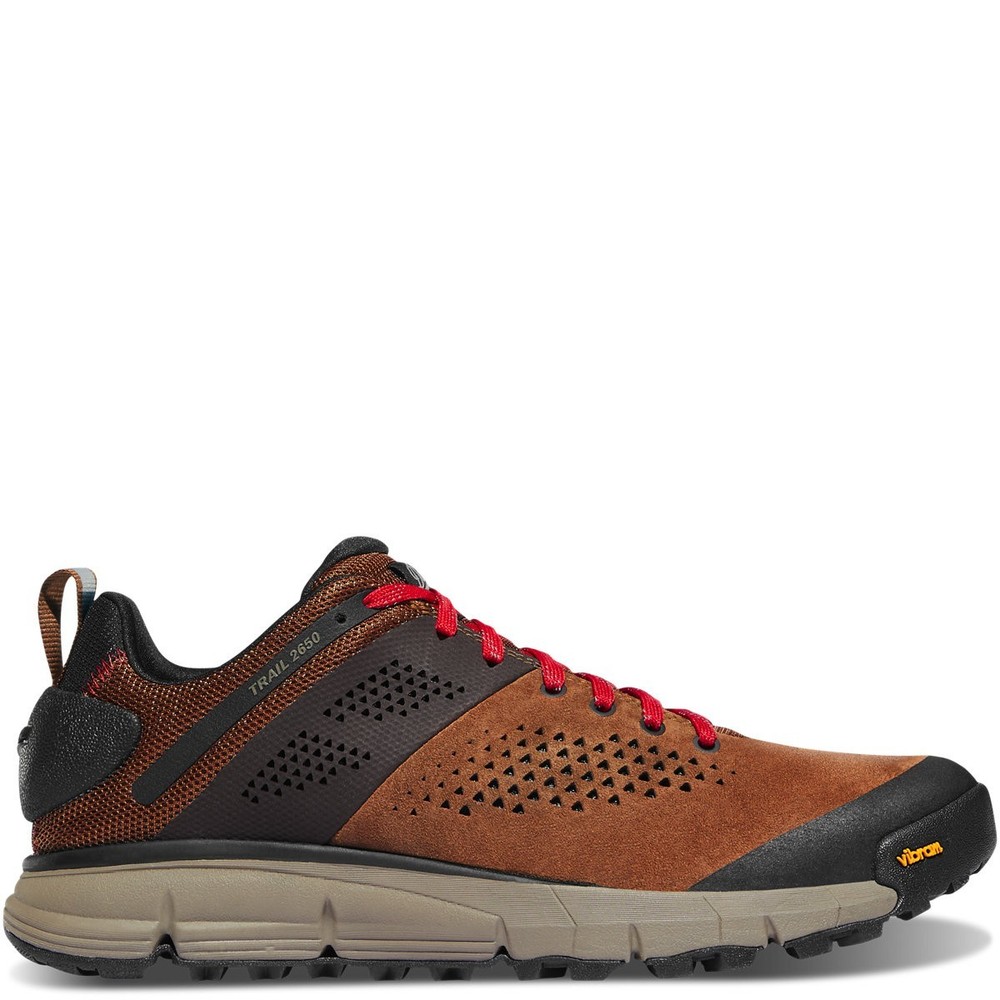 Tread lighter With 2,650 miles, the Pacific Crest Trail provides a wide variety of terrain over its epic expanse. Whether you’re out for the weekend, a few miles or are looking to get some serious mileage, the PCT has something for you. It’s that need for versatility that inspired our Trail 2650. Built to move quickly and confidently through the terrain of your choosing, the Trail 2650 can easily fill the role of a lightweight hiker or trainer. Using a Trailguard TPU shank and an EXO Heel System, the Trail 2650 is both lightweight and provides stability on challenging grounds. Specifications Style 61272 Weight 24 oz per pair Closure Lace-Up Height 3" Insulation Non-Insulated Color Brown/Red Footbed OrthoLite Shank TPU Heel-to-Toe Drop 8mm Last Type DT-6 Lining Non-Waterproof Liner Mesh Outsole Vibram® 460 Recraftable No Country of Origin Vietnam Manufacturing Imported Suede & Textile Upper We combine a durable suede with a lightweight textile to create an upper with modern performance and timeless Danner® durability. Mesh Lining Lightweight and breathable for total foot comfort. Removable OrthoLite Footbed Multiple layers of varying density are combined for maximum cushioning and support. The entire footbed is made of open-cell polyurethane for better heat dissipation and air circulation. Danner PlyoGo Midsole Ultra-lightweight EVA provides excellent cushioning with optimal weight savings. Vibram® 460 Outsole Self-adapting lugs and Vibram’s specially formulated Megagrip compound provide long-wearing resilience with incredible grip on both wet and dry surfaces. EXO Heel System The lightweight EXO Heel System provides a comfortable, secure fit via an external heel counter. Danner Trailguard Lightweight and supportive, the Trailguard TPU shank provides stability and underfoot protection on rough, uneven terrain. How It Fits Inspired from trail running, the DT6 last features an 8mm offset from heel to toe with slightly more width in the forefoot for stability and a good-looking, everyday-wearable aesthetic. 365-Day Warranty If you suspect your purchase isn’t up to our unrelenting standards, or is defective in any way, we want to make things right. We offer a 365-day warranty across our entire footwear and apparel lines.