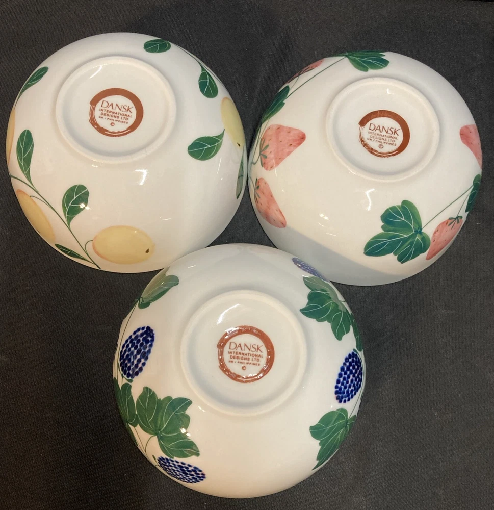 The set of 3 Dansk cereal bowls features a berries pattern: blackberry, strawberry, and peach. Each bowl has a diameter of 5.25 inches and a height of 2.25 inches. The set is pre-owned and comes in good, clean condition with no chips, cracks, or breaks. Please see pictures for details. If you have any questions or concerns, please do not hesitate to contact us. Check out our other items and message us if interested in more than one listing as combining items could save you money on shipping.
