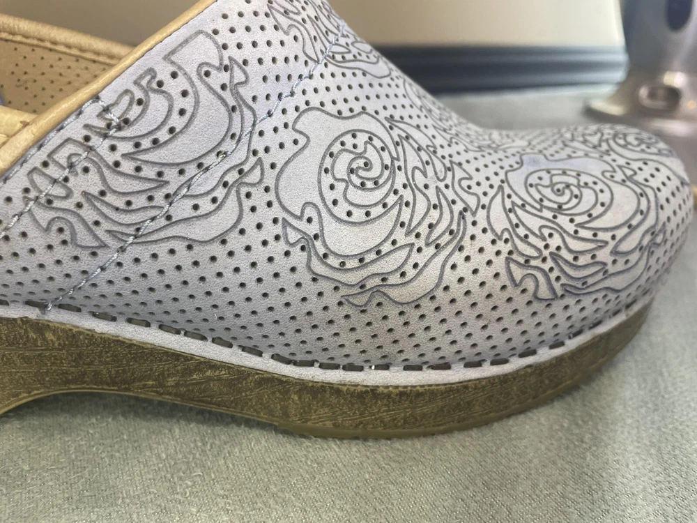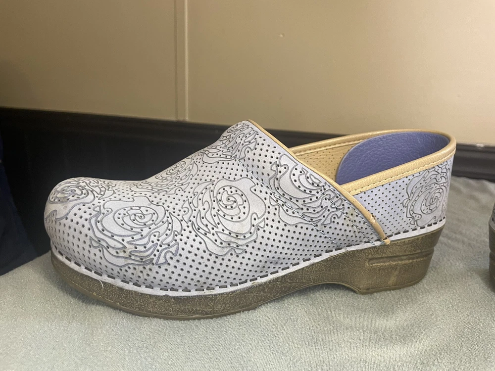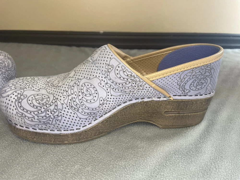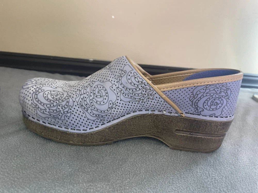 Dansko clogs are perfect for women who want both style and comfort. These blue suede clogs feature a round toe shape, slip-on closure, and a mid-height rocker heel style. The shoes are cushioned and have a comfortable feel, making them suitable for casual and workwear occasions. The clogs are perforated with a floral pattern, which adds a touch of bohemian and classic style to them. These shoes are handmade in China and are available in a standard shoe width. They are perfect for walking and are available in all seasons, including winter, summer, fall, and spring. The lining material is leather, and the upper material is also leather. These shoes are a great addition to any wardrobe and are perfect for those who want a comfortable and stylish pair of shoes.