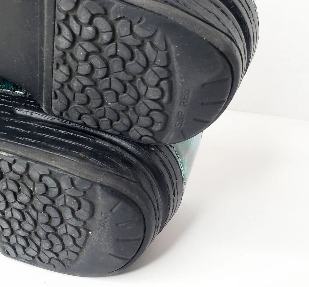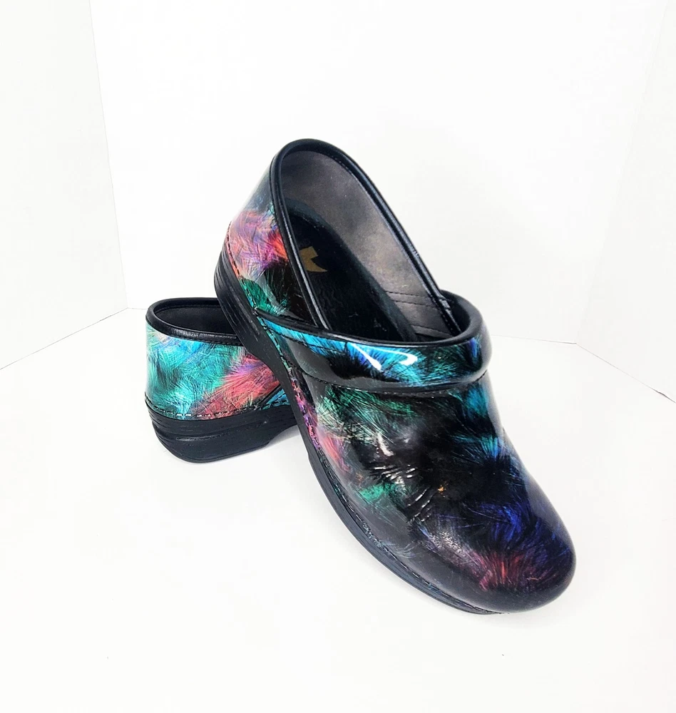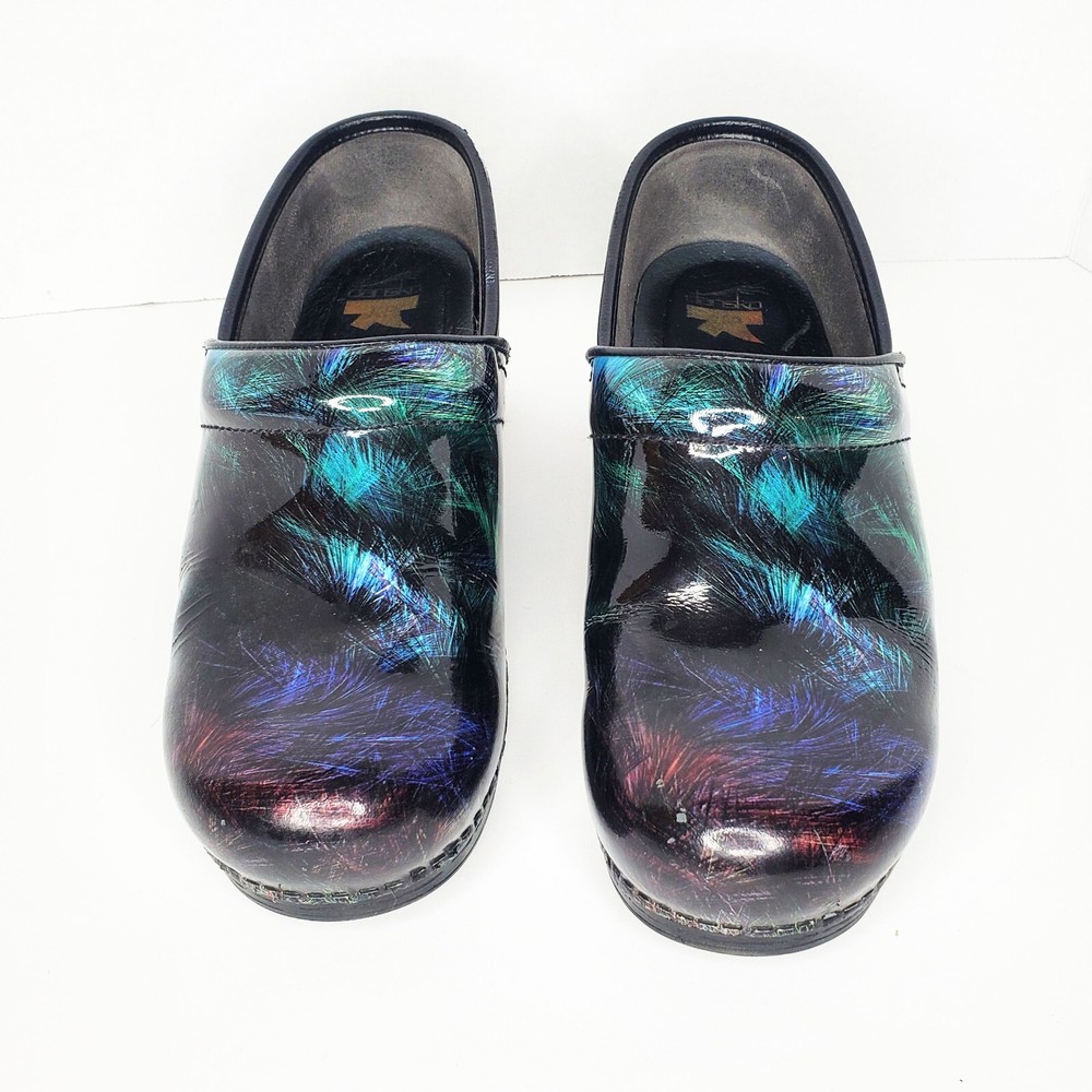 Dansko Patent Leather Multicolored Slip On Clog Comfort Nurse Shoes 41 US 10.5 Does have some wear. Please see photos. These shoes still have a lot of life left in them Slip Resistant Length heel to toe; 11 inches Width at wides part; 3.5 inches Heel height: 1.5 inches 19-3279