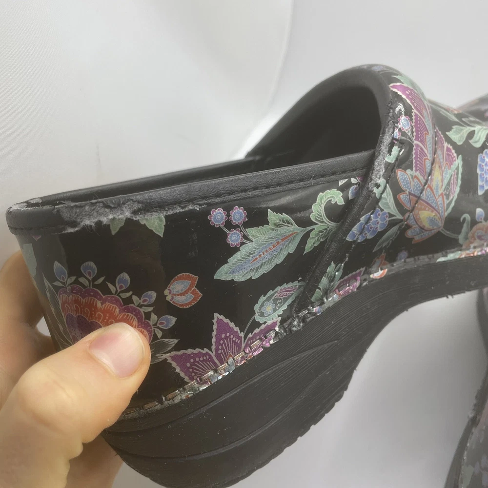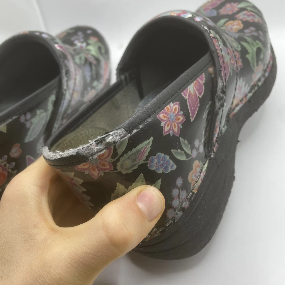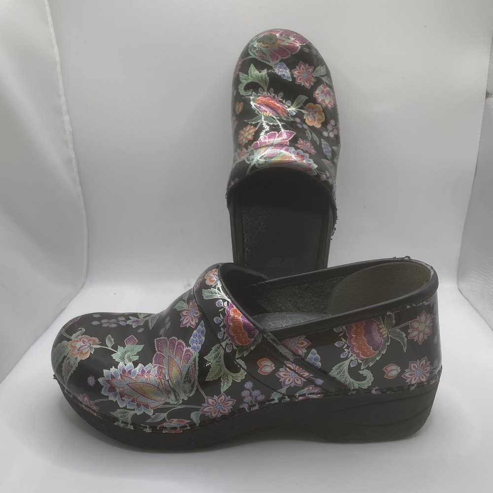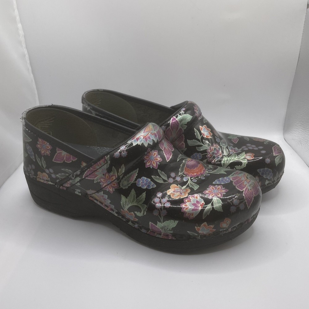 Dansko 38 Women’s Clogs Floral Pattern Slip On Shoes Multicolor Leather Upper Has some wear (see pictures for condition) Size 38 (US 7.5-8 Womens) I have added a size chart in the photos as well.