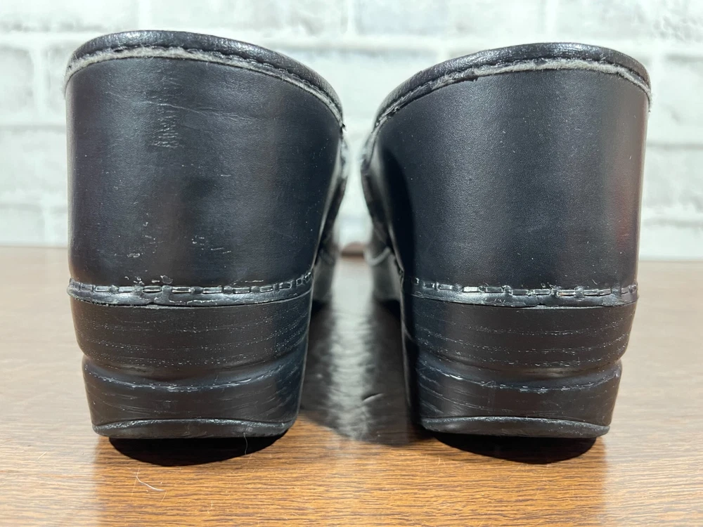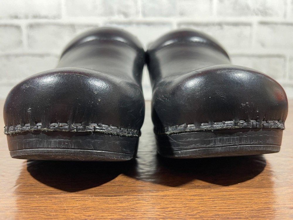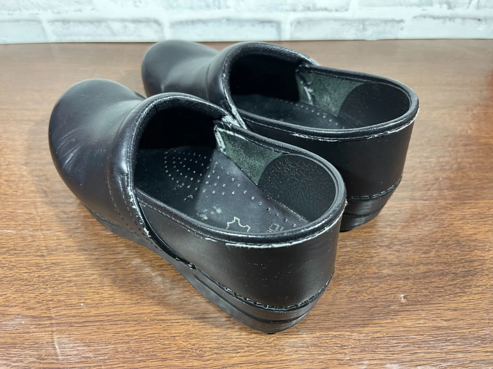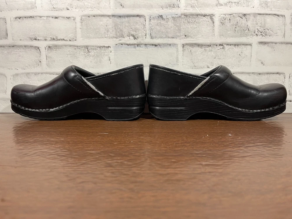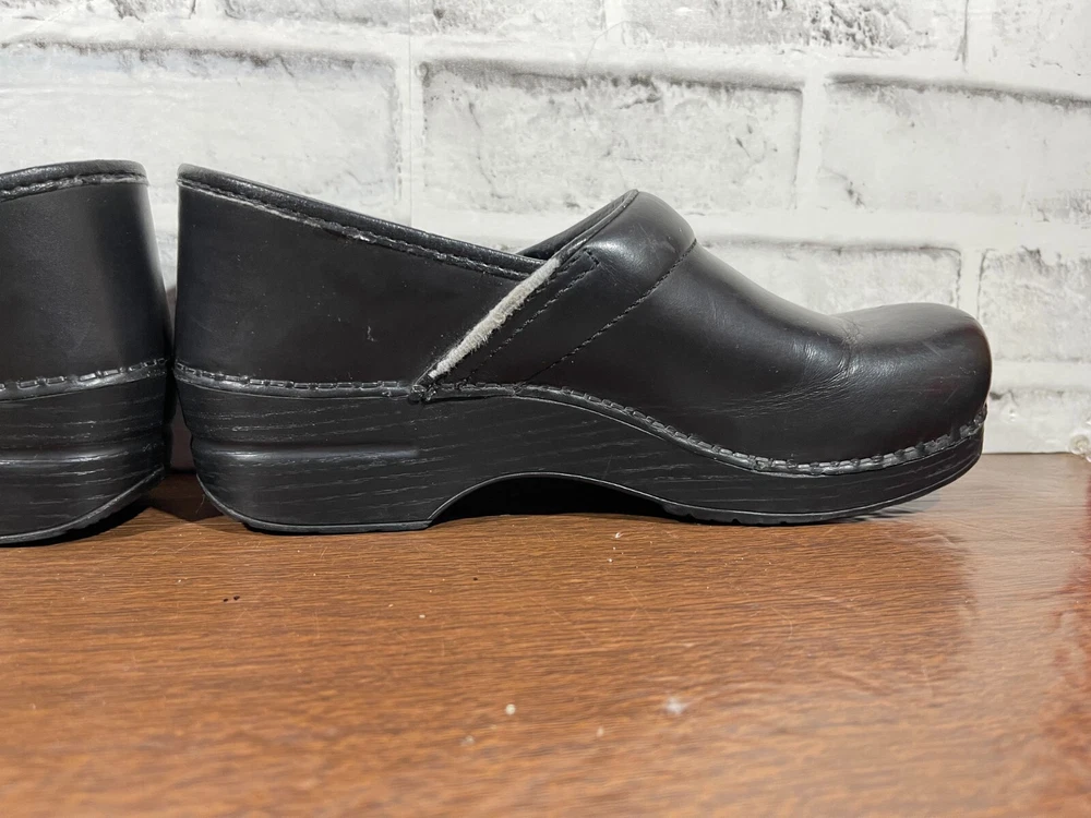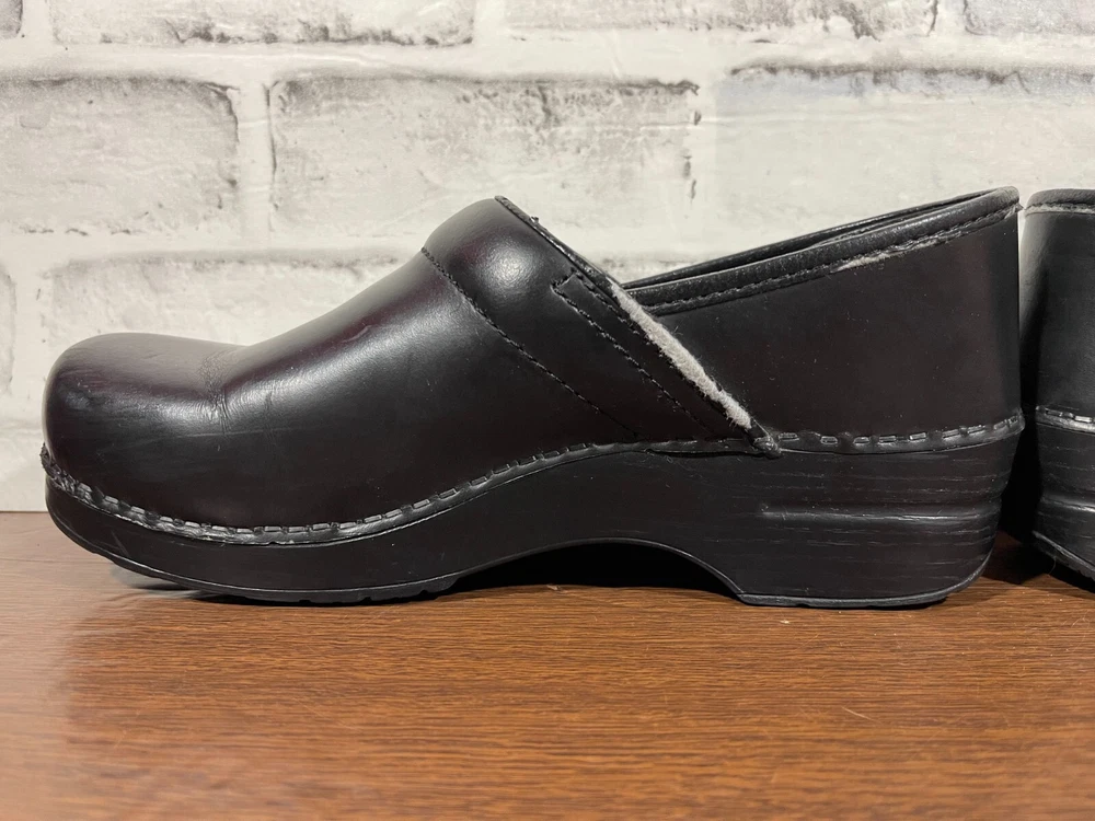 Elevate your professional workwear with these stylish and comfortable Dansko slip-on clogs. Crafted from high-quality leather, these black slip-resistant shoes feature a round toe and a low top shoe shaft style, making them perfect for travel, casual outings, and workwear. The slip-on closure provides easy wear, while the wedge heel style adds a touch of elegance. These women's shoes are designed for comfort and performance, making them ideal for winter, summer, fall, and spring. The solid pattern and sleek design of these slip-on clogs make them a perfect addition to any wardrobe. Whether you're running errands or working at the office, these Dansko shoes will provide you with the style and comfort you need. Good condition with normal preowned wear as pictured. There is also noticable wear on the collars on the inner sides of the shoes as pictured. Please see all photos. All clothing and shoes have been washed/cleaned, and comes from a smoke free environment. If shoe trees appear in the photos, they are for photography purposes only to illustrate how the shoes look filled out, and are not included. I am available for questions. I accept or negotiate reasonable offers. Have an amazing day. Thank you.