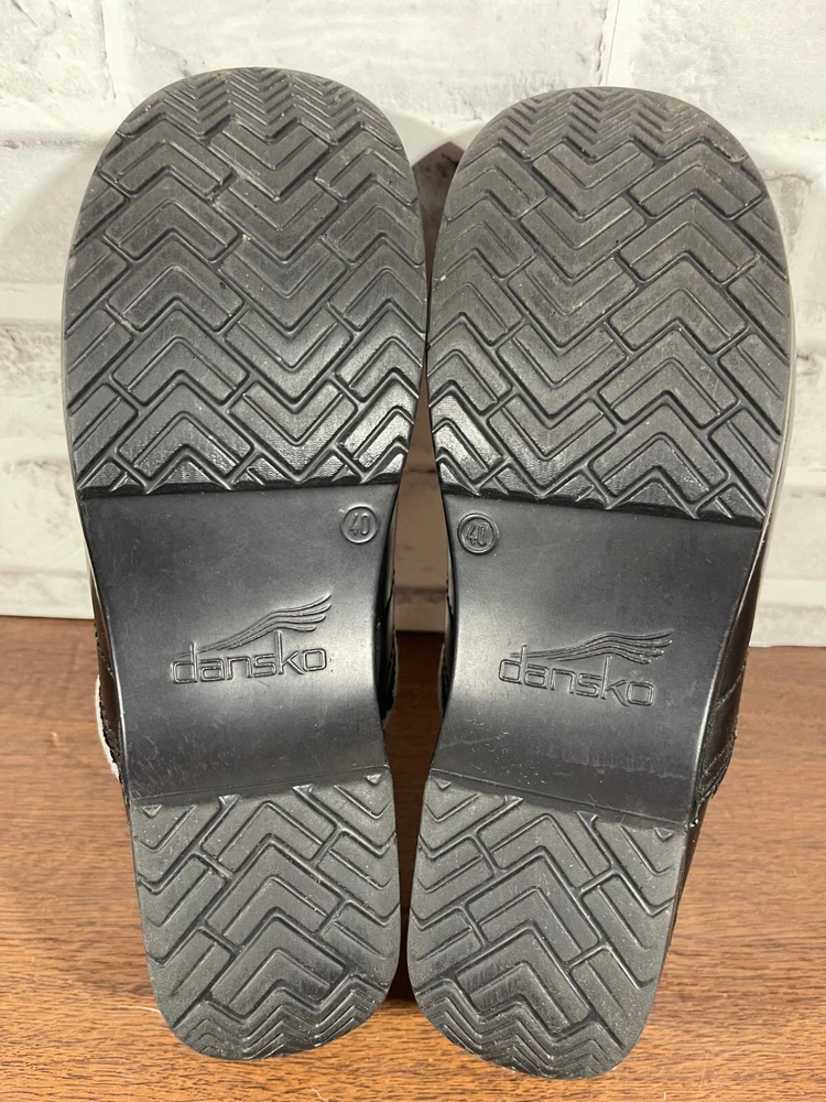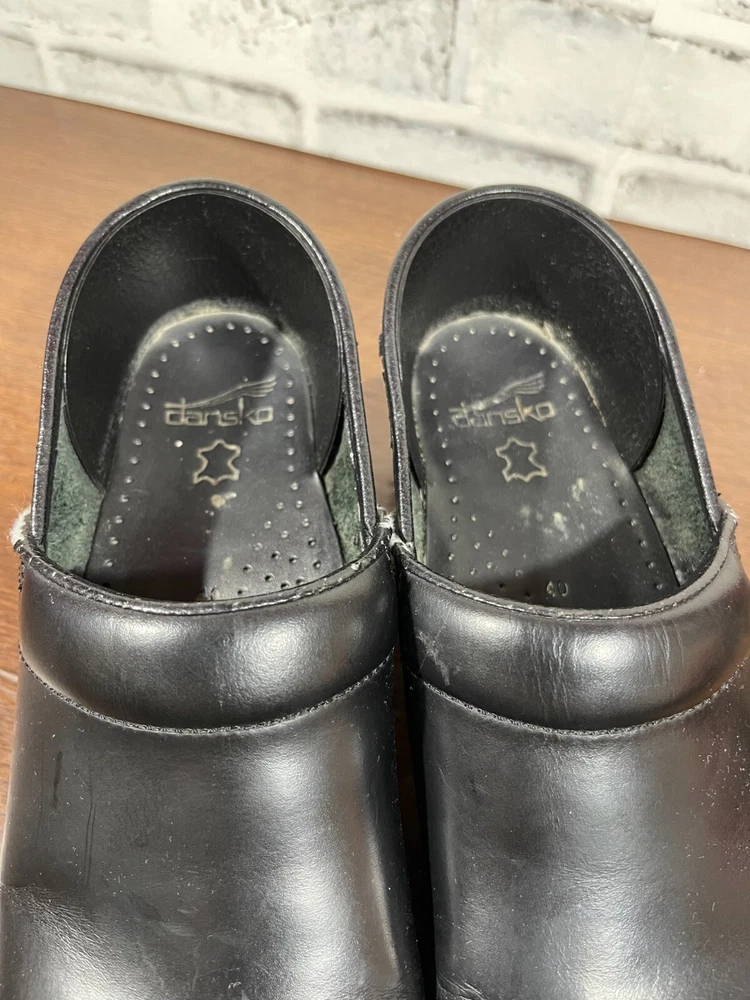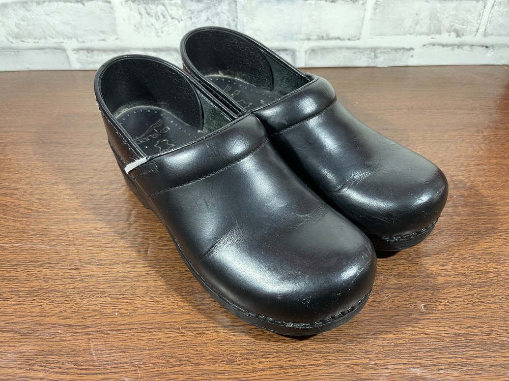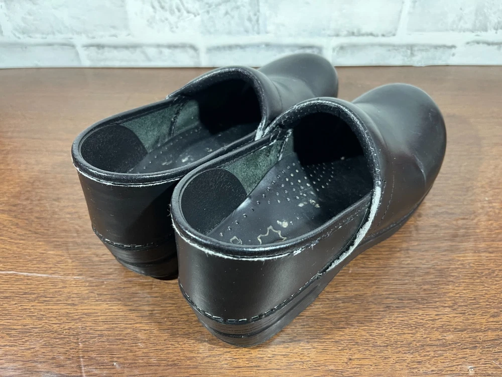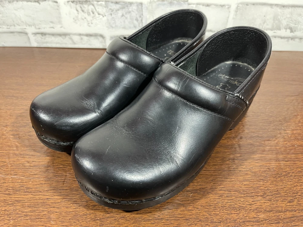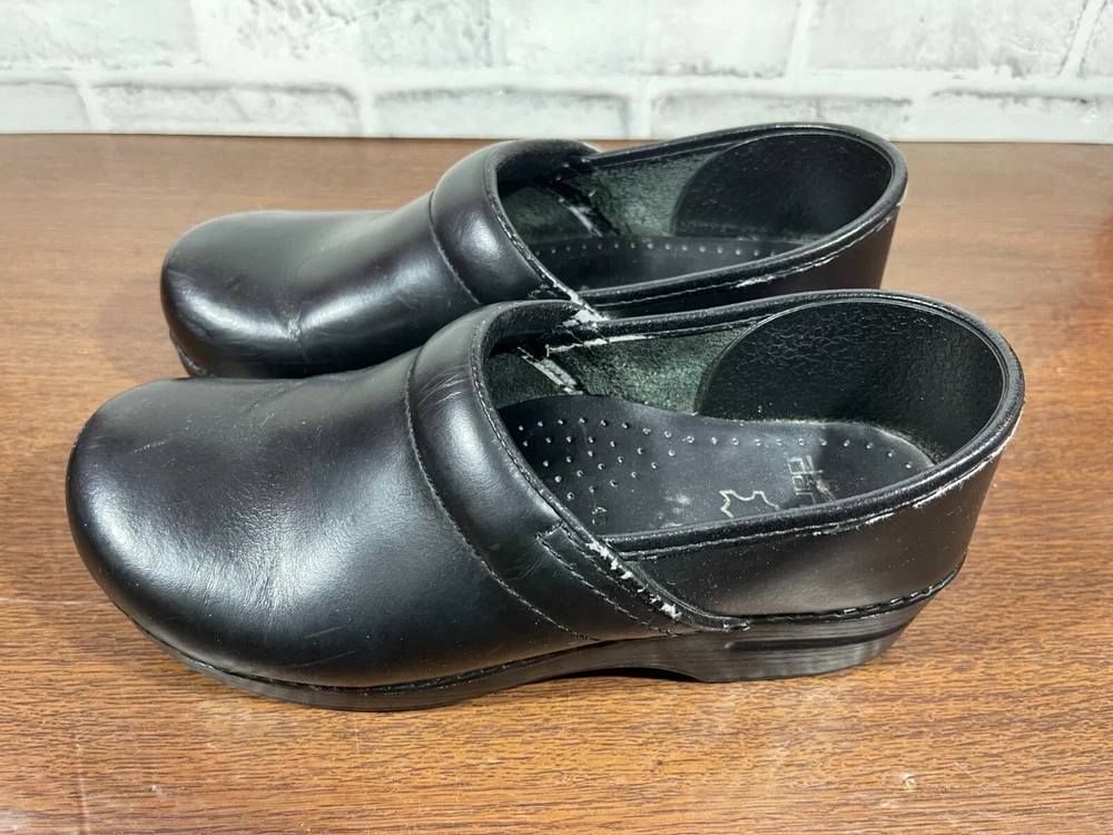 Elevate your professional workwear with these stylish and comfortable Dansko slip-on clogs. Crafted from high-quality leather, these black slip-resistant shoes feature a round toe and a low top shoe shaft style, making them perfect for travel, casual outings, and workwear. The slip-on closure provides easy wear, while the wedge heel style adds a touch of elegance. These women's shoes are designed for comfort and performance, making them ideal for winter, summer, fall, and spring. The solid pattern and sleek design of these slip-on clogs make them a perfect addition to any wardrobe. Whether you're running errands or working at the office, these Dansko shoes will provide you with the style and comfort you need. Good condition with normal preowned wear as pictured. There is also noticable wear on the collars on the inner sides of the shoes as pictured. Please see all photos. All clothing and shoes have been washed/cleaned, and comes from a smoke free environment. If shoe trees appear in the photos, they are for photography purposes only to illustrate how the shoes look filled out, and are not included. I am available for questions. I accept or negotiate reasonable offers. Have an amazing day. Thank you.