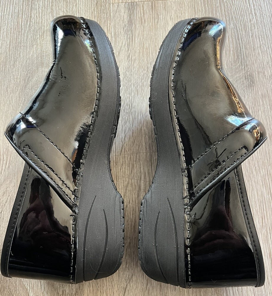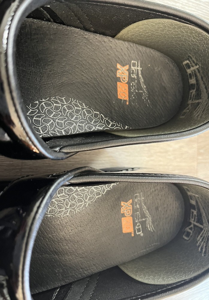 The Dansko XP 2.0 Patent Leather Clogs in black are designed for women in size EU 38/US 7.5. These slip-resistant clogs feature a round toe, mid heel height, and comfortable block heel style. They are ideal for casual or workwear occasions, with a classic style and logo accents. Made with patent leather upper material, leather lining, and rubber outsole, these clogs provide both style and functionality for walking activities. Perfect for all seasons, these Dansko Professional clogs offer a standard shoe width and are a timeless addition to any wardrobe. Awesome shoe. Like new!!!!! Comfortable!!!
