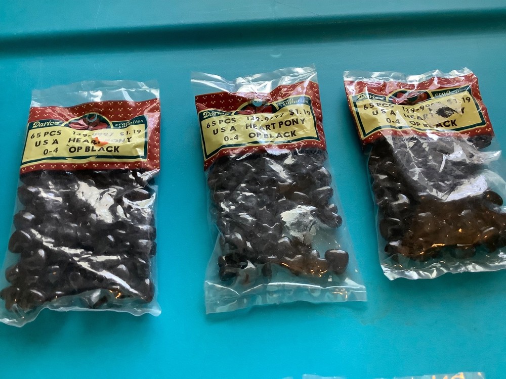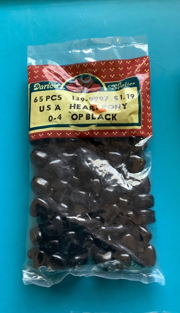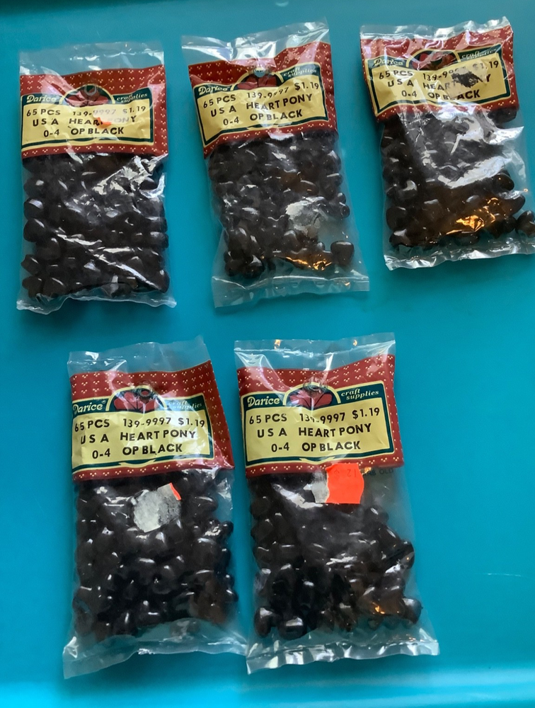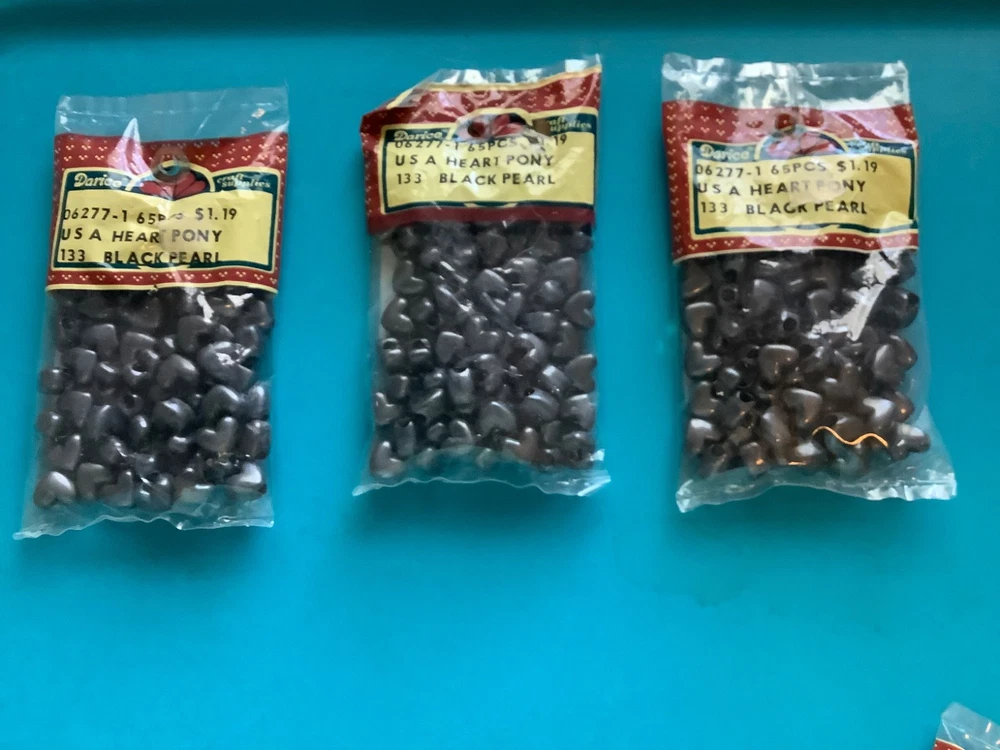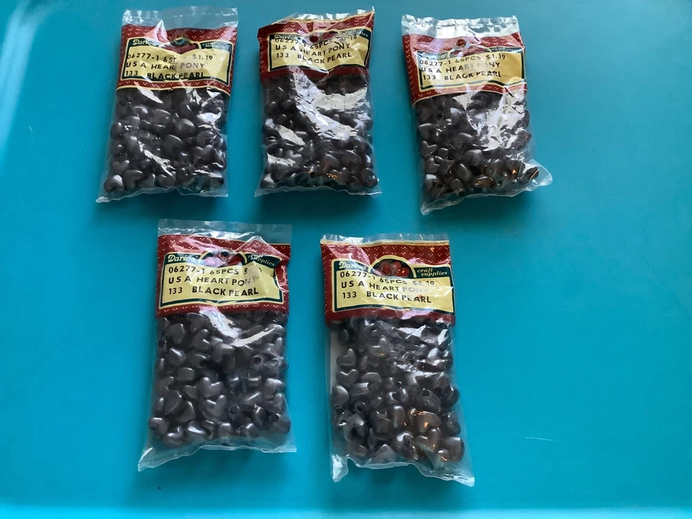 Darcie vintage Black Heart Pony Beads USA NEW 325 pieces LOT NEW 5 packages Heart Pony Beads 139-9997 USA 04 OP black 65 pieces per bag = 325 beads Please ask questions, no returns please, no international shipping If you find something wrong, please contact me first. ***Check out other beads listed and other items; I will combine shipping. Please let me know what you want to combine for shipping.