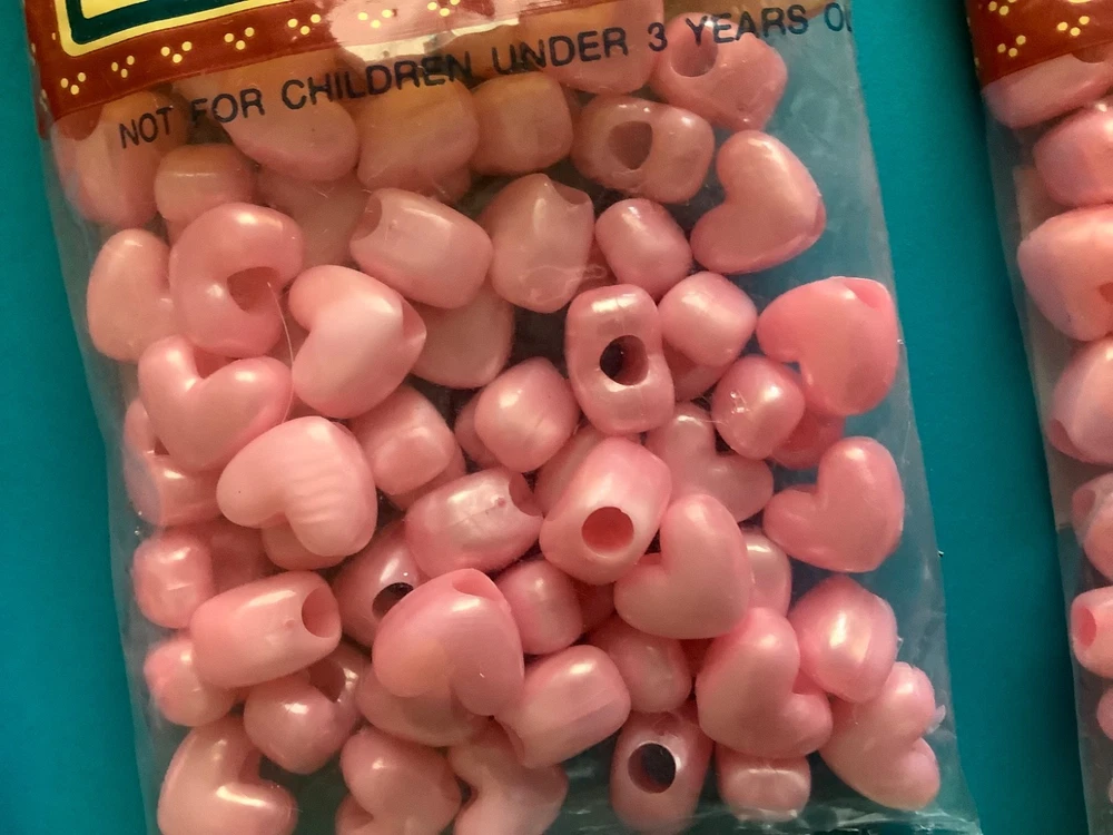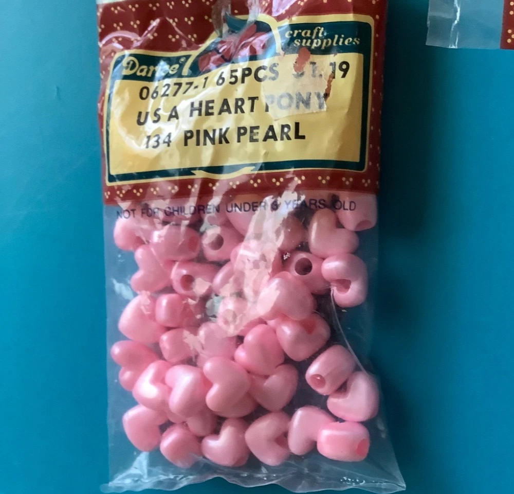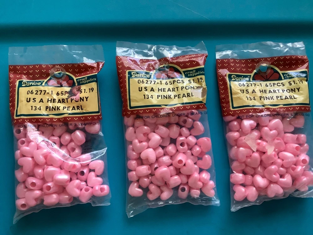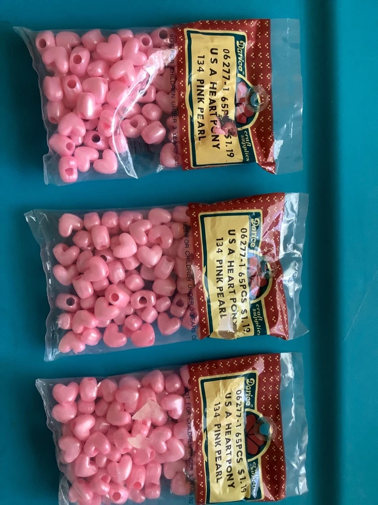 Darcie vintage pink pearl Heart Pony Beads USA NEW 325 pieces LOT NEW 5 packages Heart Pony Beads 06-2271 USA 134 - Pink Pearl 65 pieces per bag = 325 beads Please ask questions, no returns please, no international shipping If you find something wrong, please contact me first. ***Check out other beads listed and other items; I will combine shipping. Please let me know what you want to combine for shipping.