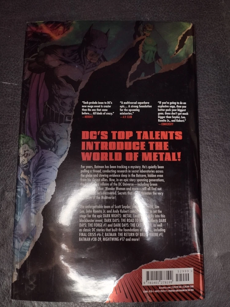 Experience the gripping narrative of "Dark Days: the Road to Metal" from DC Comics, published in July 2018. This compelling comic book features a stellar team of artists and writers, including Scott Snyder and Greg Capullo, who bring to life a dystopian future where superheroes struggle to save humanity. With an all-star cast of characters, such as Batman, Superman, and Wonder Woman, this graphic novel is a must-have for any comic book enthusiast. Delve into a world of intrigue and action with "Dark Days: the Road to Metal" as it takes you on a journey through a modern age storyline filled with adventure, heroism, and darkness. This US Comics tradition is presented in English and is perfect for collectors and fans alike. Get your copy now and join the superhero teams of the Justice League of America and the Teen Titans as they fight to protect the world from formidable villains.