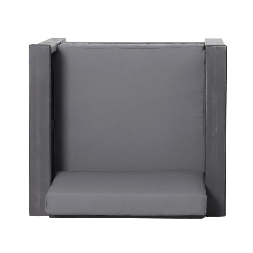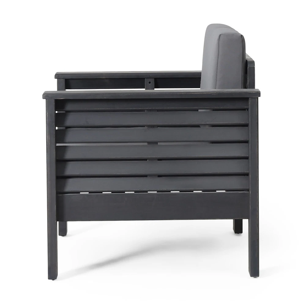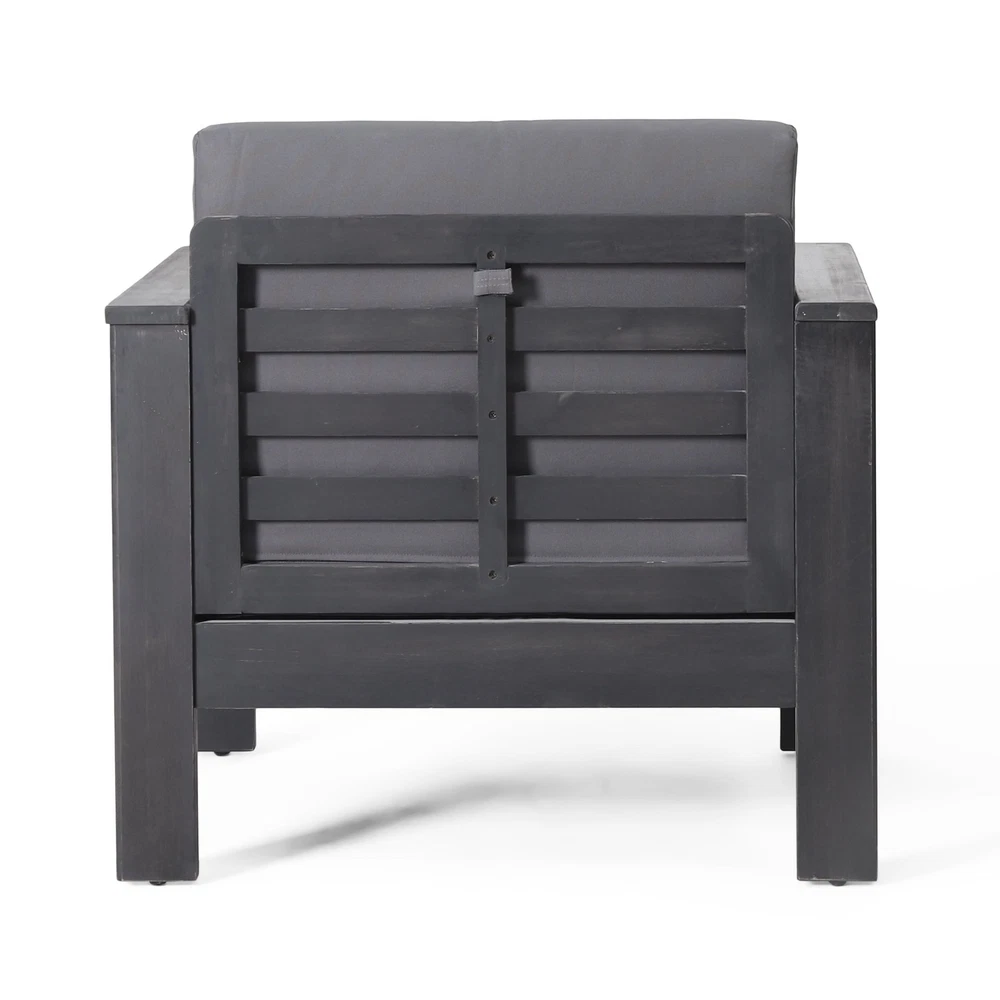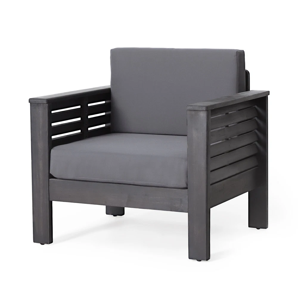 Specifications Place of Origin Viet Nam Main Color Grey Main Material Acacia Wood Filler Foam Cushions Included Yes Dangerous Goods #dangerFlag# Dimensions & Weights Assembled Length (in.) 32.00 Assembled Width (in.) 27.75 Assembled Height (in.) 27.75 Weight (lbs) 39.68 Product Features ACACIA WOOD: Made with acacia wood that brings a sleek and exotic look to your space, this durable hardwood naturally withstands outdoor elements and will not darken over time. Acacia wood is perfect as a solid, heavy frame that resists wear and tear. WATER-RESISTANT CUSHIONS: Our cushions are covered with a non-porous material that makes cleaning any spill a breeze. Please note that these cushions are water-resistant and not waterproof. Please do not submerge in water. SLAT DESIGN: The seating features beautiful shutter-styled paneling, giving this set a sophisticated, classic look. This matches perfectly with a variety of decor, offering a wonderfully homey feel to any space. DIMENSIONS: Choose an accessory that is the perfect size for you and your furniture. Each chair is 32.00” W x 27.75” D x 27.75” H. You will love how much your space can transform with the simple addition of this charming chair set. ASSEMBLY REQUIRED: Some assembly is required for this club chair set. All of the instructions and tools needed for assembly are included. Description Imagine how relaxing it is to enjoy the chairs with your family and friends in the pool, , balcony, garden, backyard, porch, deck, and poolside. These chairs have very simple assembly, all you need to do is 6 easy steps. Comfortable Seating The cushions of the chair use a high-density foam to give you a comfortable sitting feel. Water-Resistant Cover Water-resistant covers are added to our cushions for maximum protection. Easily unzip them for washing or replacement if de