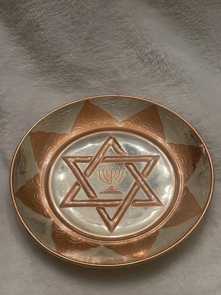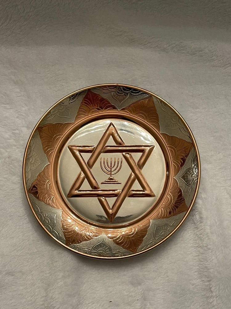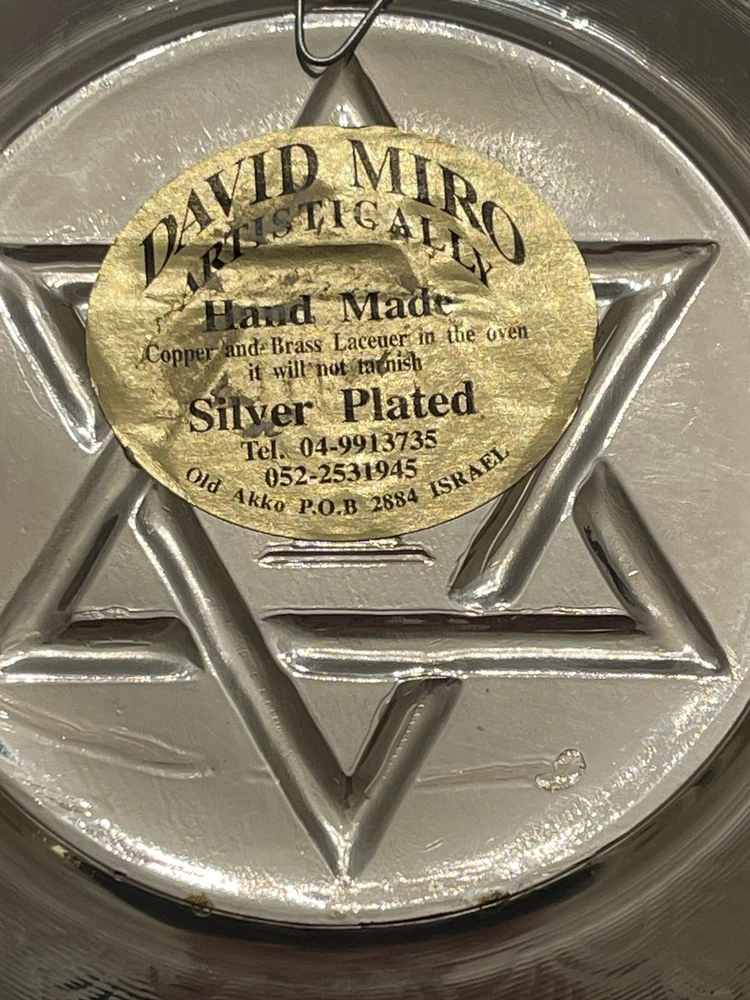 Copper artwork, silver plated, lacquer coated, and baked in the oven. Manufacturer claims that this will not tarnish. Handmade by David Miro and his sons in the city of Acre in Israel. Measures 6" across.