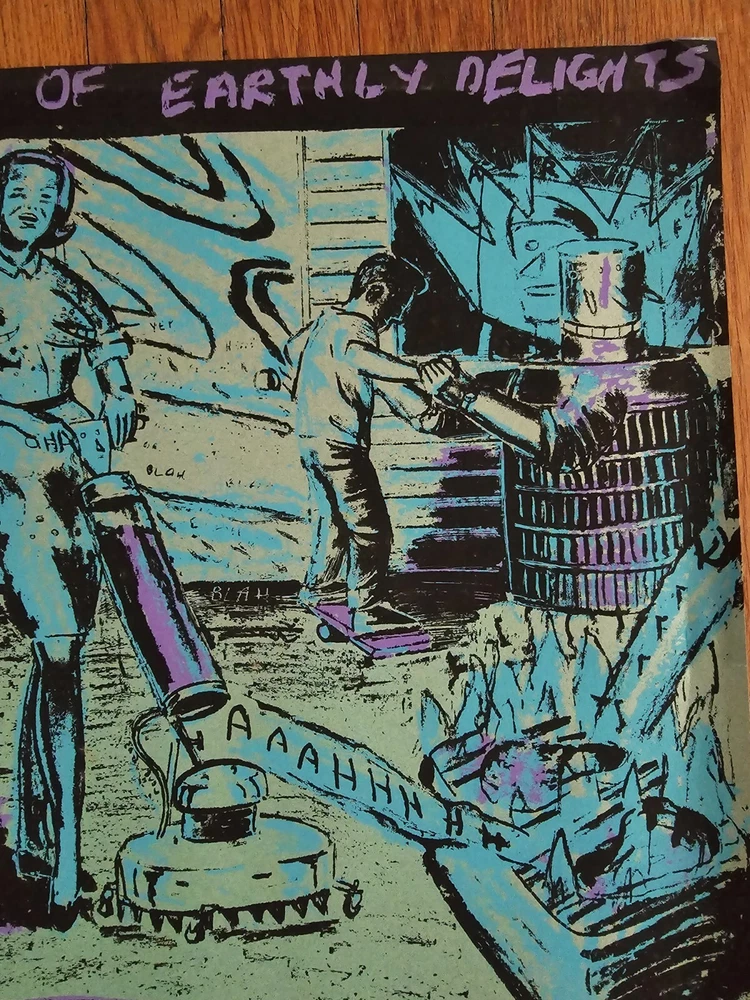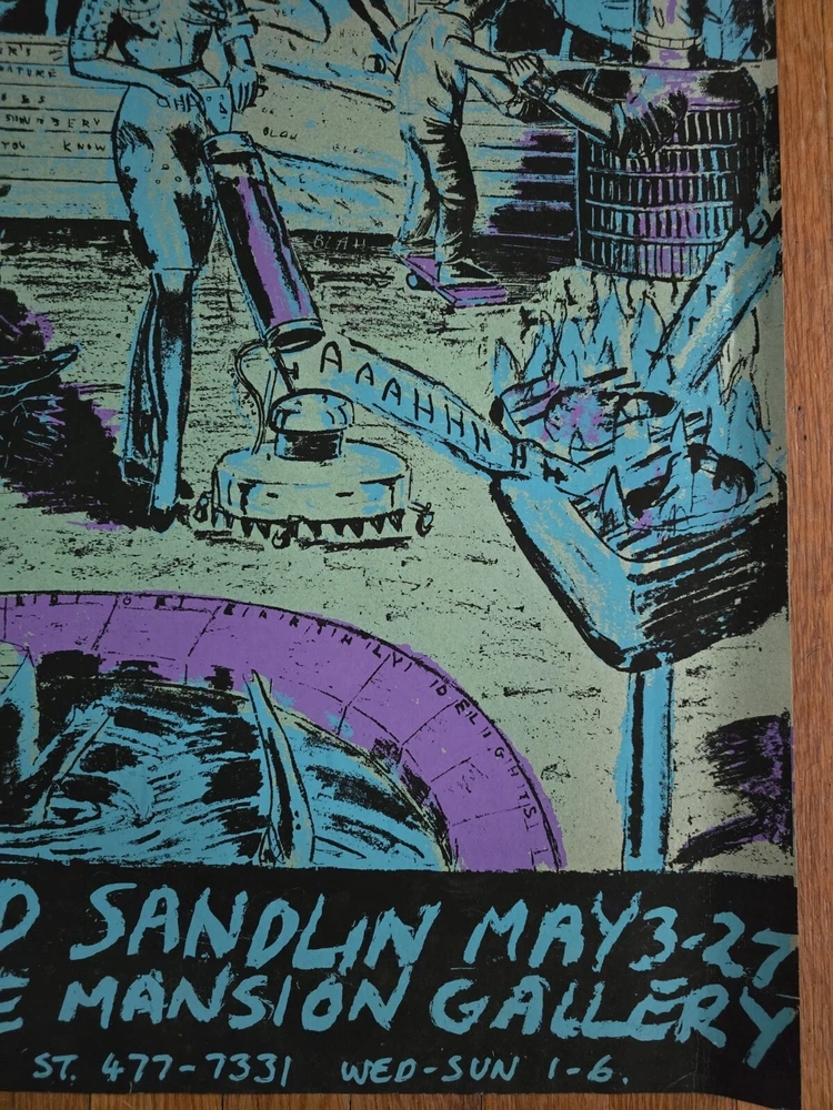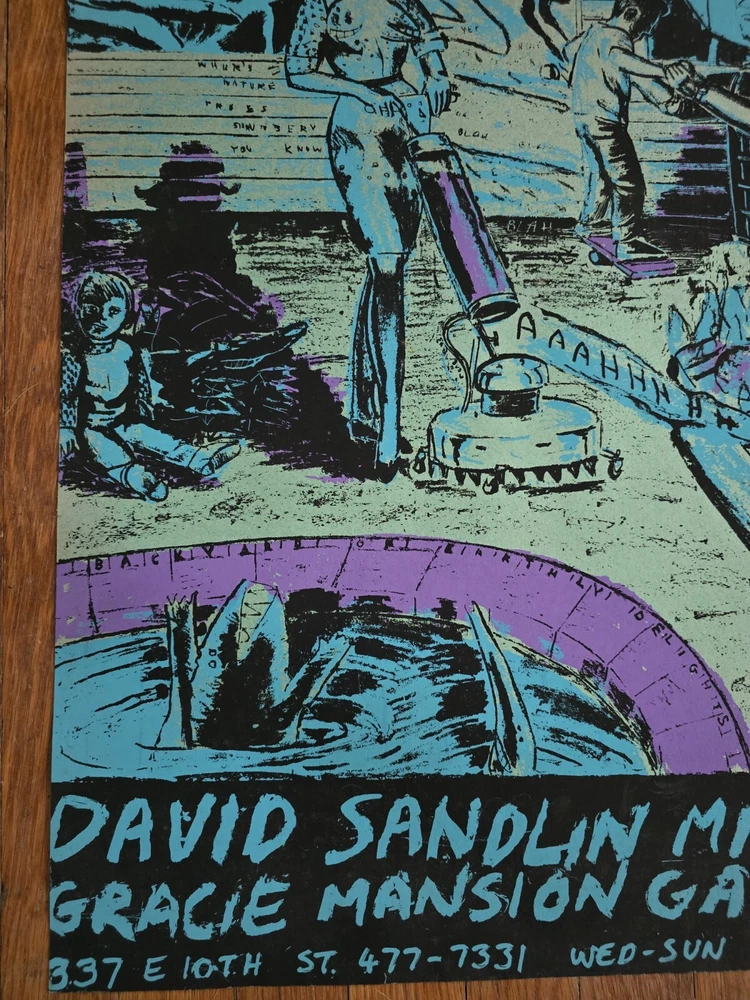 DAVID SANDLIN Art Show Announcement Original Silkscreen Print Poster "Backyard Of Earthly Delights" Gracie Mansion Gallery 337 E. 10th St., East Village, New York, NY circa 1985 24"high x 18"wide 3 colors silkscreened on ochre colored matt paper. Condition: Excellent/Near Mint. This print has not seen the light of day for 30 years. It's been safely stored in a print portfolio, never displayed. Colors are vibrant, no tears, foxing, pin holes or tape marks. Minor creases to lower corners left and right as shown in photos. Provenance: Gracie Mansion Gallery c.1985 See photos for exact item condition. Check out our ebay store for more rare and rad collectibles!
