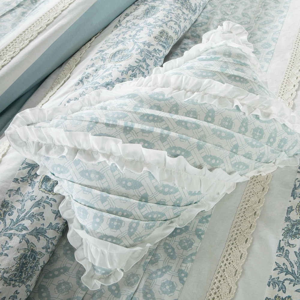 PRODUCT FEATURES- A mixture of soft blue, periwinkle, and hints of green are printed in a paisley design alongside pintucked blue fabric that is separated by lace taping. This duvet set has shabby chic and ruched pattern. SUPERIOR QUALITY FABRIC- 100% Cotton sateen front and cotton pecale reverse to offer 100% natural soft hand feel PACKAGE AND MEASUREMENTS- 1 Duvet Cover:90x90", 2 Shams:20x26 + 2" (2), 3 Decorative Pillows:16x16"/12x18"/18x18" , 2 Euro Shams:26x26" (2) , 1 Bed Skirt:60x80 + 15" YOU CAN SEE AND FEEL LUXURY : Create a welcoming environment and a restful feeling in the bedroom with this top quality and affordable bedding Collection. You’ll find yourself getting a restful night of sleep with our 100% cotton duvet set EASY CARE- Machine wash cold, gentle cycle, and separately. Do not bleach. Tumble dry low, remove promptly. Do not iron. If there is no free movement in the washer or dryer, use large capacity commercial washer/dryer