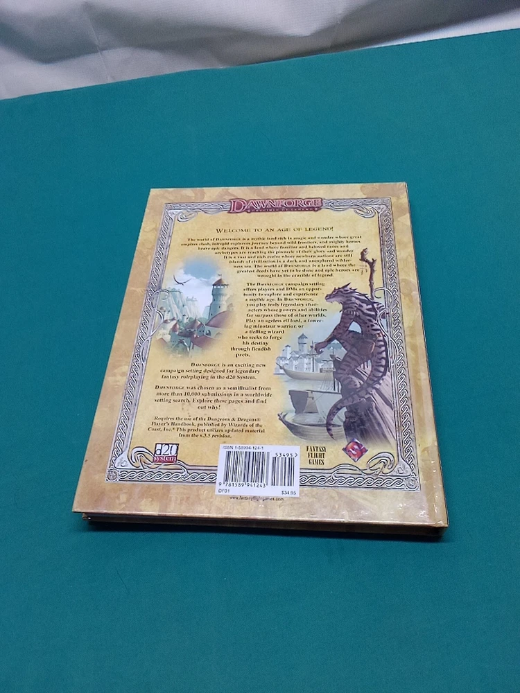 "DawnForge Crucible Of Legend" is a fantasy adventure game set in an age of legend, utilizing the D20 system. Players can immerse themselves in a world of magic, myth, and heroism, embarking on epic quests and facing challenging foes. This role-playing game offers a rich and engaging experience for fans of fantasy and storytelling. Slight water staining on inside corner please see picture for better details also missing insert