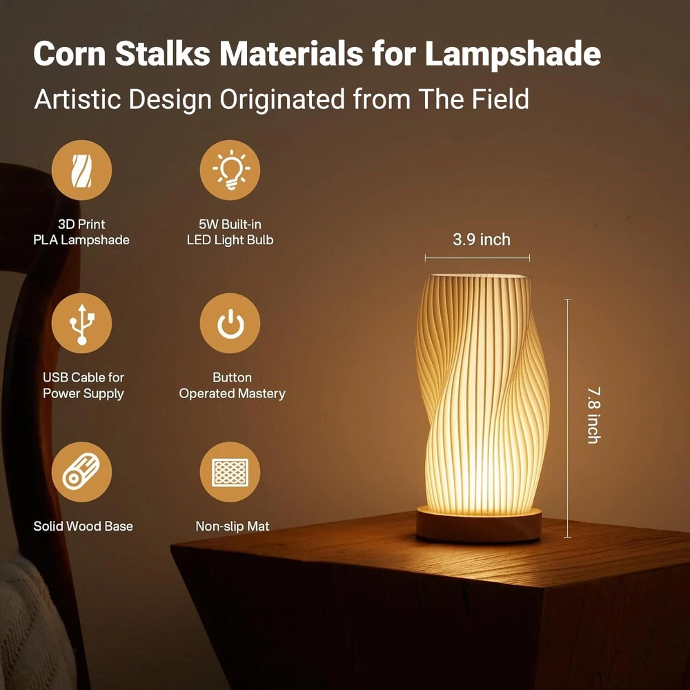 Dawnwake LED table lamp, a perfect blend of elegance, functionality, and eco-friendliness. With its solid wood base and mesmerizing 3D printed lampshade, this lamp stands out as a stunning centerpiece in any room. It offers adjustable lighting options with 3 color choices and 9-level brightness adjustment, allowing you to create the perfect ambiance to suit your mood. The button-operated mastery ensures effortless control, while the non-slip mat provides stability and safety. With its built-in energy-saving LED bulb and eco-friendly PLA lampshade, this lamp not only saves energy but also promotes sustainability. With a durable lifespan of more than 25,000 hours, this lamp promises enduring performance. Illuminate your space with style, versatility, and environmental consciousness with our remarkable table lamp. 【Adjustable Lighting to Suit Your Mood】Customize the lighting ambiance with 3 color options and 9-level brightness adjustment. Whether you desire a warm and cozy atmosphere or a bright and vibrant setting, this table lamp offers versatility to match your mood. Meanwhile, it has a memory function that remembers your last brightness and color setting, saving you the hassle of readjusting it every time. 【Mesmerizing 3D Printed Lampshade】The lampshade features intricate patterns and designs created through 3D printing technology, making it a captivating centerpiece. Enjoy the visual appeal of the unique and artistic lampshade, which adds a modern and creative touch to your room. 【Corn Stalks Materials】Our lamps are masterpieces inspired by nature, with each creation starting from the cornfields. We primarily use corn stalk material for our lampshades, a new and material that reduces the burden of traditional plastics on the environment. Through advanced technology, we transform discarded corn stalks into durable 3D printed materials, giving our lamps a unique texture and natural hue, making each one a work of art. And each lamp is meticulously smoothed for 8 hours before it reaches your hands. 【Convenient and User-Friendly Features】Effortlessly control the light with the button-operated mastery, providing ease of use and convenience. The non-slip mat ensures stability and prevents the lamp from sliding or scratching surfaces, offering added safety. With its USB cable for power supply, this table lamp offers flexibility and convenience. Simply plug it into a USB port on your computer, power bank, or any USB-enabled device, and enjoy the illuminating experience wherever you desire. 【Durable and Long-lasting Performance】Crafted with a solid wood base, this table light exudes natural elegance and adds a touch of sophistication to your space.The high-quality wood material ensures durability and complements various interior styles.With a lifespan of more than 25,000 hours, this table lamp is designed for longevity, offering reliable and enduring lighting for extended periods.