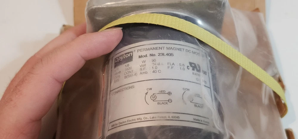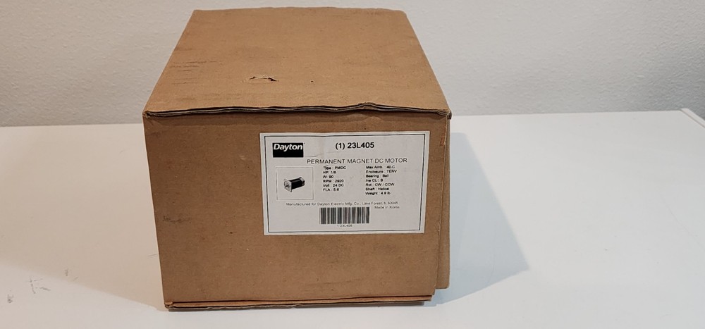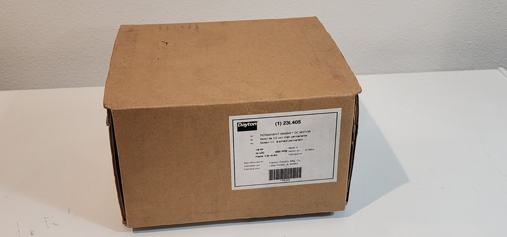 Dayton 23L405 Permanent Magnet DC Motor, 1/8 HP, 2920 RPM, 24VDC New Open Box All indications are this is new in open box. Please review photos. Usually ships next business day from Albany, Oregon.